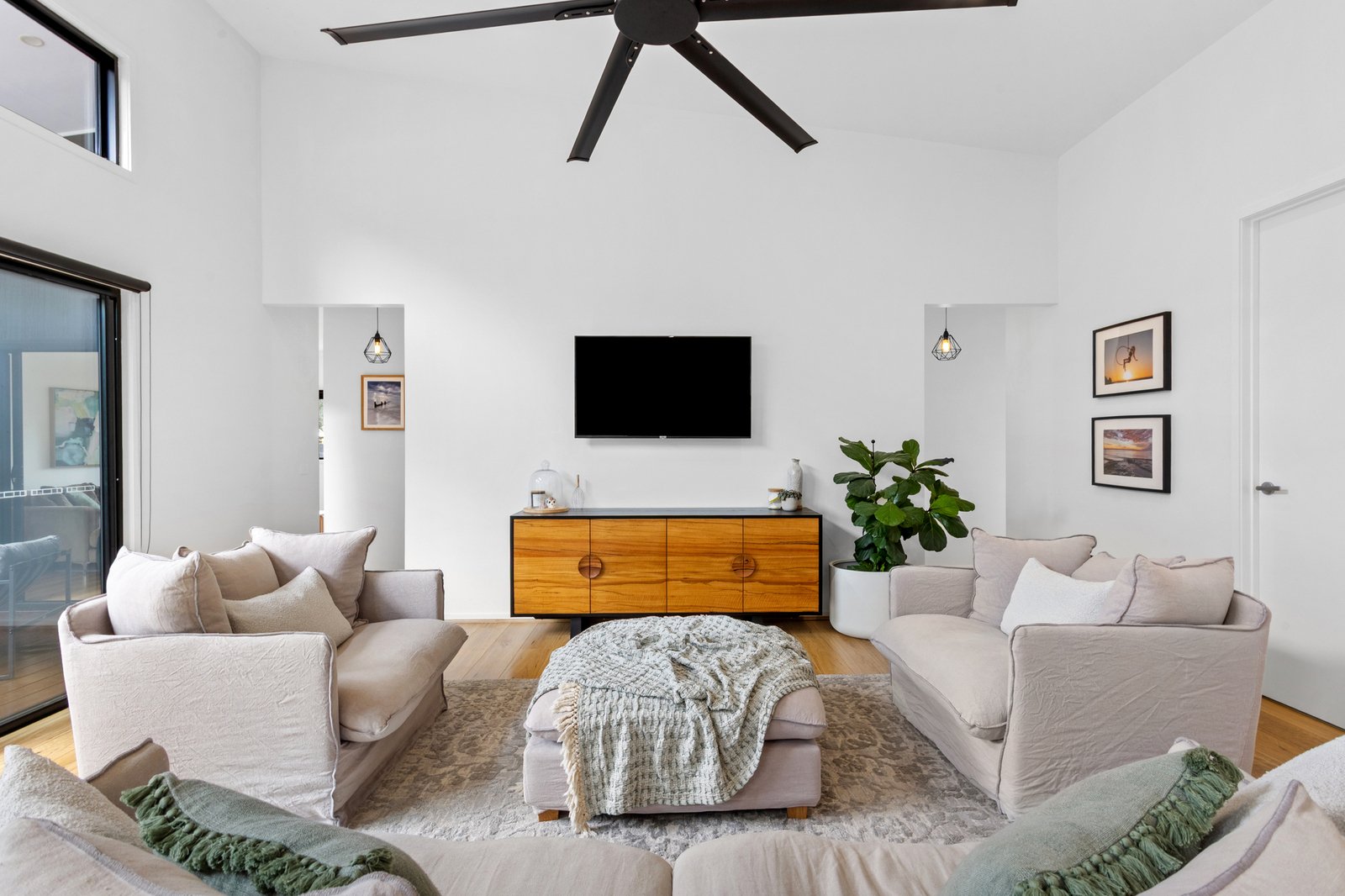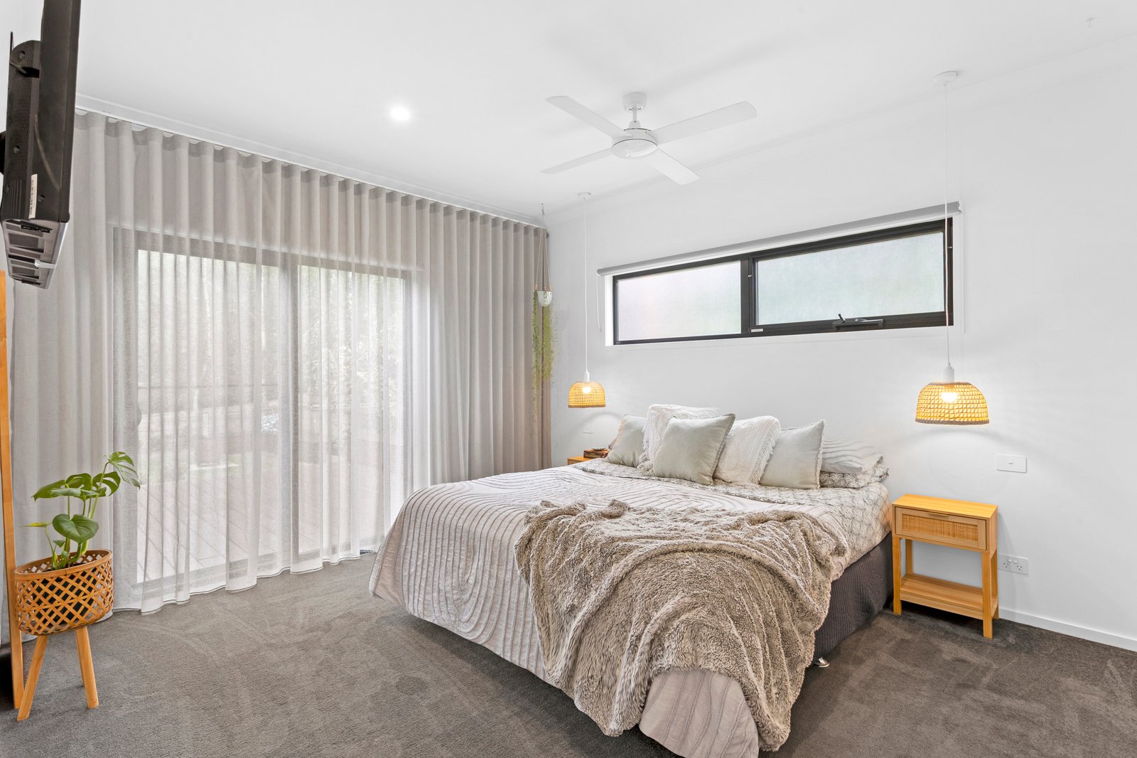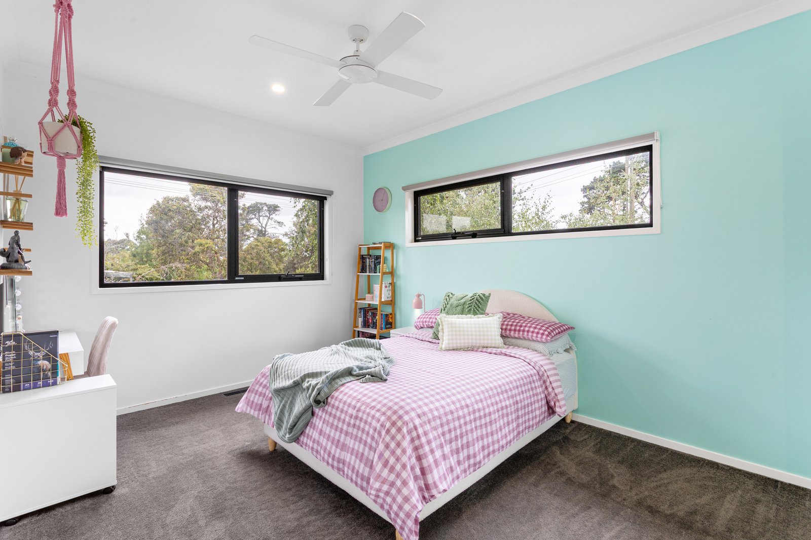 Set alongside the primary suite with a walk-through robe, linen sheer curtains, ensuite and deck access, a secondary living zone creates a quiet refuge for parents or children. Three robed bedrooms are grouped around the main bathroom, all finished with plush carpet.