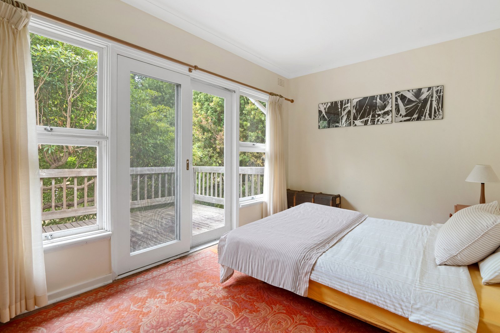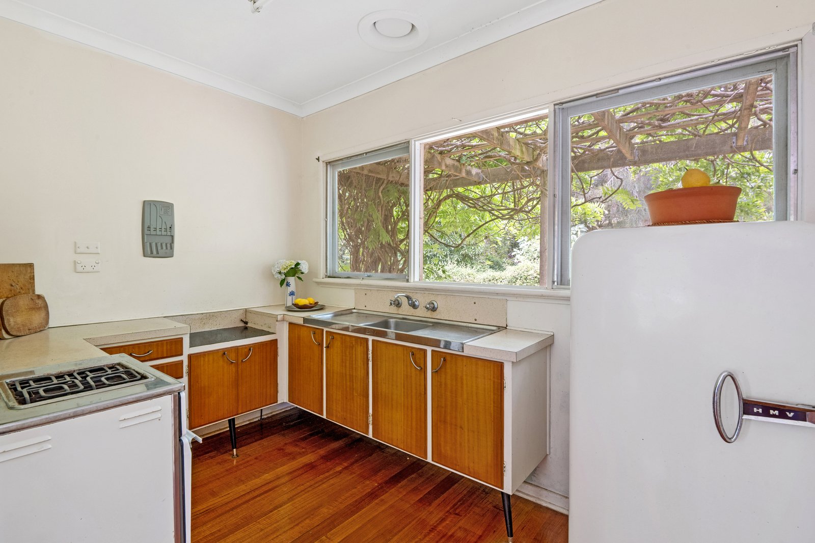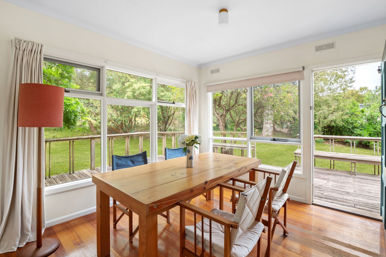 Retaining its original joinery and pared-back proportions, the retro kitchen looks out to a wisteria-draped pergola and across the adjoining fireside living room and dining room, where light is drawn through sash windows and multiple timber-framed glass sliders opening to wrap-around deck. Hardwood flooring introduces organic warmth throughout the two-bedroom plus study layout, with the primary bedroom opening directly to the generous deck.