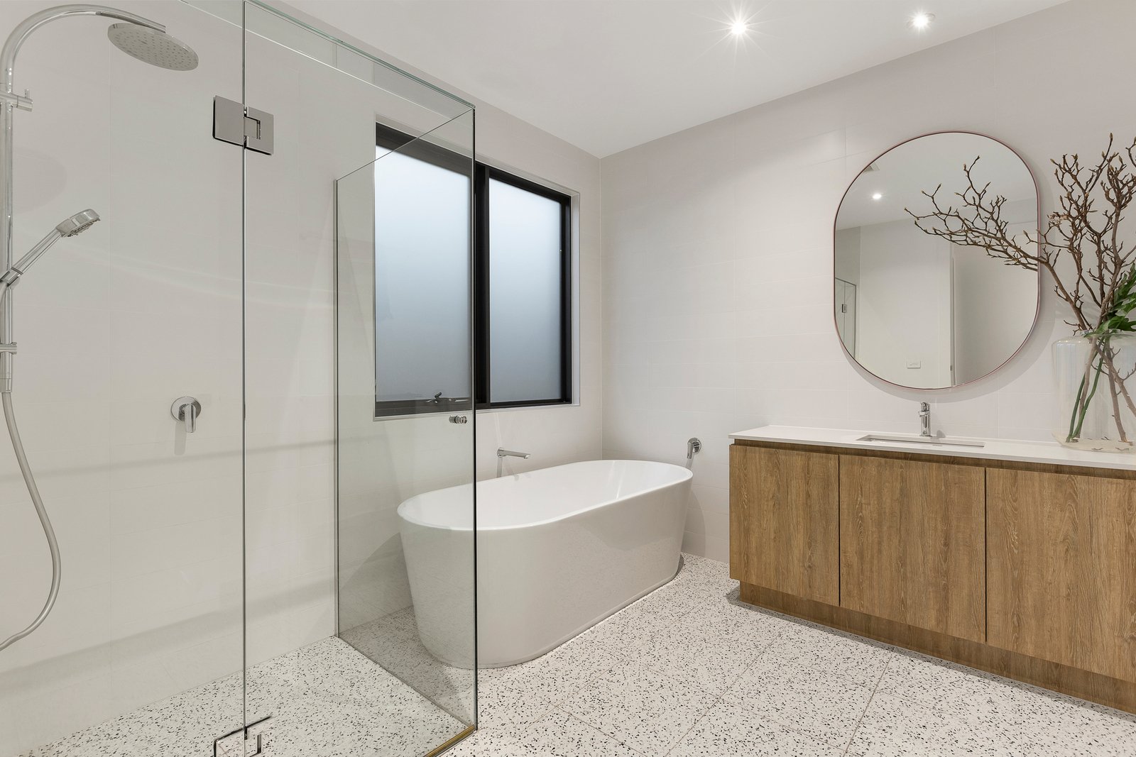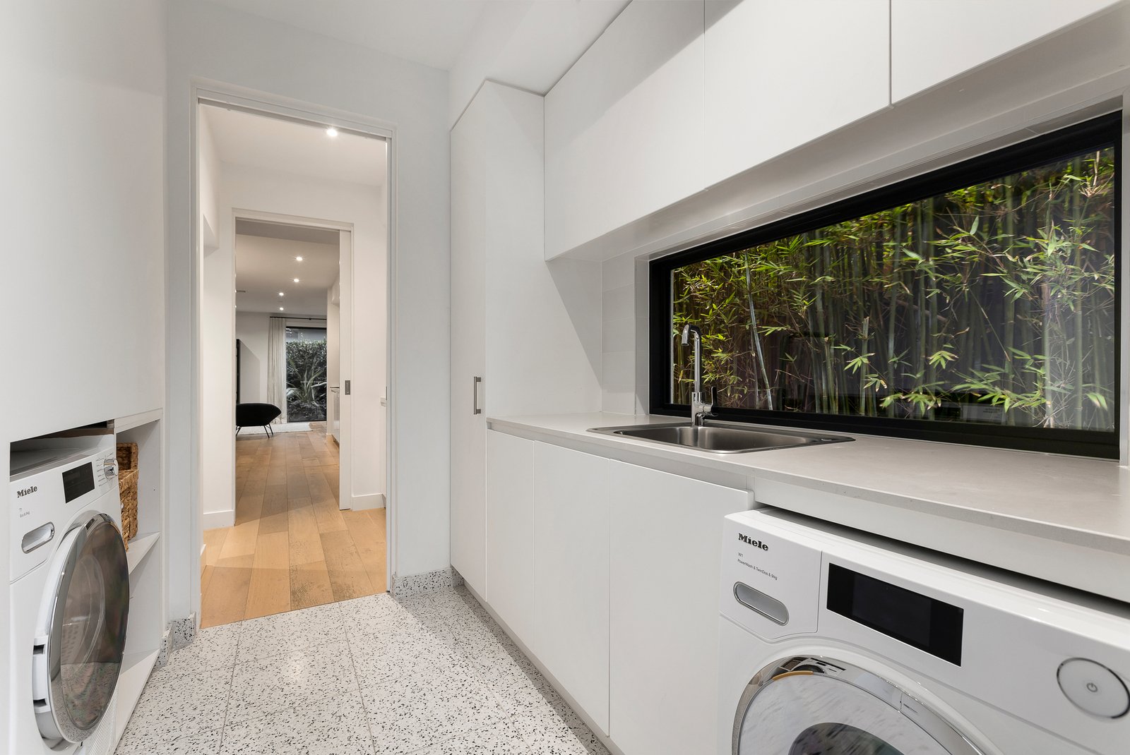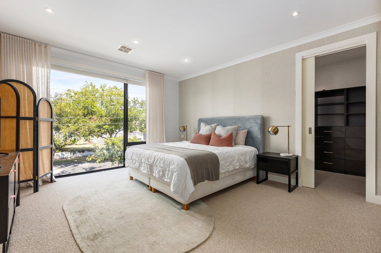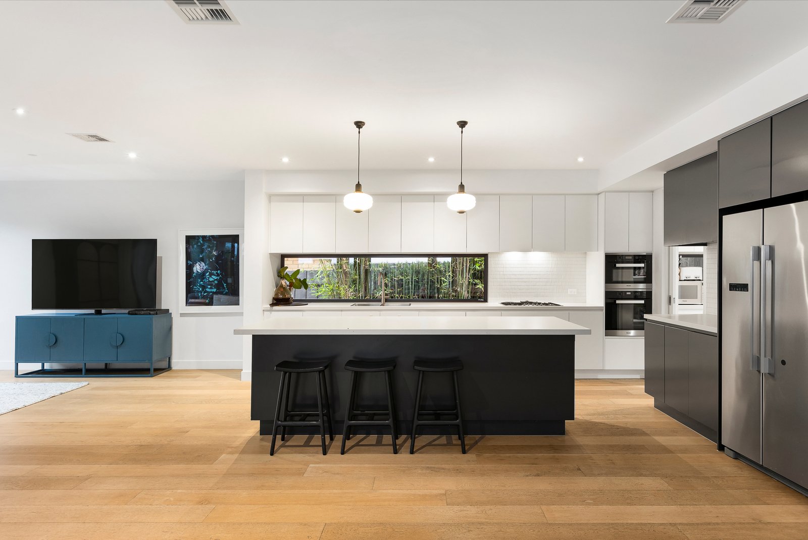 The upper level is zoned to perfection, offering a peaceful retreat and three oversized bedrooms with mirrored robes, served by a family bathroom featuring a luxe freestanding bath and separate WC, ideal for young children and teens alike. The full-length main suite forms a serene parents’ haven with leafy outlooks, a fitted walk-in robe and a designer ensuite flaunting a stone dual vanity and dual-head rain shower.