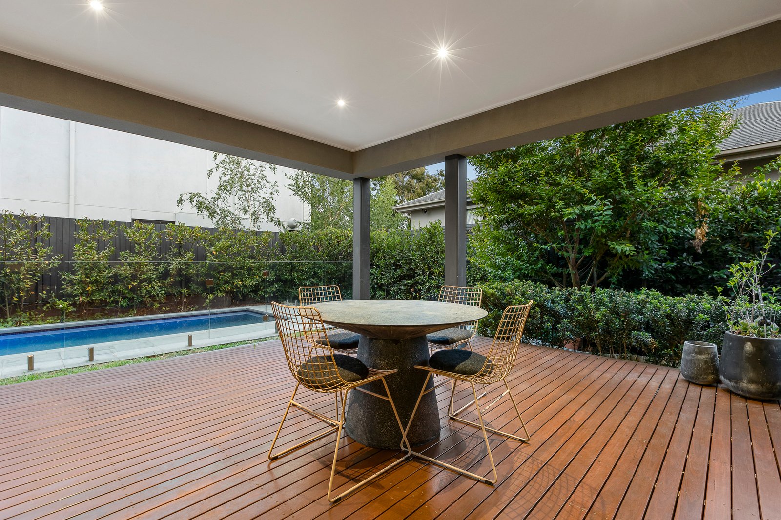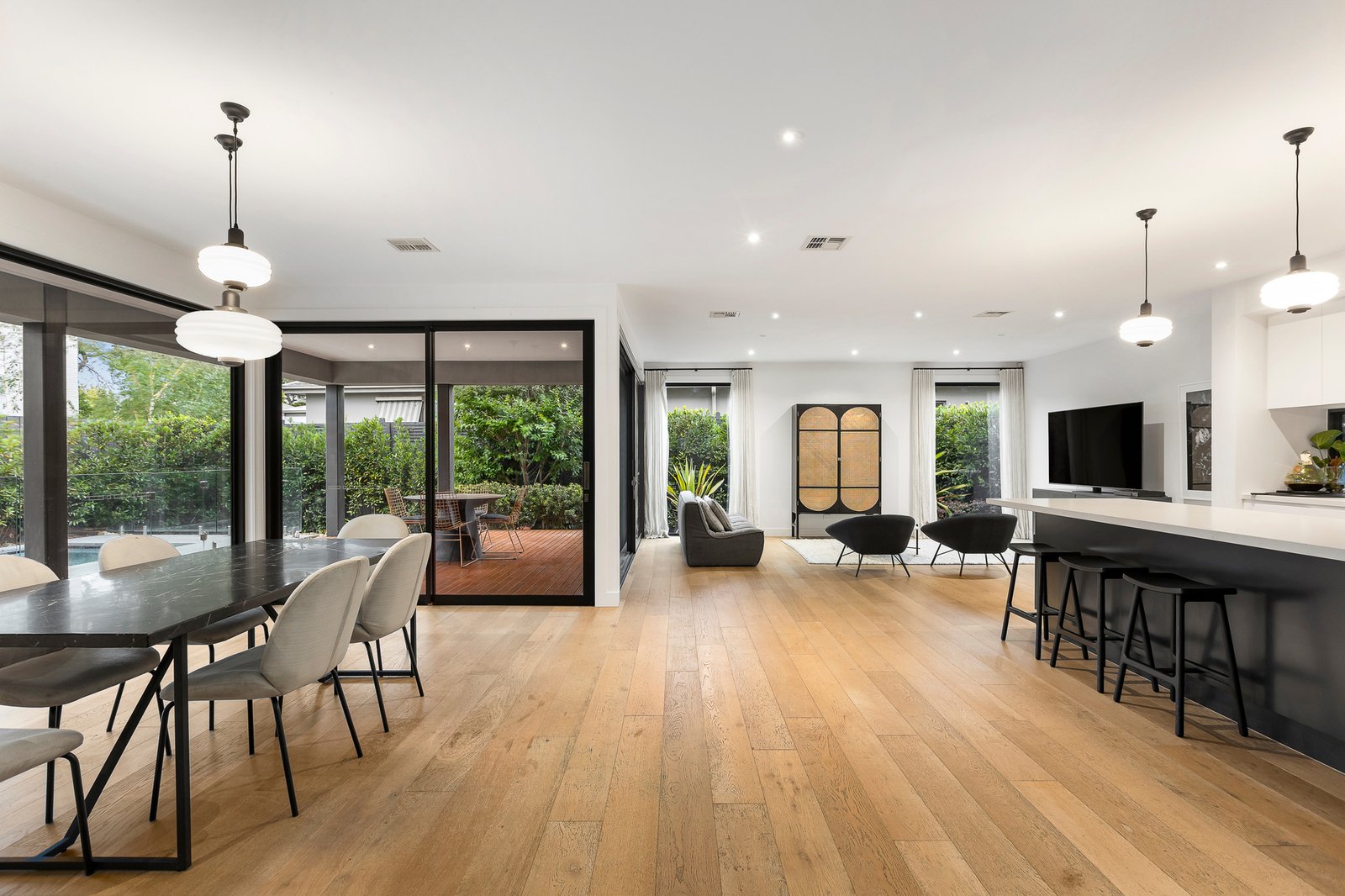 A spacious formal lounge is paired with an expansive living and dining domain, all effortlessly serviced by a fully appointed Miele kitchen featuring a stone island bench, integrated dishwasher and abundant storage, including a butler’s pantry. Entertaining flows outdoors to a covered al fresco deck, surrounded by established landscaping and drenched in day-long sunshine, with the heated pool completing this private, resort-style sanctuary.