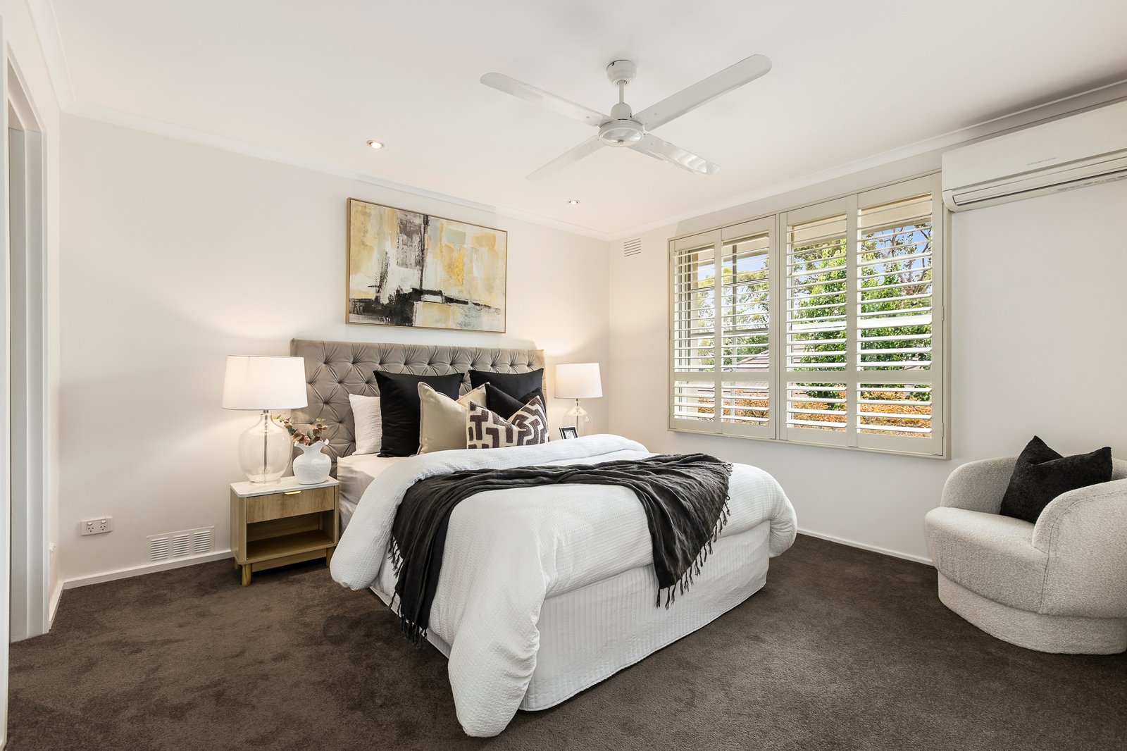 Upstairs continues the bright, airy ambience, with expansive glazing framing the treetop terrace and surrounding greenery. Two generous robed bedrooms, including a main with walk-in robe, split system and ceiling fan, are serviced by a sparkling bathroom with heat light and a separate WC. Freshly painted throughout, the home also includes a study nook beneath the stairs, plantation shutters, split-system heating and cooling, and panel heating for year-round comfort.