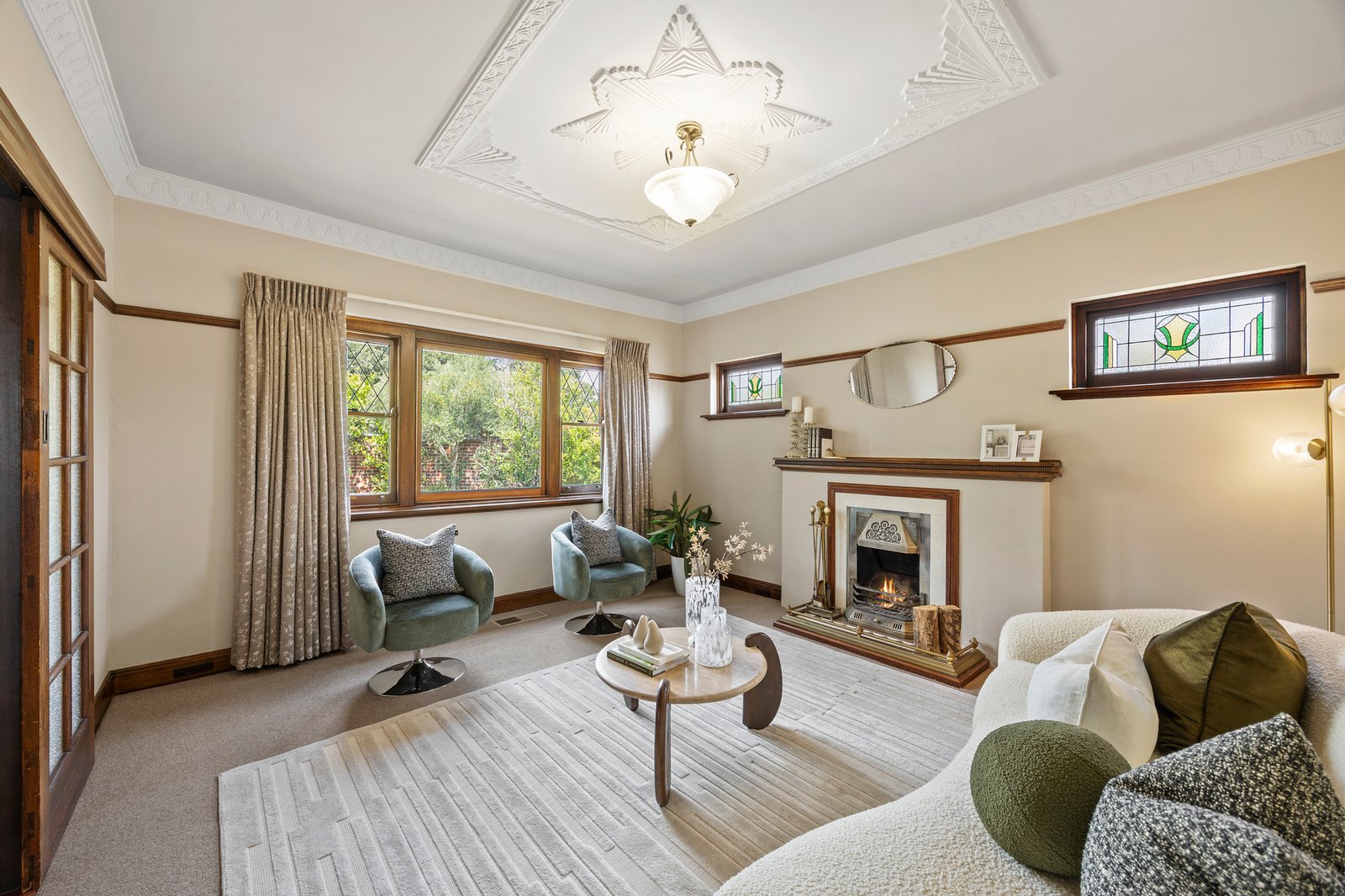 A wide central hallway draws through the home, passing the formal lounge where an open fireplace, picture rails and an ornate ceiling form a superb backdrop for entertaining, with the option to be closed off for more intimate occasions.
