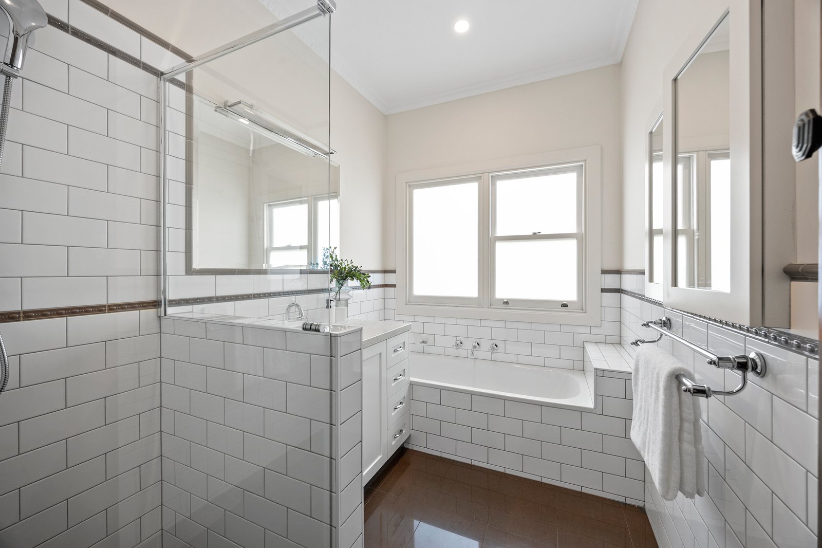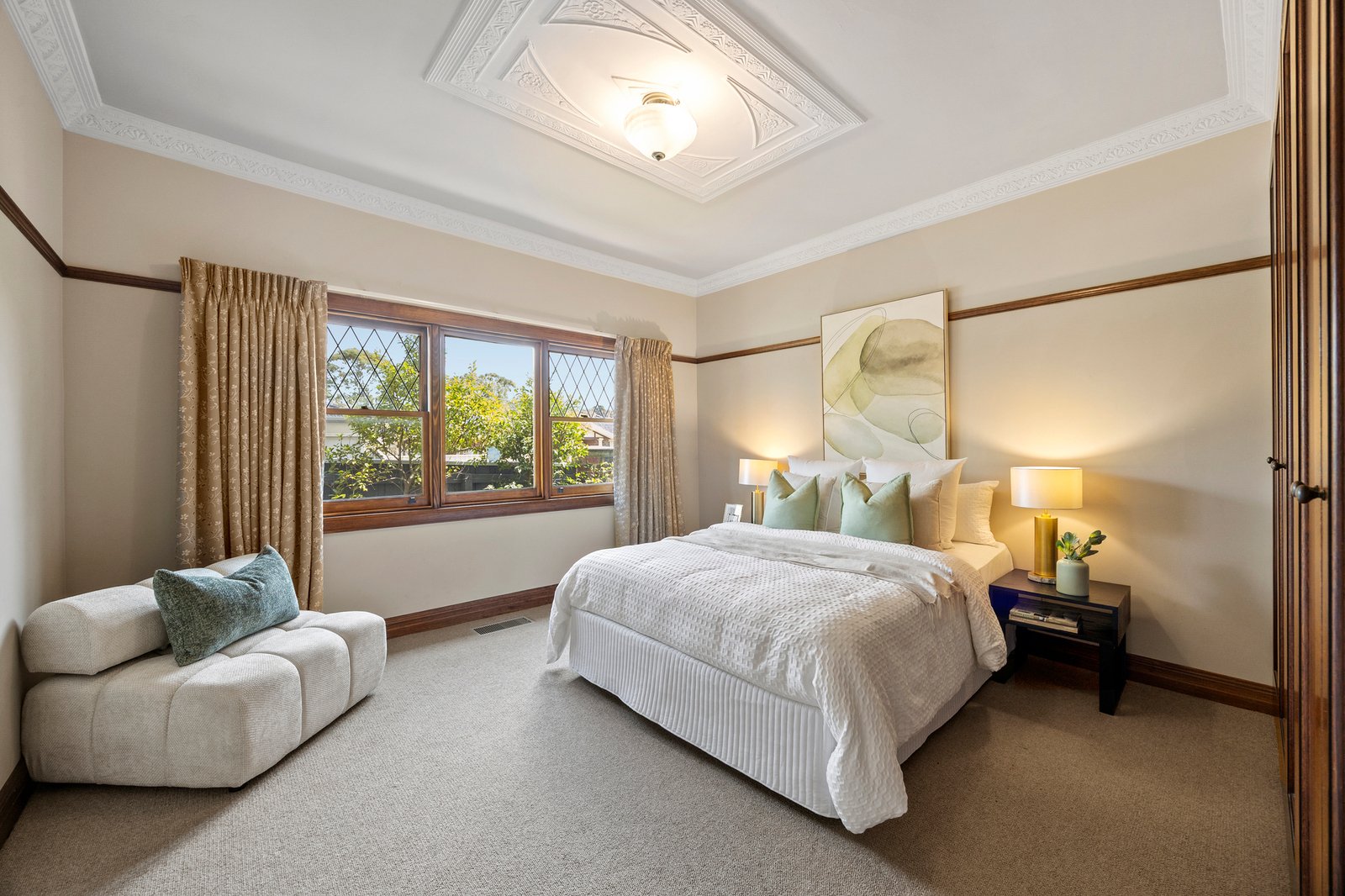 The accommodation is thoughtfully zoned, with all bedrooms enriched by classic Art Deco detailing. Positioned to the front as a serene retreat, the master bedroom features extensive robes, leafy outlooks and an elegantly appointed ensuite. Two further generous bedrooms, each with excellent storage, are served by a central bathroom with bath and shower, while a discreet fitted study nook is cleverly positioned to support work-from-home days without intruding on living spaces.