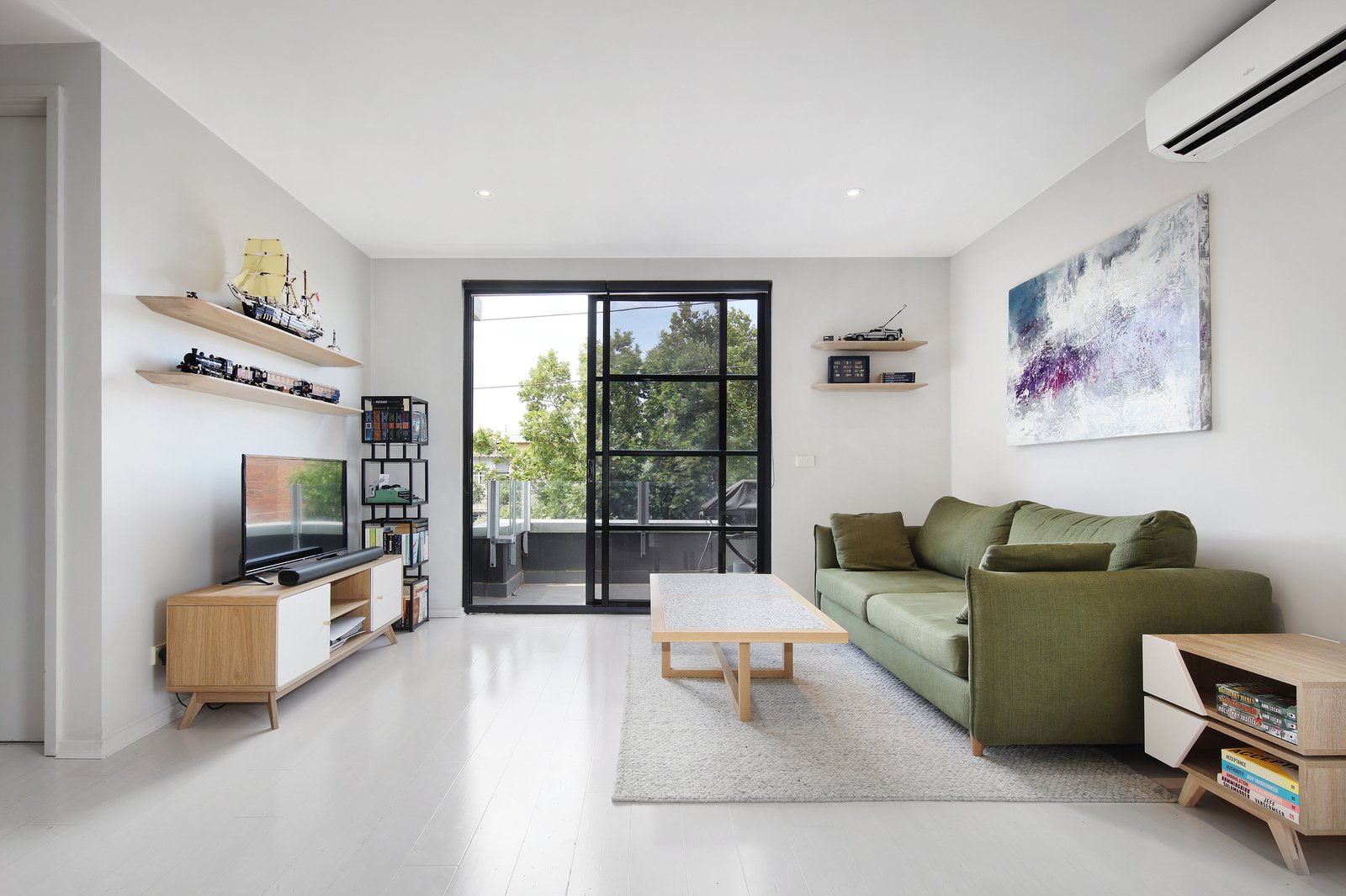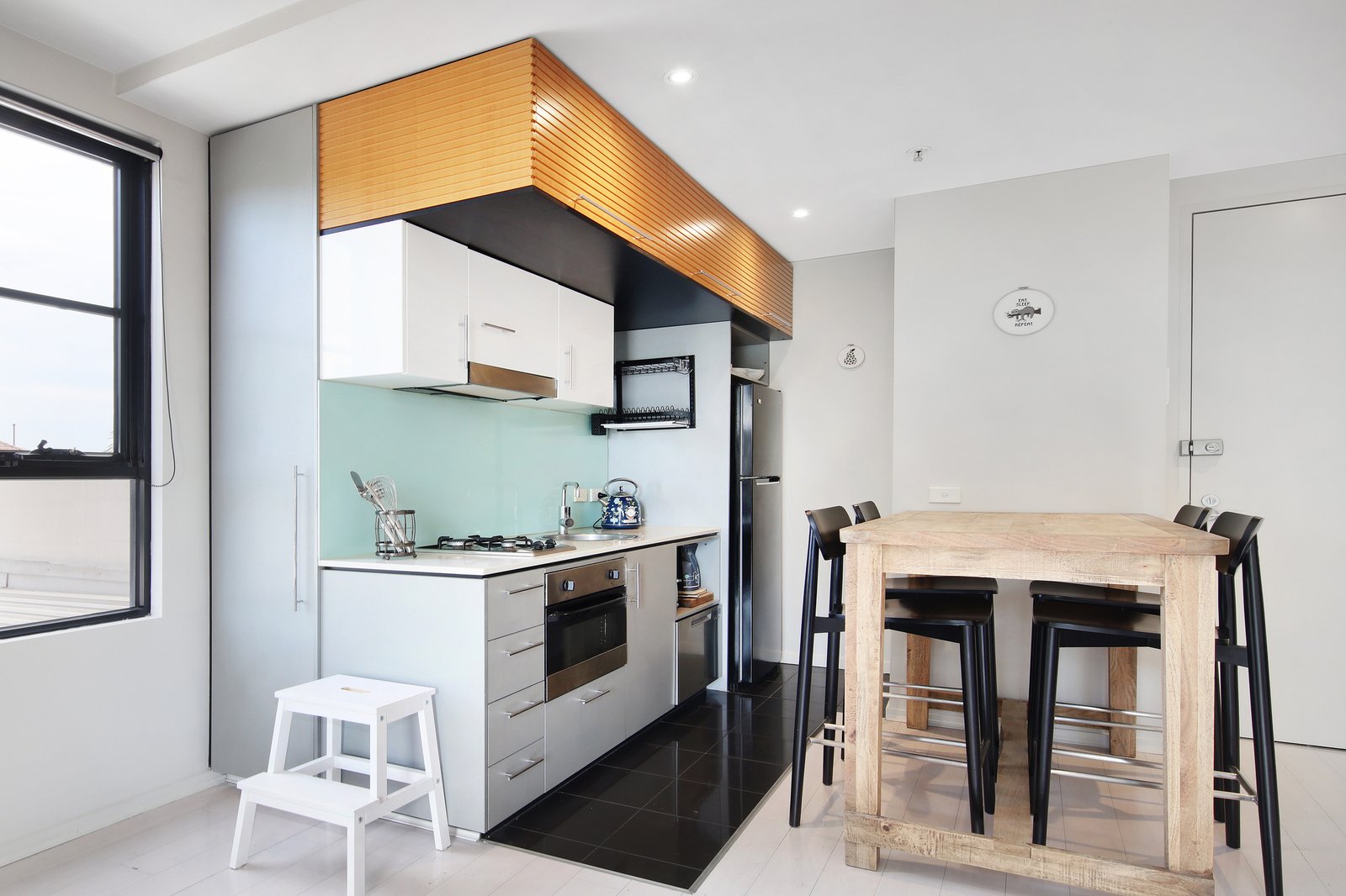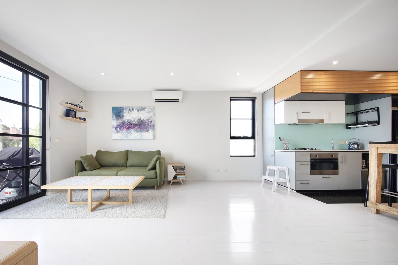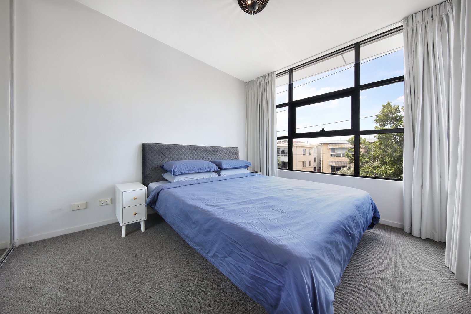 Sophisticated by design with white timber floors and black grid-windows giving a warehouse-style edge, this top apartment stars a sleek Fisher and Paykel appliance kitchen with drawer dishwasher, a stylish bathroom with generous mirror-storage, and more mirrored style for the tall robes of each bedroom.