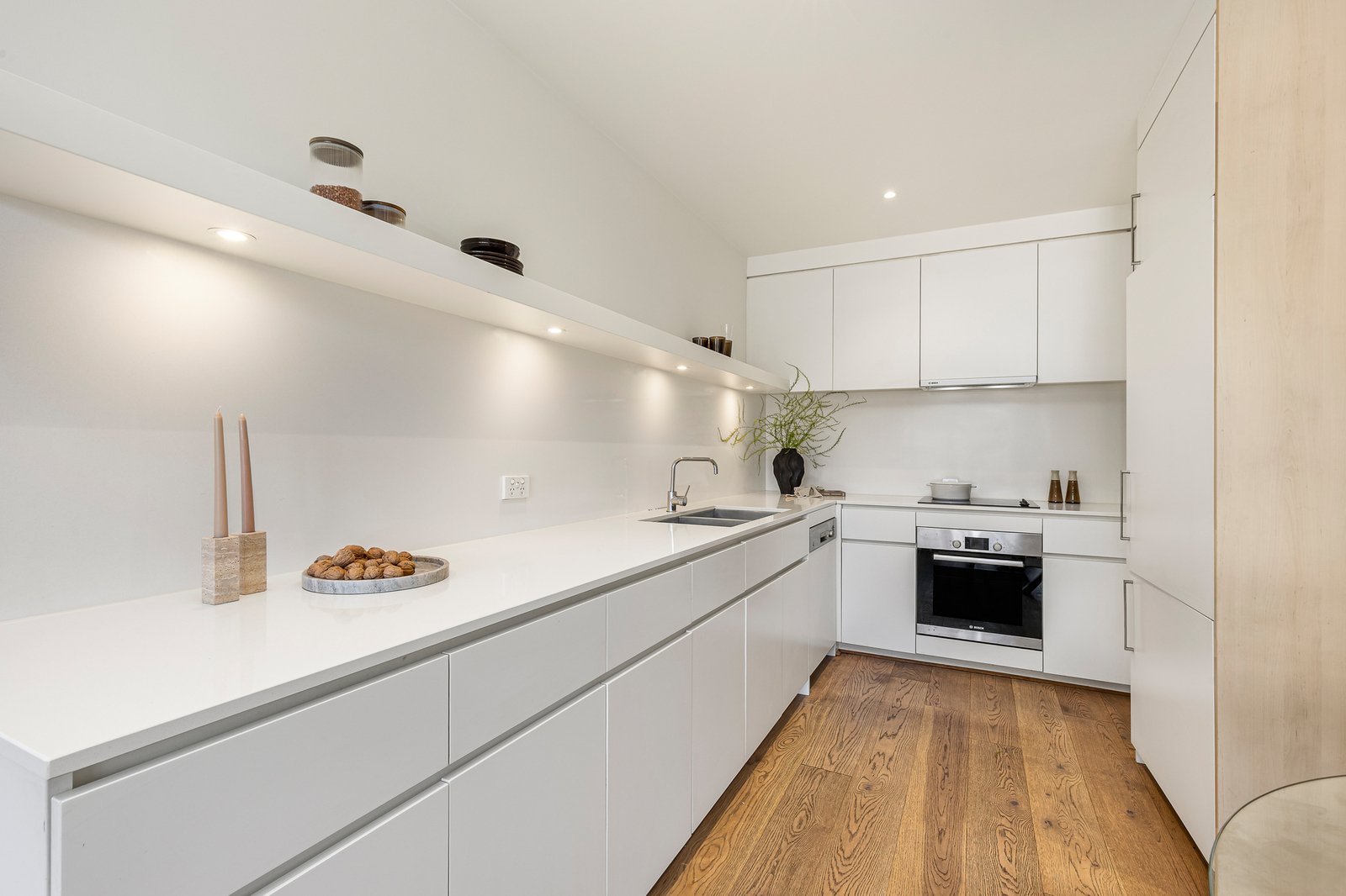 A light-filled open-plan living and dining domain is complemented by floor-to-ceiling glazing and extends effortlessly to a large undercover terrace with street outlook — ideal for entertaining, morning coffee, or relaxed outdoor living year-round. The sleek Caesarstone kitchen is equipped with premium Bosch appliances, including an integrated dishwasher, and offers excellent storage and bench space.