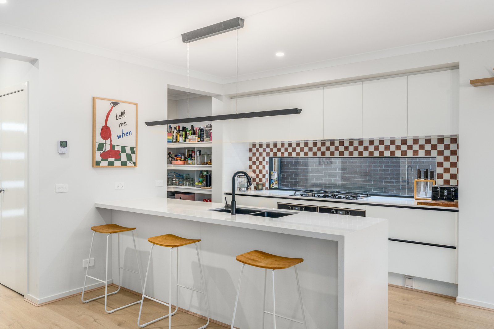 - 2x 600mm electric ovens, dishwasher and gas cooktop.