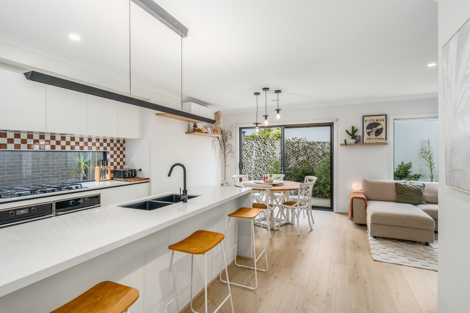 Thoughtfully designed to maximise space, natural light and set across two levels, the home delivers a practical and highly functional floorplan with well-proportioned accommodation and an inviting central living zone that caters to the demands of modern lifestyles. The open-plan design showcases a sharp and sophisticated kitchen with fantastic storage, double ovens and stone surfaces which provides a harmonious connection between everyday living and entertaining. While low-maintenance exteriors ensure more time is spent enjoying the lifestyle on offer rather than maintaining it, the wide frontage allows for off street parking behind swinging gates ideally suiting those with caravans or trailers.