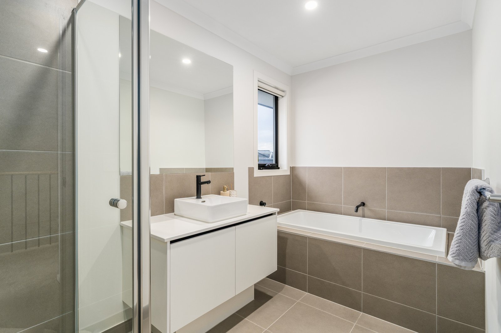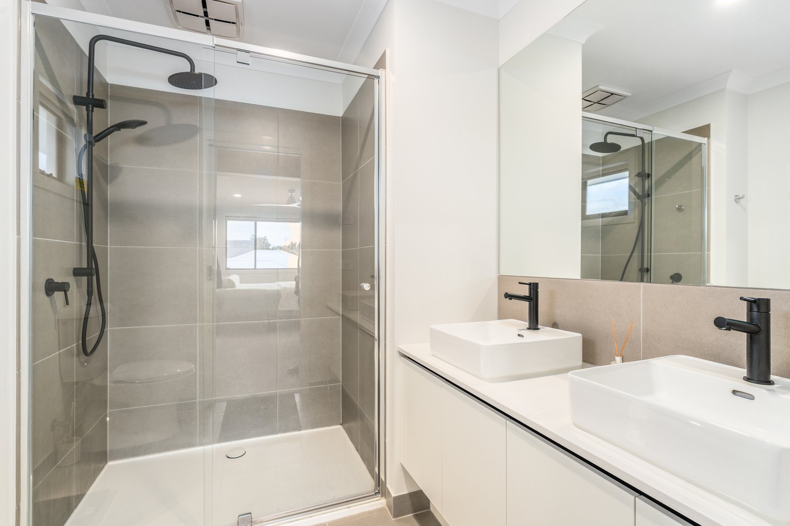 - 40mm Caesarstone waterfall benchtop, 20mm to all bathrooms.