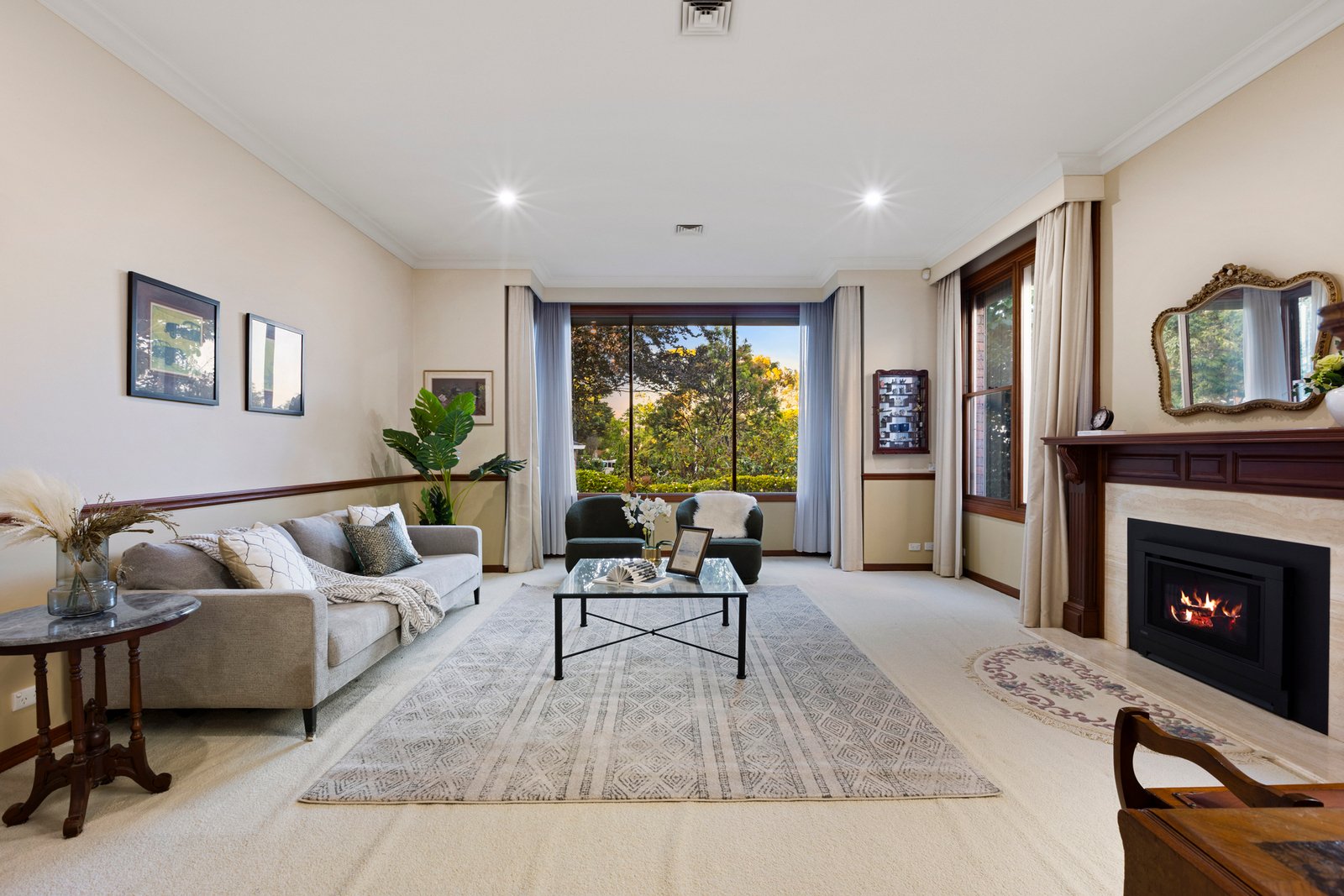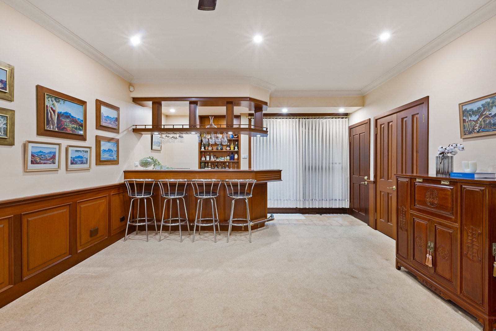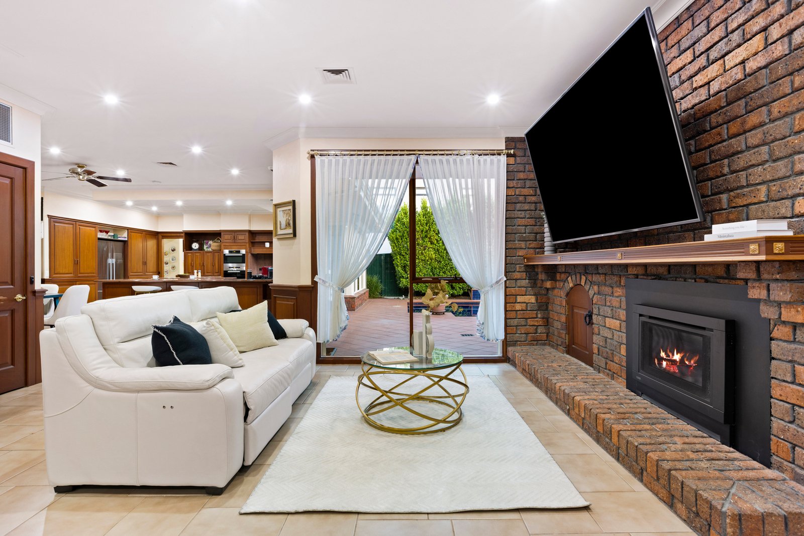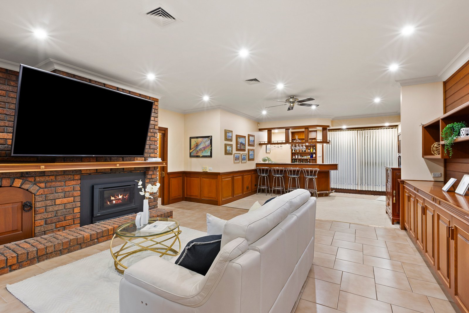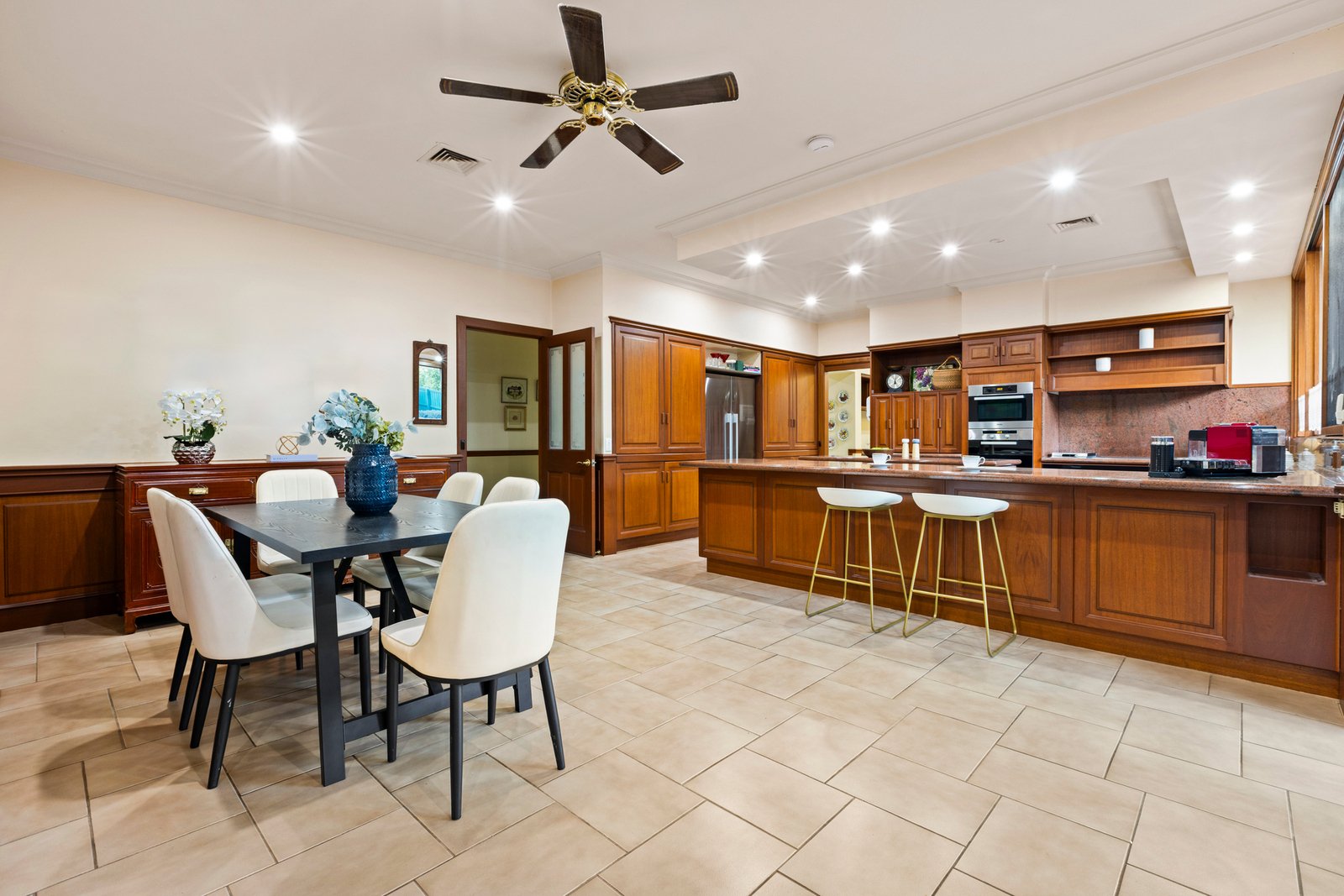 A grand marble-tiled entrance introduces the home, flowing through to a warm and inviting sunken lounge with feature gas fireplace, complemented by an elegant formal dining room. The expansive family and meals zone, complete with a wet bar, is perfectly designed for relaxed living and entertaining.