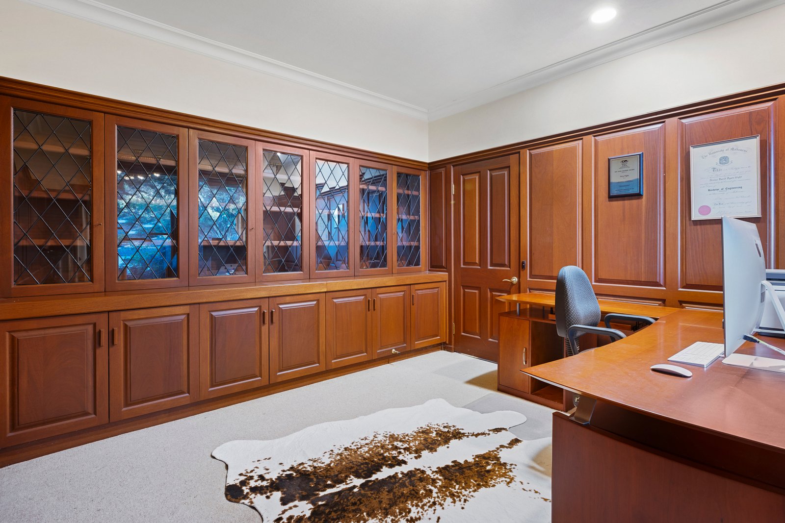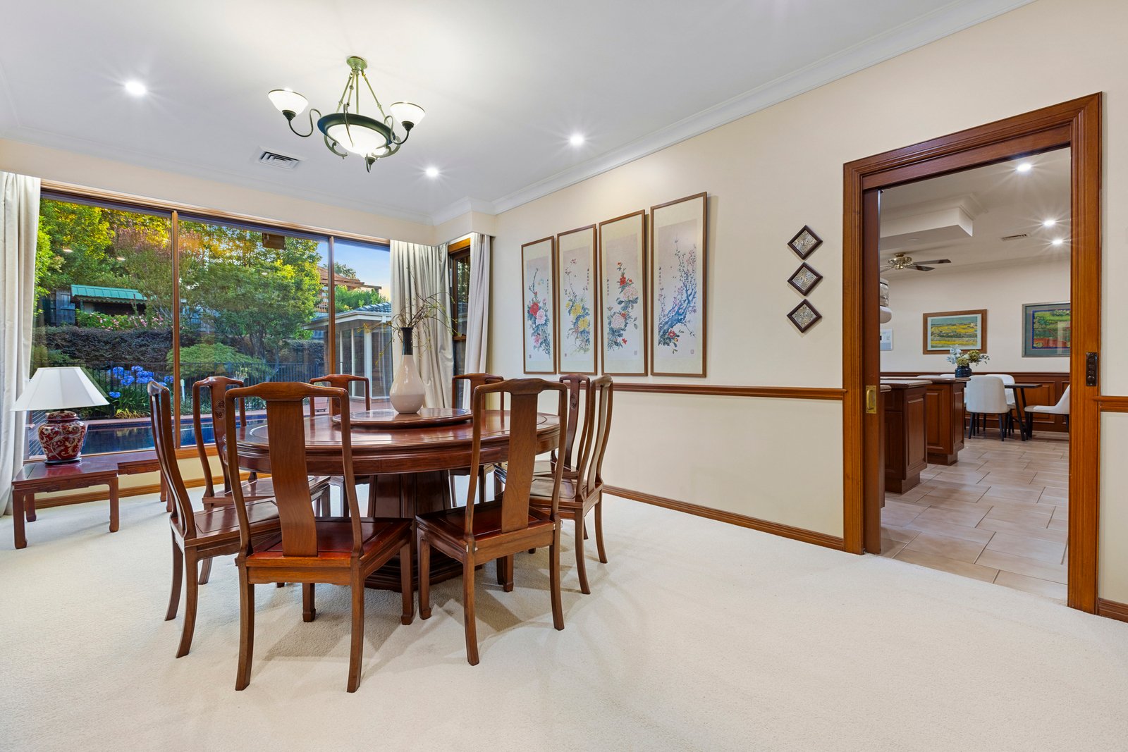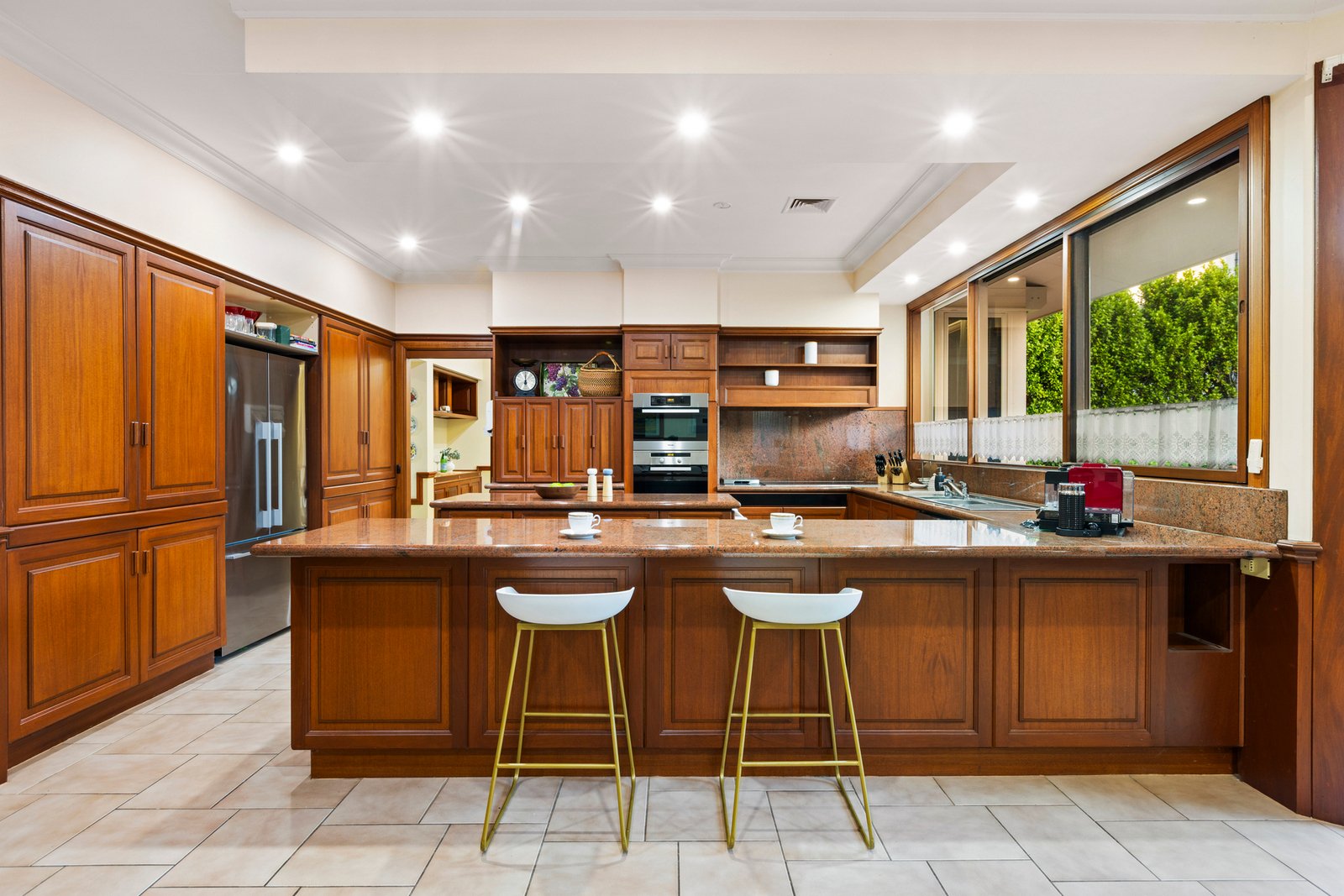 The kitchen delivers undeniable wow factor, showcasing granite benchtops, rich mahogany timber cabinetry and premium Miele appliances, including an induction cooktop, with abundant space for even the most enthusiastic entertainer.