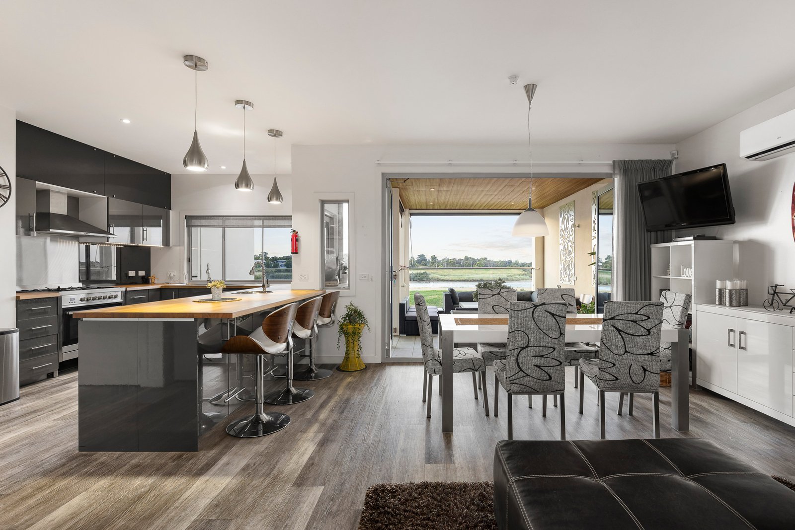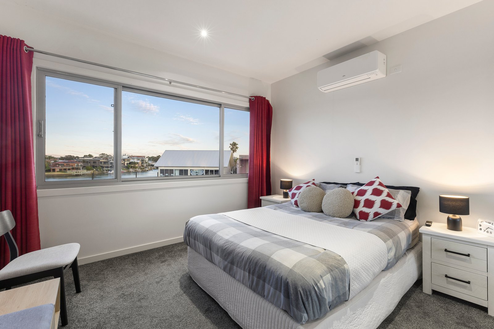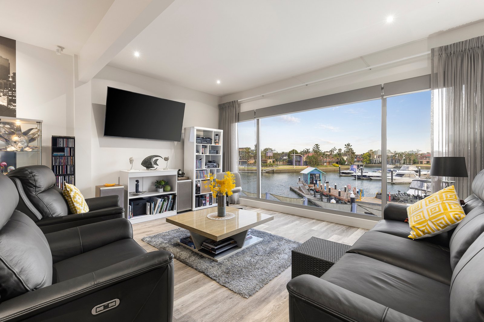 Designed to capture spectacular, uninterrupted river and marina views, this three-storey, four-bedroom entertainer offers 40 squares of absolute waterfront luxury. With its commercial lift, private heated swimming pool and spa, plus a triple-car garage with workshop, this is the ultimate lifestyle property – nestled within an exclusive, secure gated community. The heart of the home unfolds on the middle floor, where expansive open-plan living flows seamlessly through stacking doors to a riverside balcony. Here, breathtaking sunsets paint the sky golden as majestic waterbirds glide past. The large gourmet kitchen features a servery window for effortless entertaining and, when it's time to unwind, retreat to the billiard table and gas-log fireplace, framed by stunning harbour views. The serenity extends to the top floor with three generous robed bedrooms, two luxury bathrooms, and a versatile living area/home office with kitchenette. Wake to magical water views from the riverside bedrooms, or step onto the sheltered balcony overlooking the marina to watch the boating activity. At ground level, discover a huge self-contained fourth bedroom with semi-ensuite bathroom, kitchenette and pool access – ideal for guests or extended family. Premium features include 20 solar panels, video intercom, alarm system, security cameras, exceptional storage throughout and remote triple-car garage. An unbeatable location – you’re within a 10-minute walk of the shopping centre, restaurants, medical facilities, buses and schools.