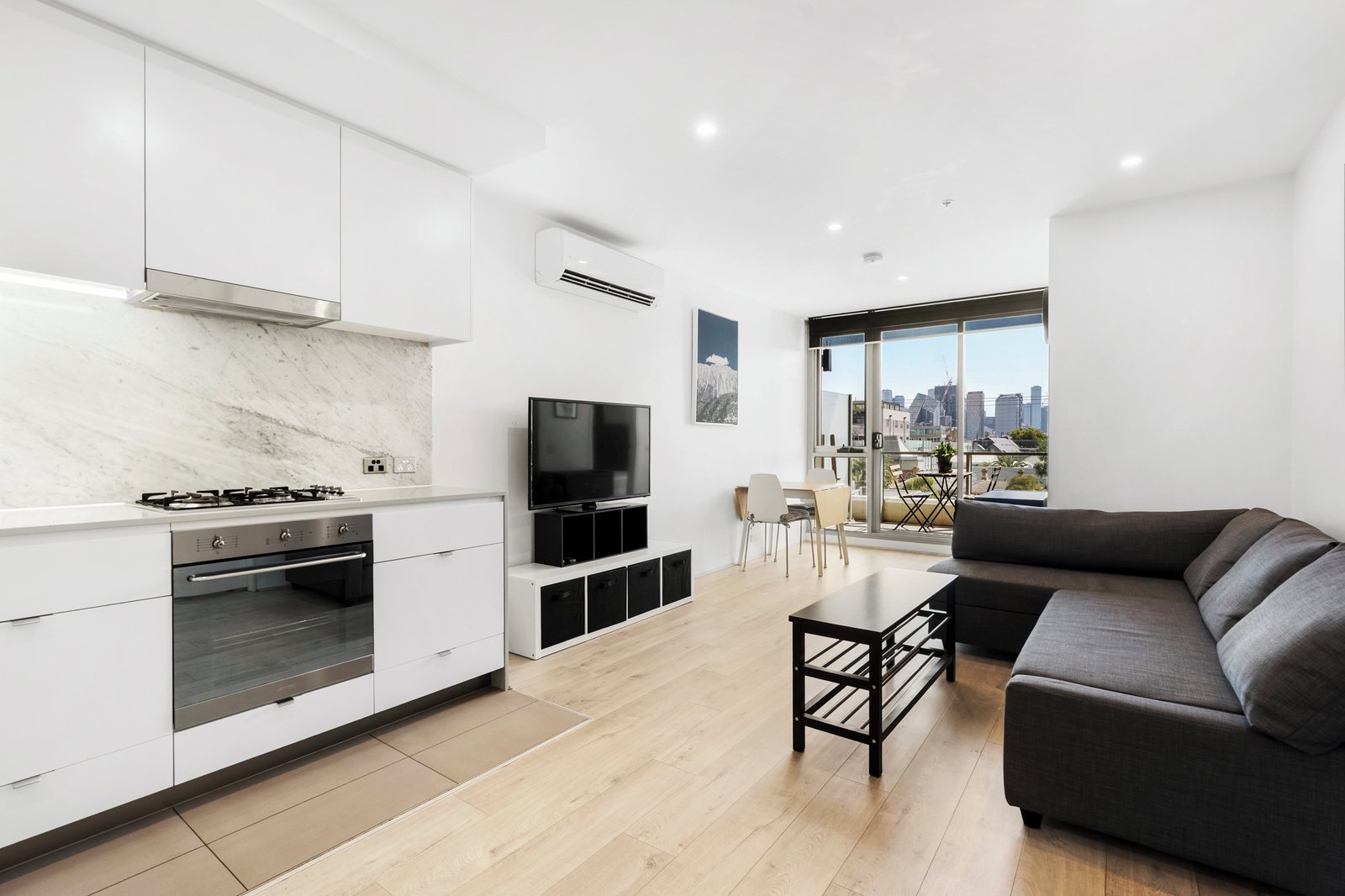 The spacious open-plan living and dining area is bathed in natural light and showcases impressive city views, flowing seamlessly to a stylish kitchen complete with white gloss cabinetry and stainless-steel appliances.