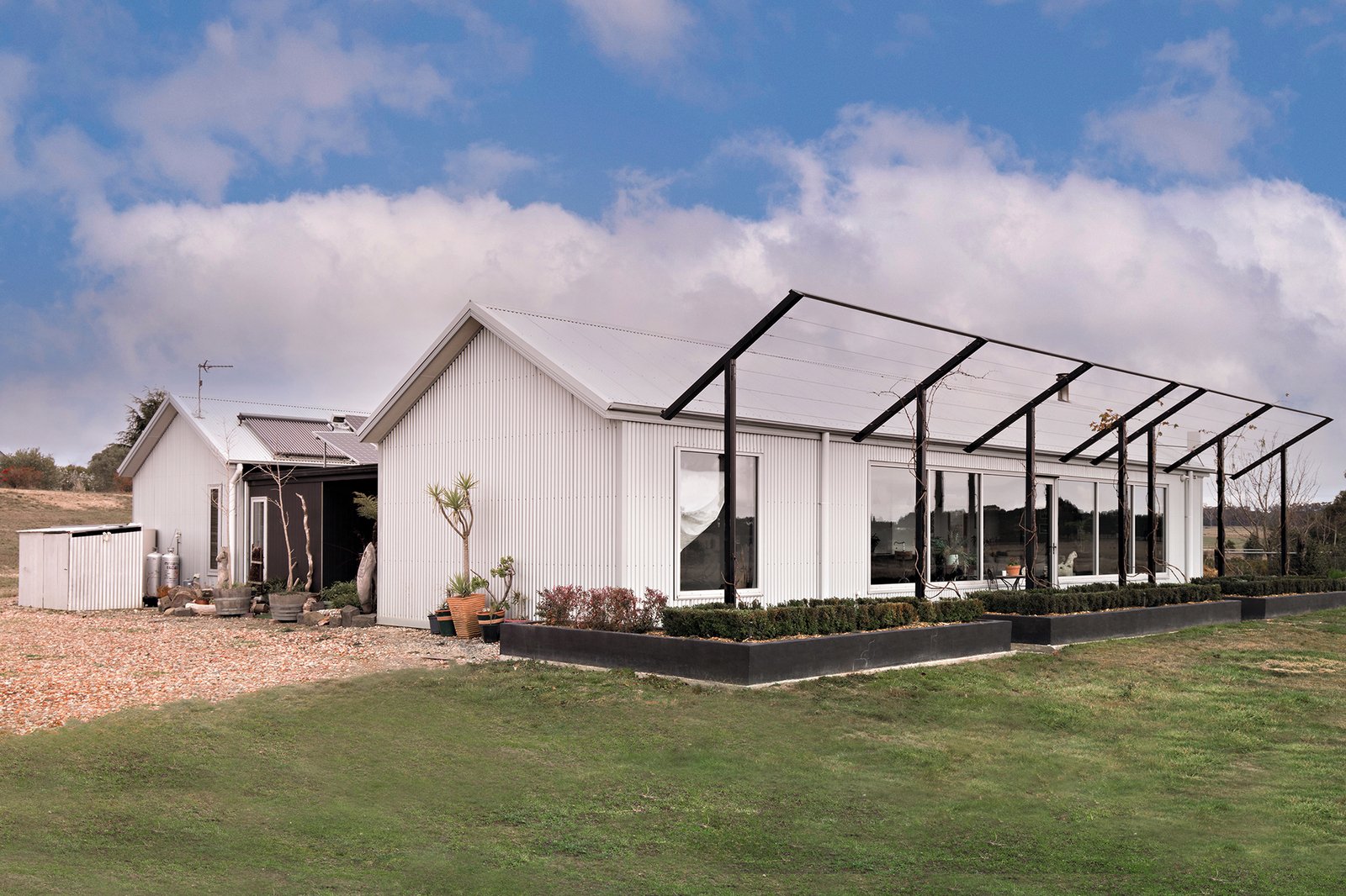 Set amidst 5 beautifully landscaped acres brimming with olive trees, fruit trees, and a wide variety of established plantings, this stunning off-grid residence blends modern sustainability with timeless design.