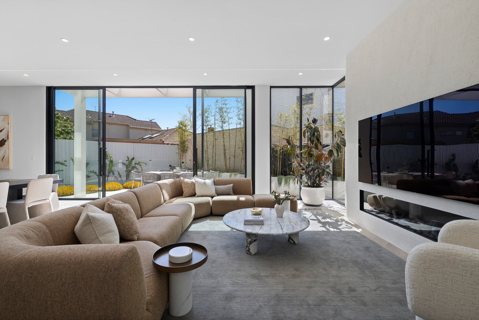 Filled with abundant natural light and warmth, the open plan living/dining domain is centred around a statement gas log fireplace and is seamlessly connected to the sundrenched poolside oasis via banks of stacking sliders.