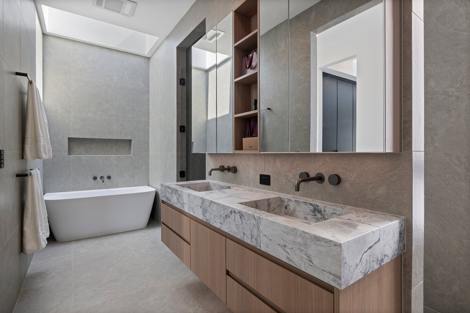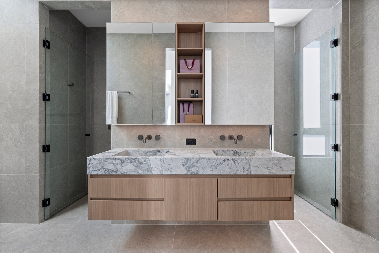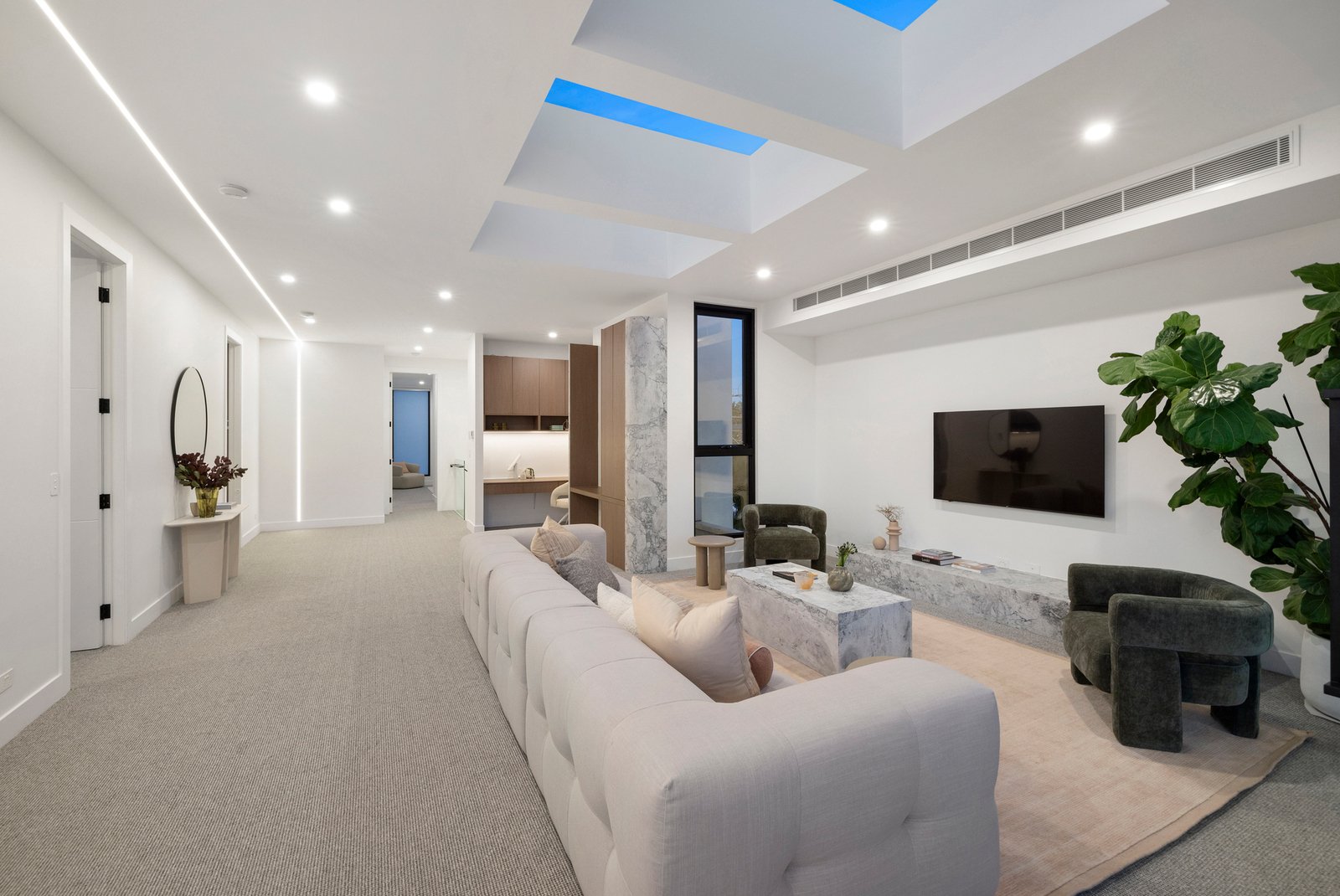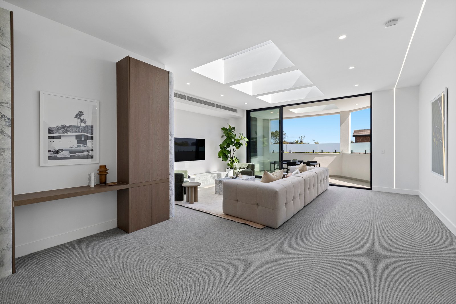 Also upstairs is a jaw-dropping first floor living room, which is set under towering 3m ceilings with multiple skylights and extends out to a bay-view terrace for effortless open-air relaxation with friends.