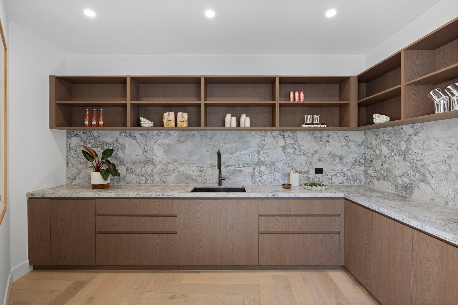 An entertainer’s dream, the sophisticated Epicurean kitchen is a setting of refined luxury & unwavering practicality. Featuring extensive stretches of exquisite Dolomite stone – an inclusion that continues throughout the home - it is equipped with a full suite of prestige Miele appliances, a fully integrated fridge/freezer, fitted wine storage and substantial cupboard space, including an over-sized and fully-fitted butler’s pantry.