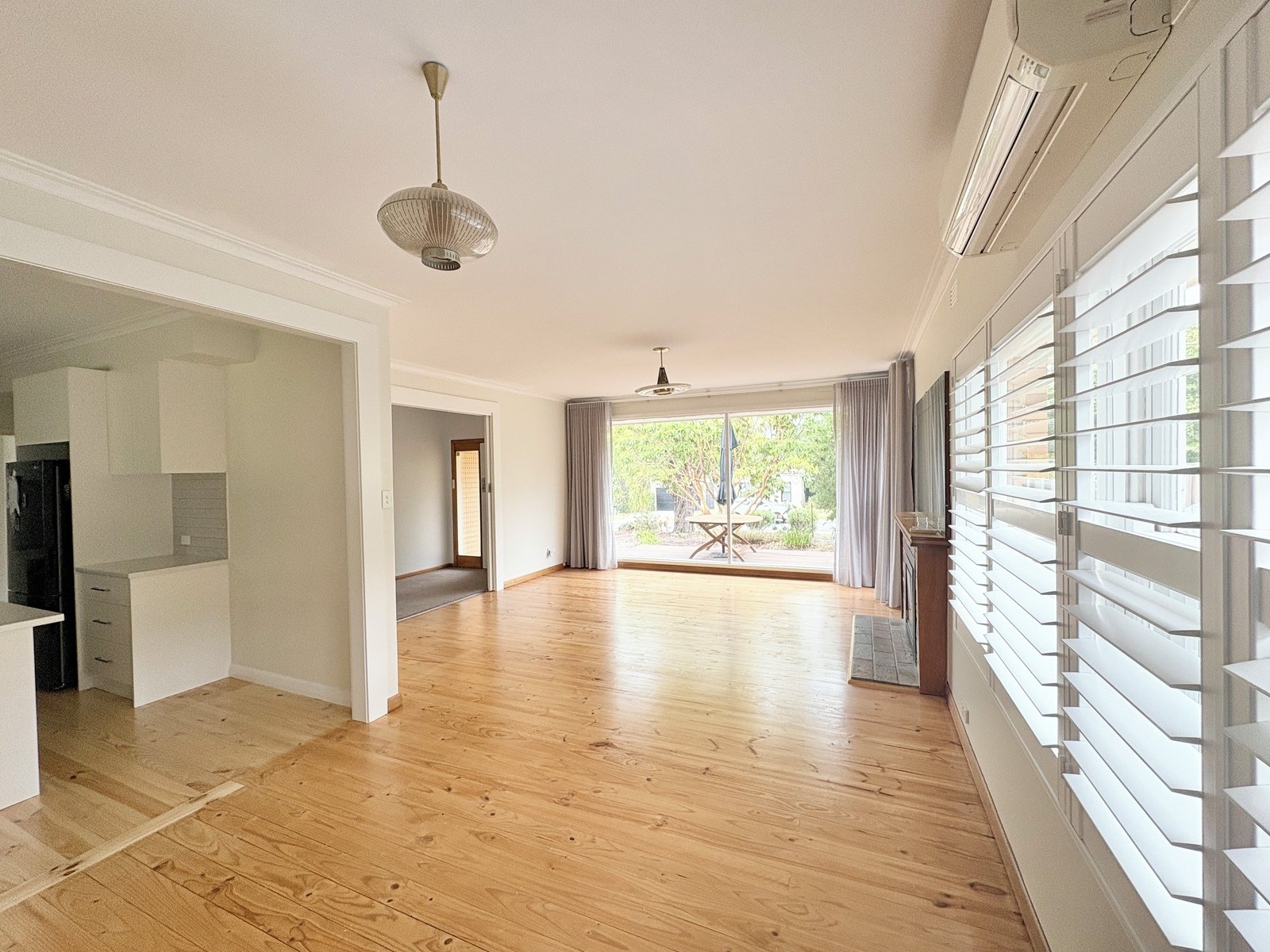 - Light-filled living room featuring gas log fireplace and split system heating and cooling for year-round comfort