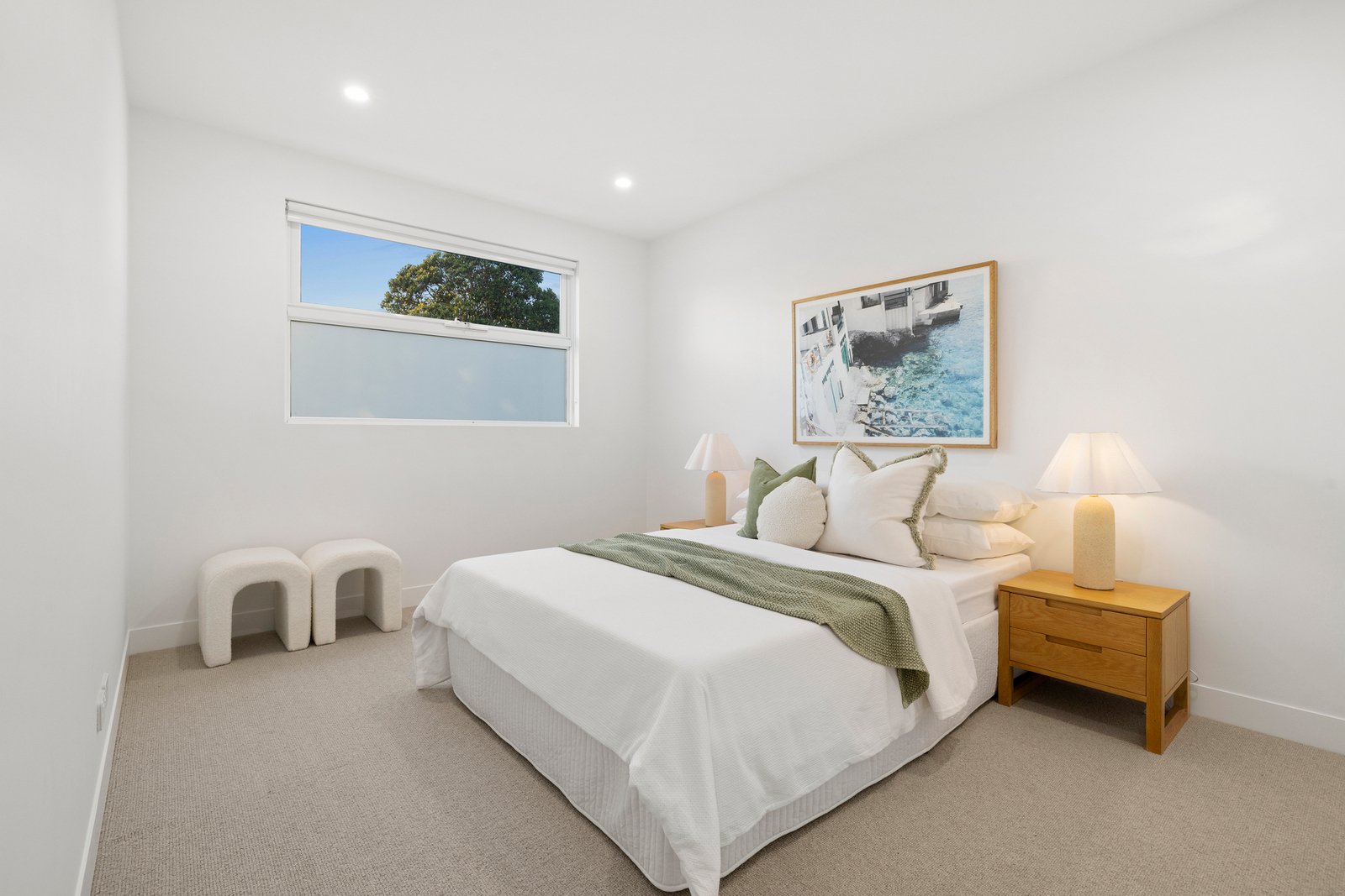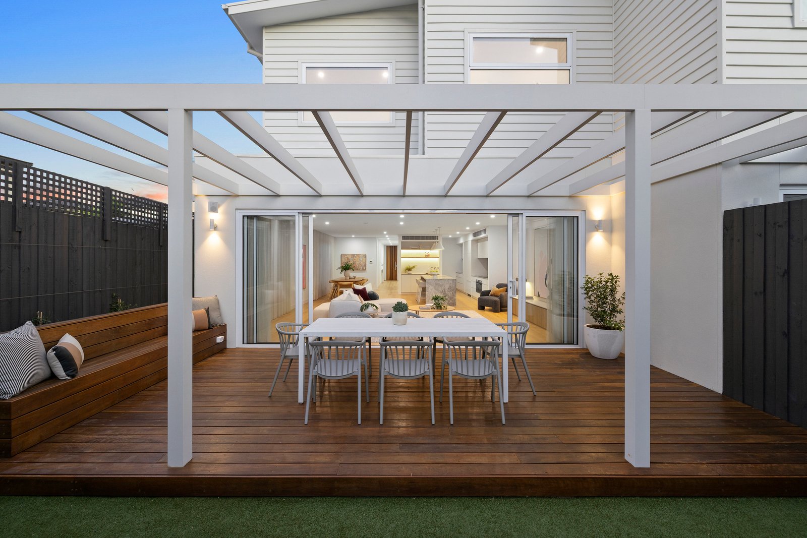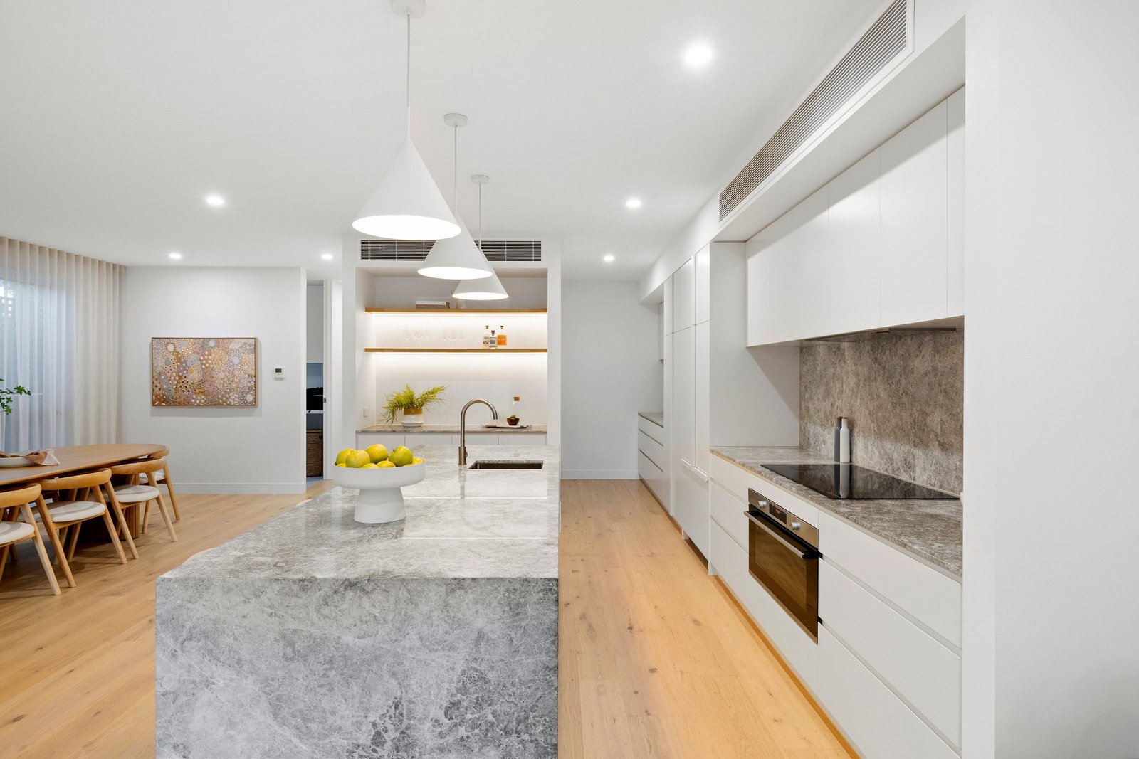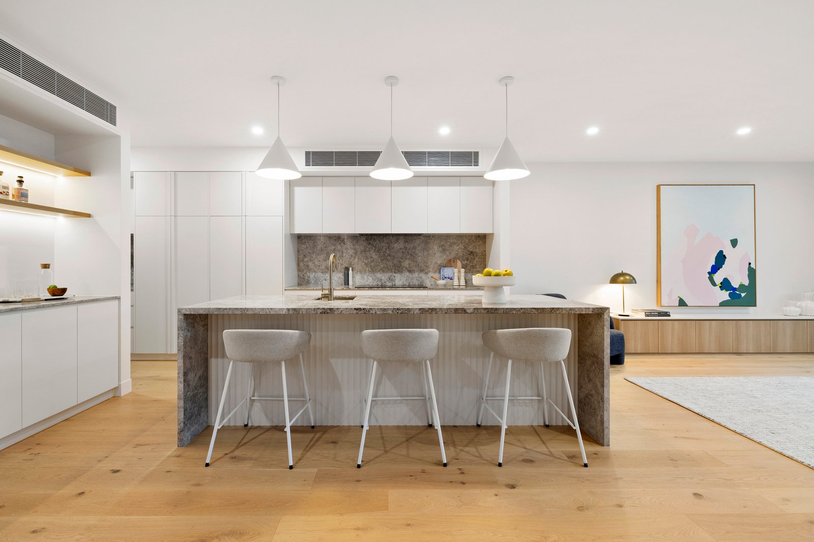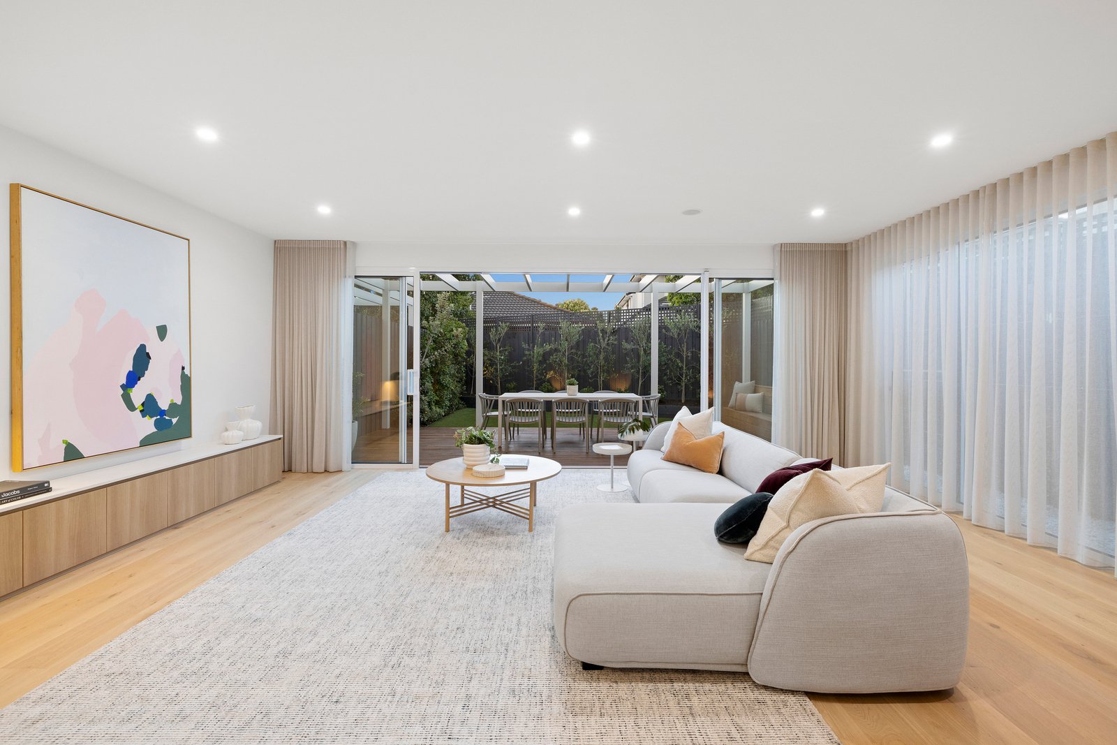 The open plan entertaining zone simply stuns, with a north-westerly aspect luring in streams of natural light and multiple windows softened by floaty sheers; it embraces the gorgeous hosts’ kitchen appointed with prestige Bosch appliances (900mm induction cooktop & oven) and topped with that beautiful stone. An integrated fridge and butler’s pantry with dishwasher are thoughtful design elements, while outside the sundrenched alfresco deck sets the scene for laidback summer soirees.