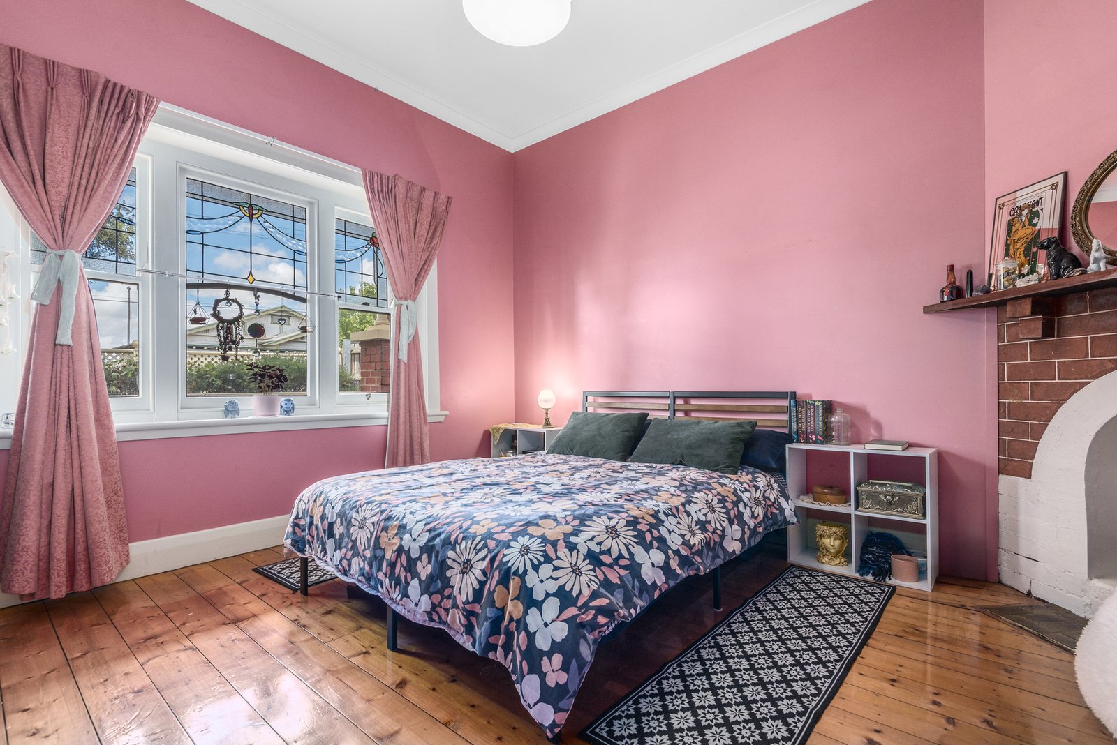 The classic period bungalow features a grand verandah and a curved bay window with decorative leadlight, showcasing all the charm of its era. Stepping into a wide entrance, polished timber floors and high ceilings create an inviting atmosphere within. Two bedrooms off the entry are generous in size, with one featuring an original mantel and fireplace. Further along, a third bedroom includes built in robes, while the bright central bathroom is well positioned for easy access.
