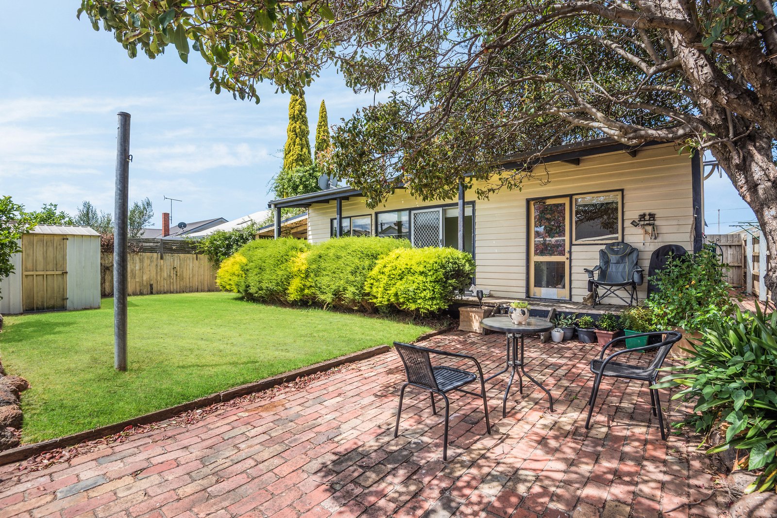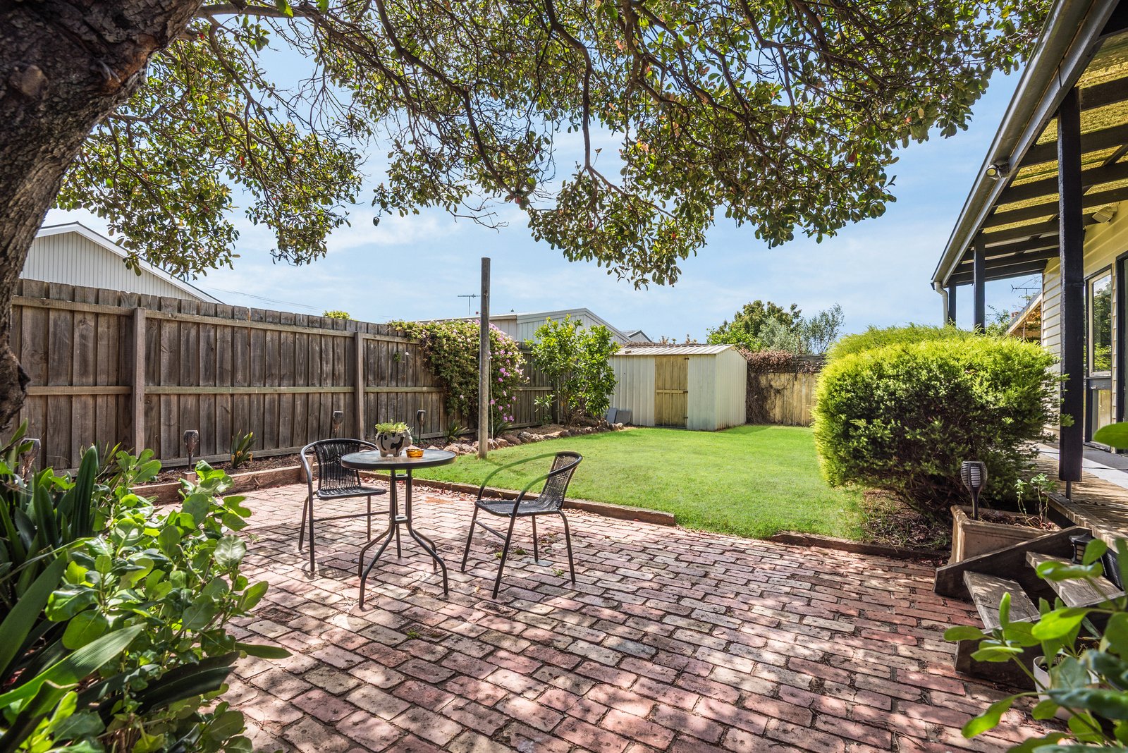 Outside, a paved entertaining space and lush lawn area offer a private spot to relax, play, or wine and dine outdoors, with surrounding established gardens creating a shady and tranquil environment. The long driveway accommodates excellent off street parking, with a shed at the rear for outdoor storage.
