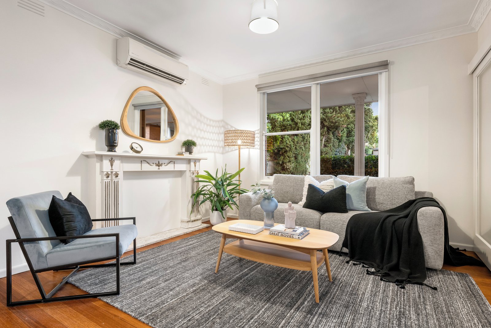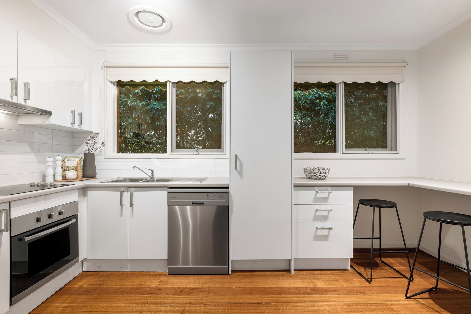 Hardwood floors sweep through a spacious lounge and dining room with split system comfort, flowing to an oversized kitchen appointed with an electric cooktop, dishwasher and pantry. A clever corner breakfast bar, framed by greenery, provides an inviting setting for morning coffee or casual meals.