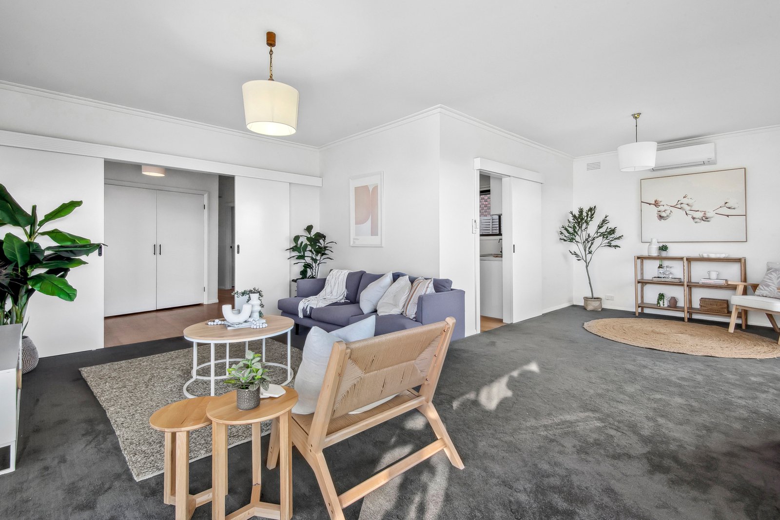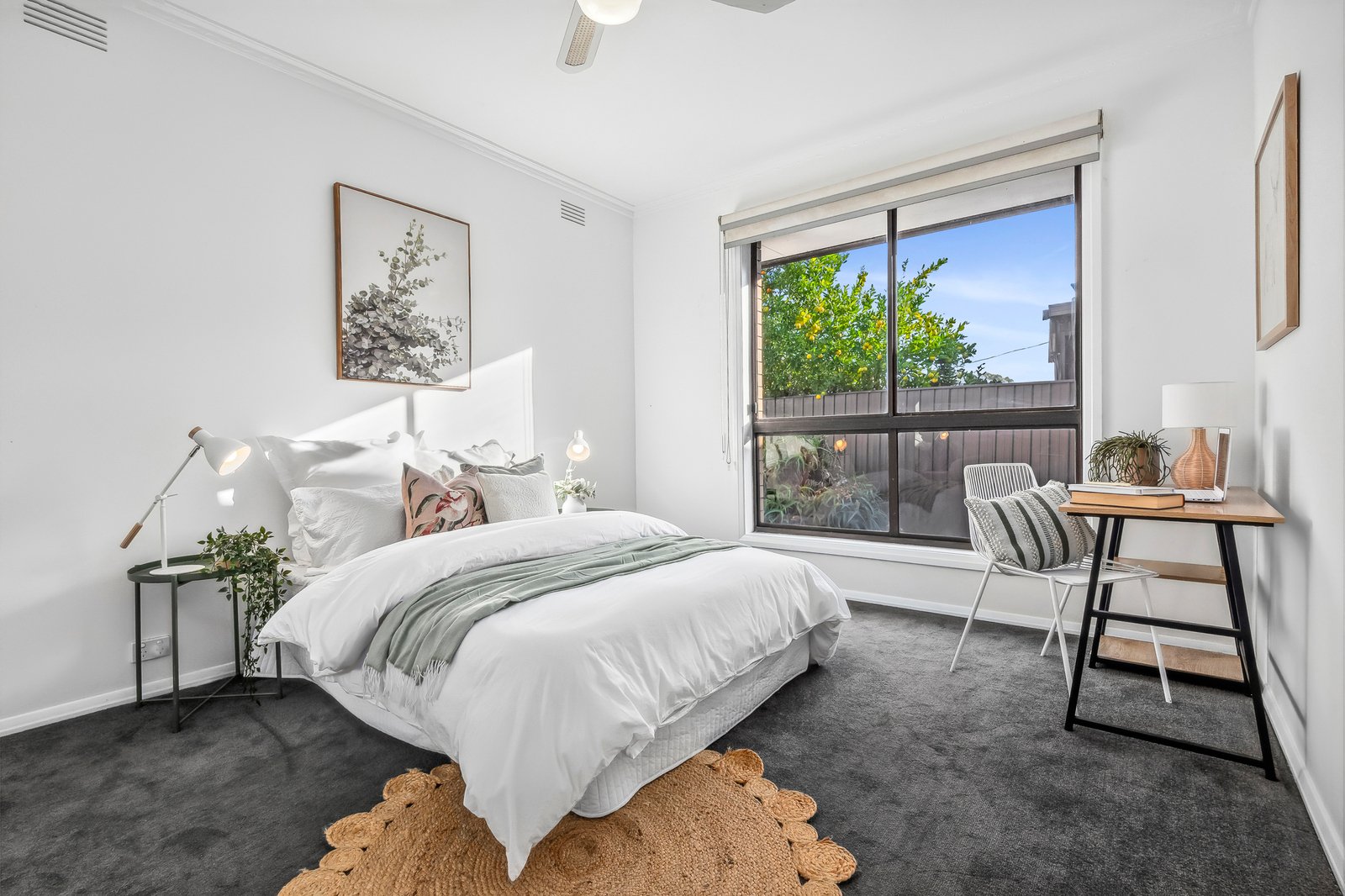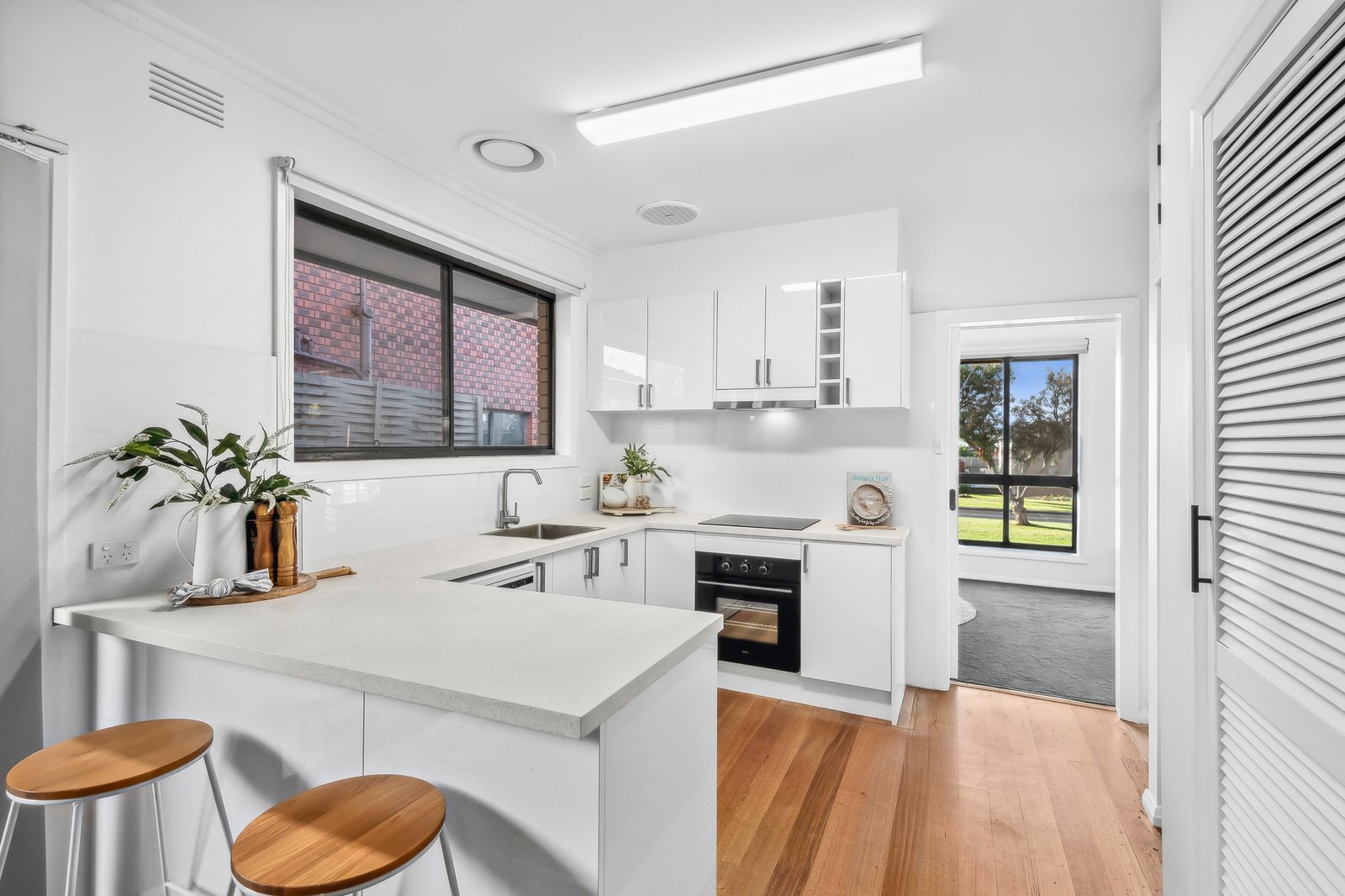 Set in a quiet tree-lined street, the property enjoys a peaceful setting. Inside, a wide entry leads through to a light-filled living area showcasing crisp white interiors and modern carpet, with day and night double blinds and split system heating and cooling for year-round comfort. The adjoining kitchen has been elegantly updated featuring polished timber floors, stone benchtops, modern appliances including 600mm oven, induction cooktop, dishwasher, generous storage provisions, and the perfect vantage point to oversee the dining space for easy everyday living and entertaining.