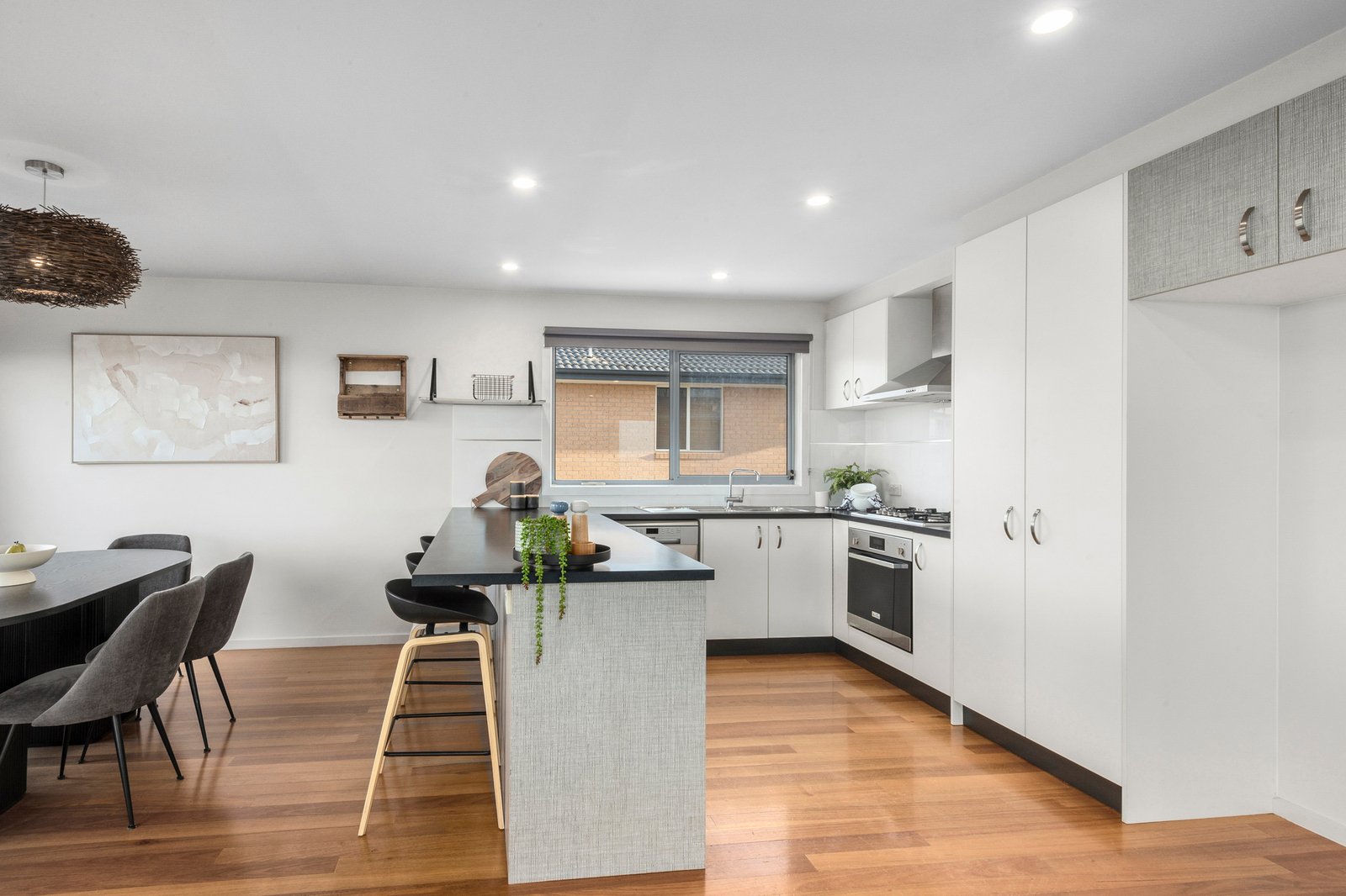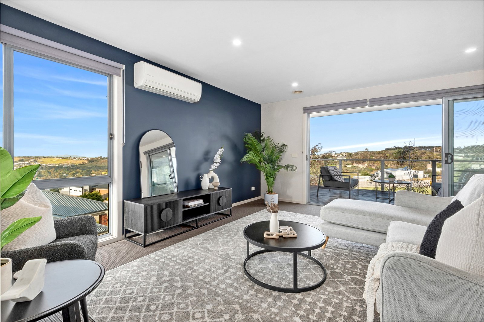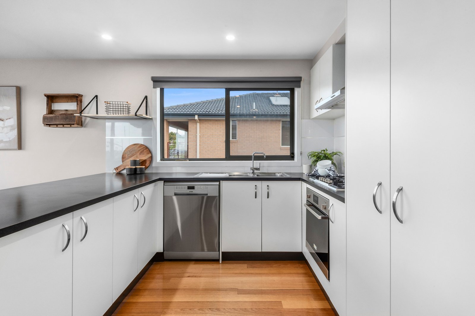 Landscaped gardens and an eye-catching contemporary façade introduce the chic modern style of the home which continues within. The main living area is positioned on the upper level, optimising the elevated position and providing a panoramic vista across Highton, Fyansford and the lush riverside surrounds. The open plan layout features a stylish kitchen with quality stainless steel appliances including 600mm electric oven, gas cooktop, dishwasher, and excellent storage provisions. Perfectly designed to oversee the dining, living, and balcony this is a wonderful layout for everyday living and impressive entertaining. Glass stacker doors open up to connect the living with the large balcony for an effortless indoor-outdoor flow.