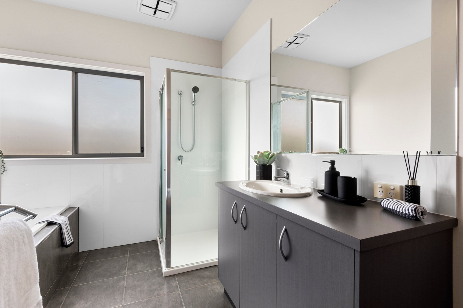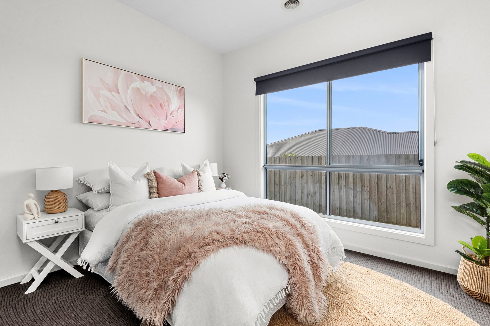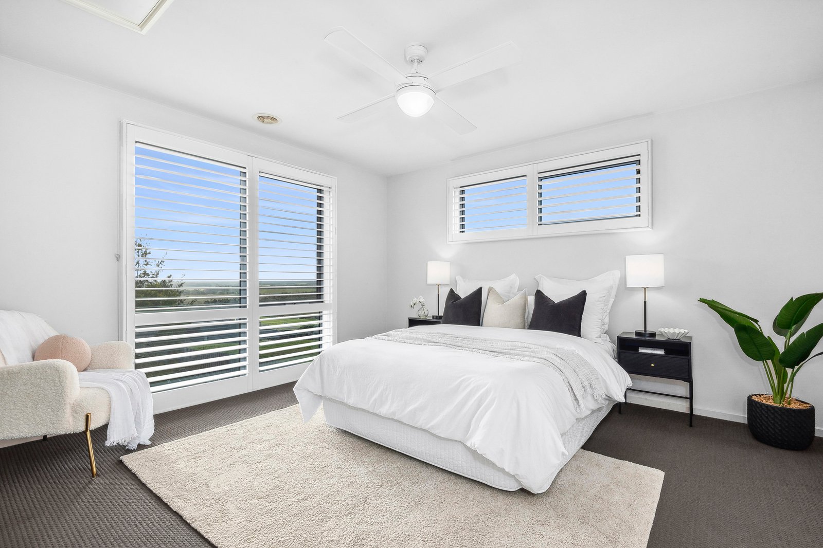 The upstairs main bedroom is luxurious in size, offering a private retreat featuring elegant plantation shutters, ceiling fan, walk-through robes and a tastefully presented ensuite. Three further bedrooms are separately zoned on the ground floor, all include built-in robes, serviced by a central family bathroom and separate wc.