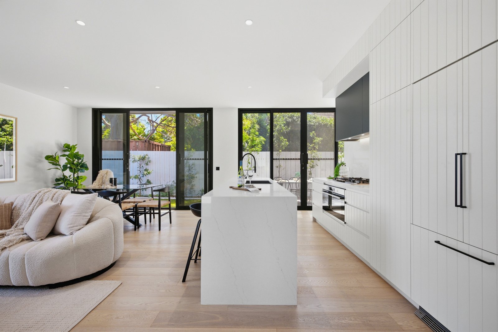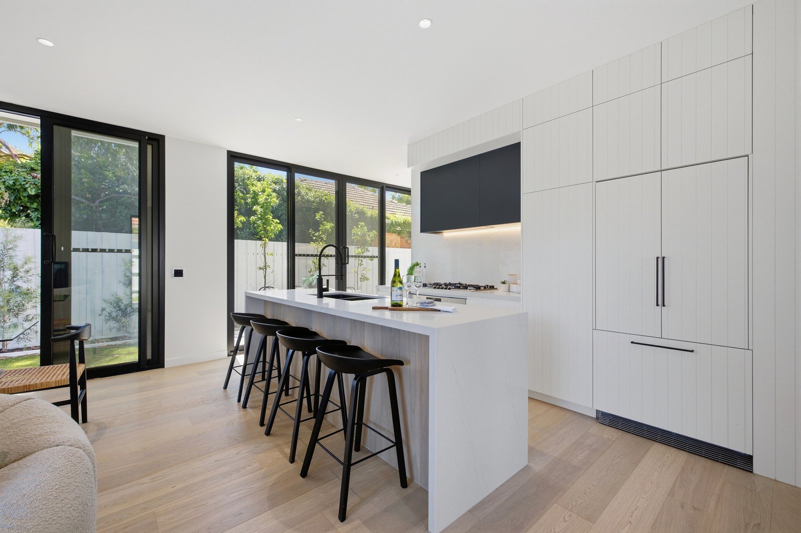 Flushed with natural light on account of oversized double-glazed windows framing garden views and enhanced by panelled detailing giving a chic coastal energy, the interiors comprise an open plan entertaining zone that connects seamlessly with the luxe stone kitchen. Appointed with premium appliances including an integrated dishwasher and fridge/freezer creating a seamless aesthetic, this space also conceals a fabulous pantry/laundry behind custom cabinetry. Outside, a north-facing patio soaks up the sun and spills to the wraparound mod-grass garden.