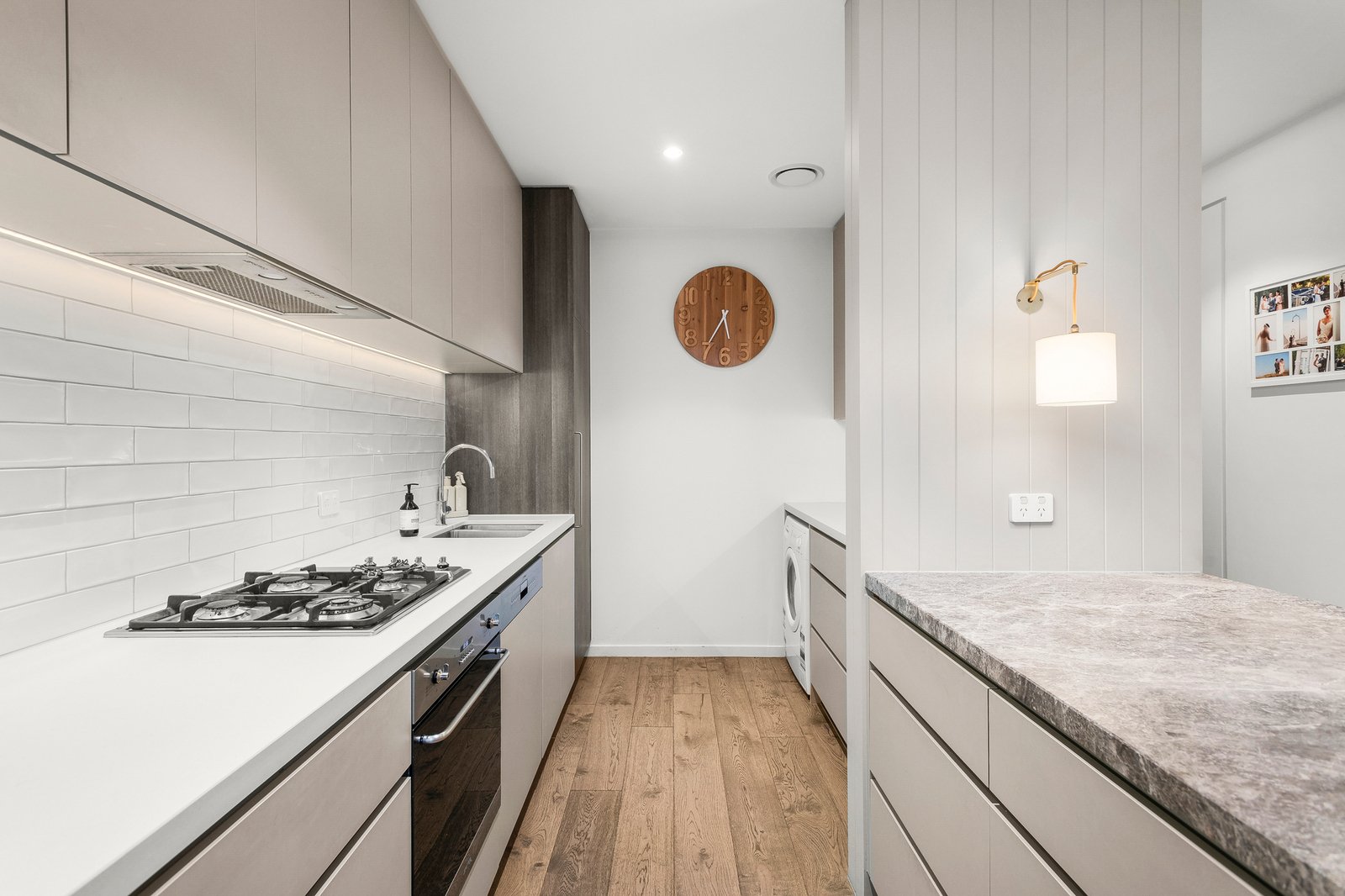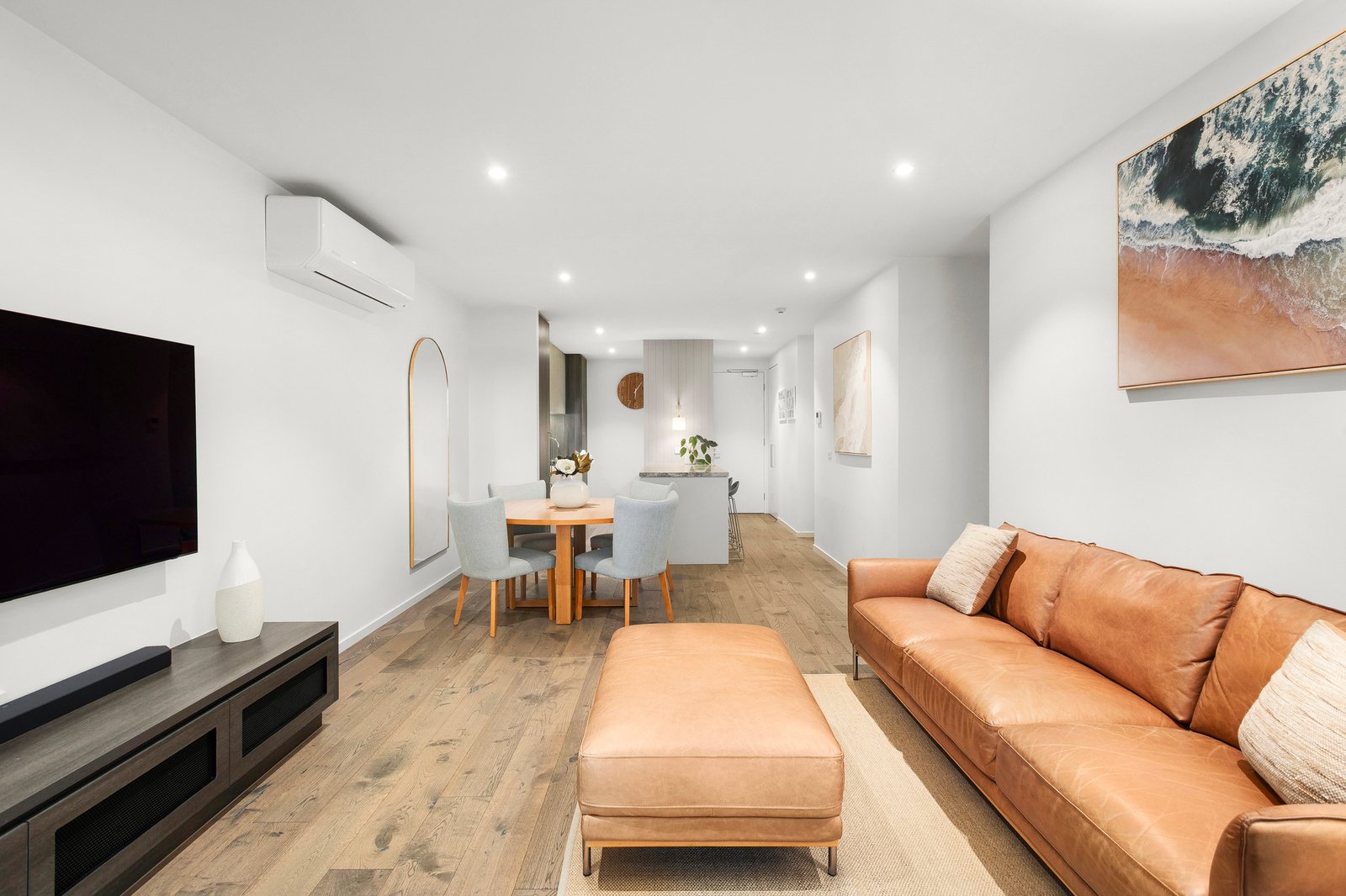 Stylish and streamlined, the open-plan living and dining zone is enhanced by premium floorboards and flows effortlessly into a sleek kitchen featuring stone benchtops, SMEG appliances, an integrated fridge and concealed laundry facilities. Floor-to-ceiling sheer curtains add a touch of elegance, while sliding doors open to a wide balcony — the perfect spot to unwind and soak up the atmosphere.