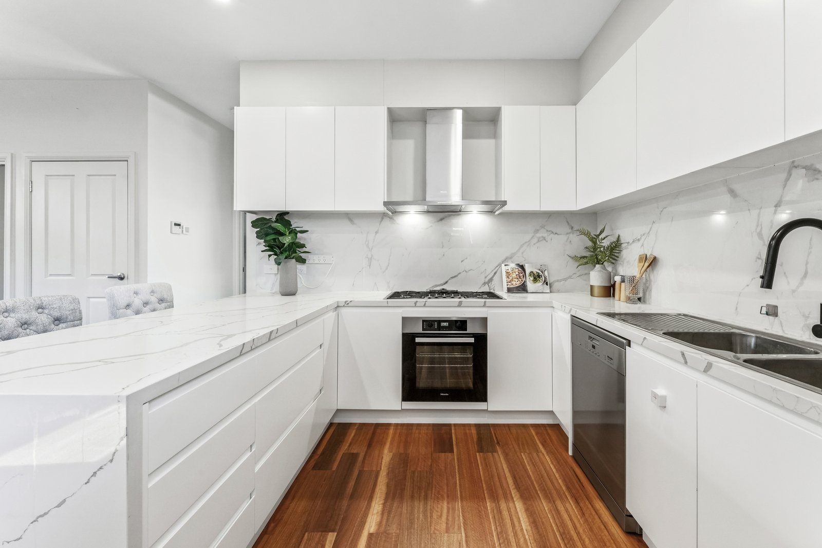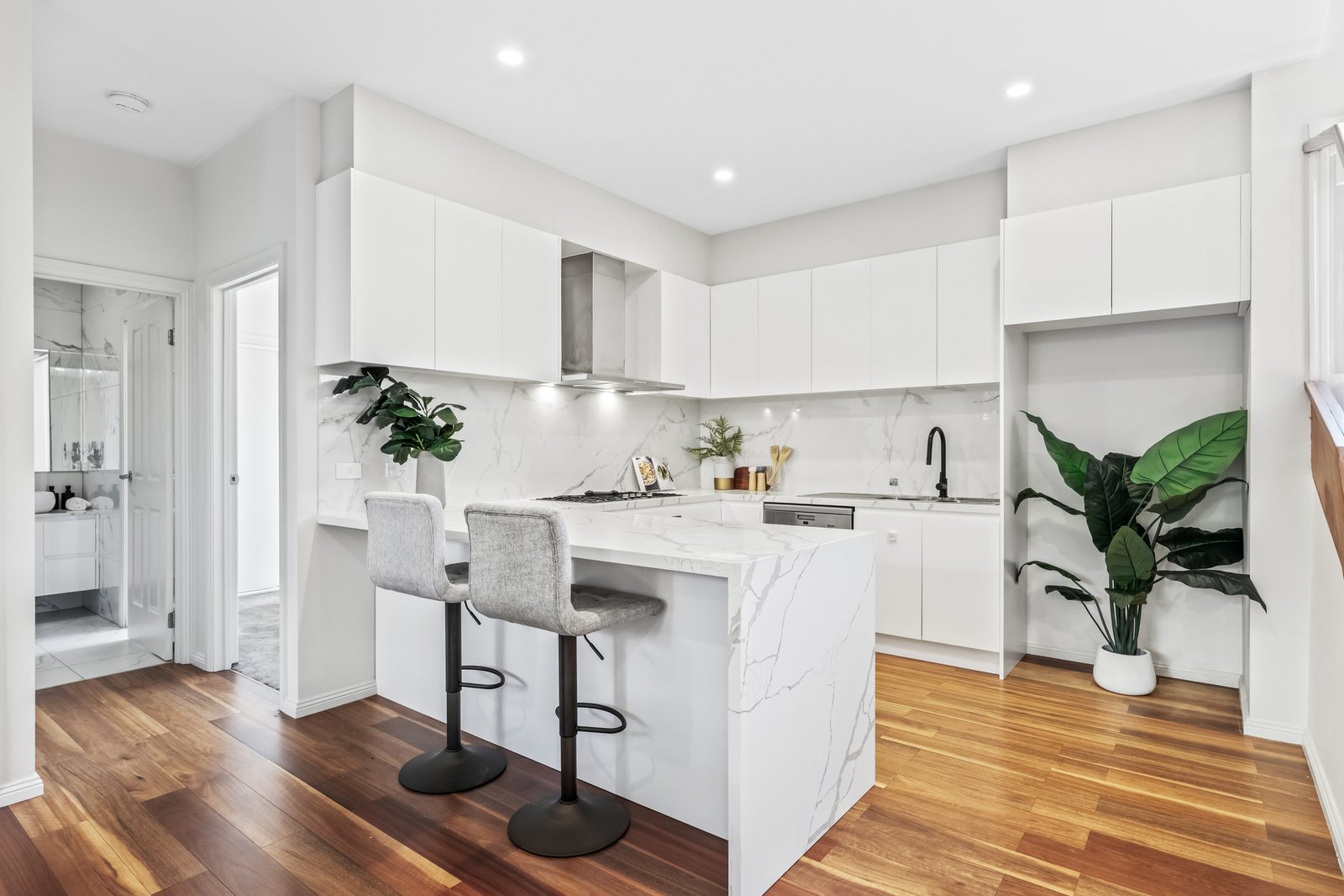 Open and airy from the instant you step inside, the open concept living and dining zone connects with a gourmet kitchen showcasing waterfall stone benches, an island breakfast bench and high-end appliances.