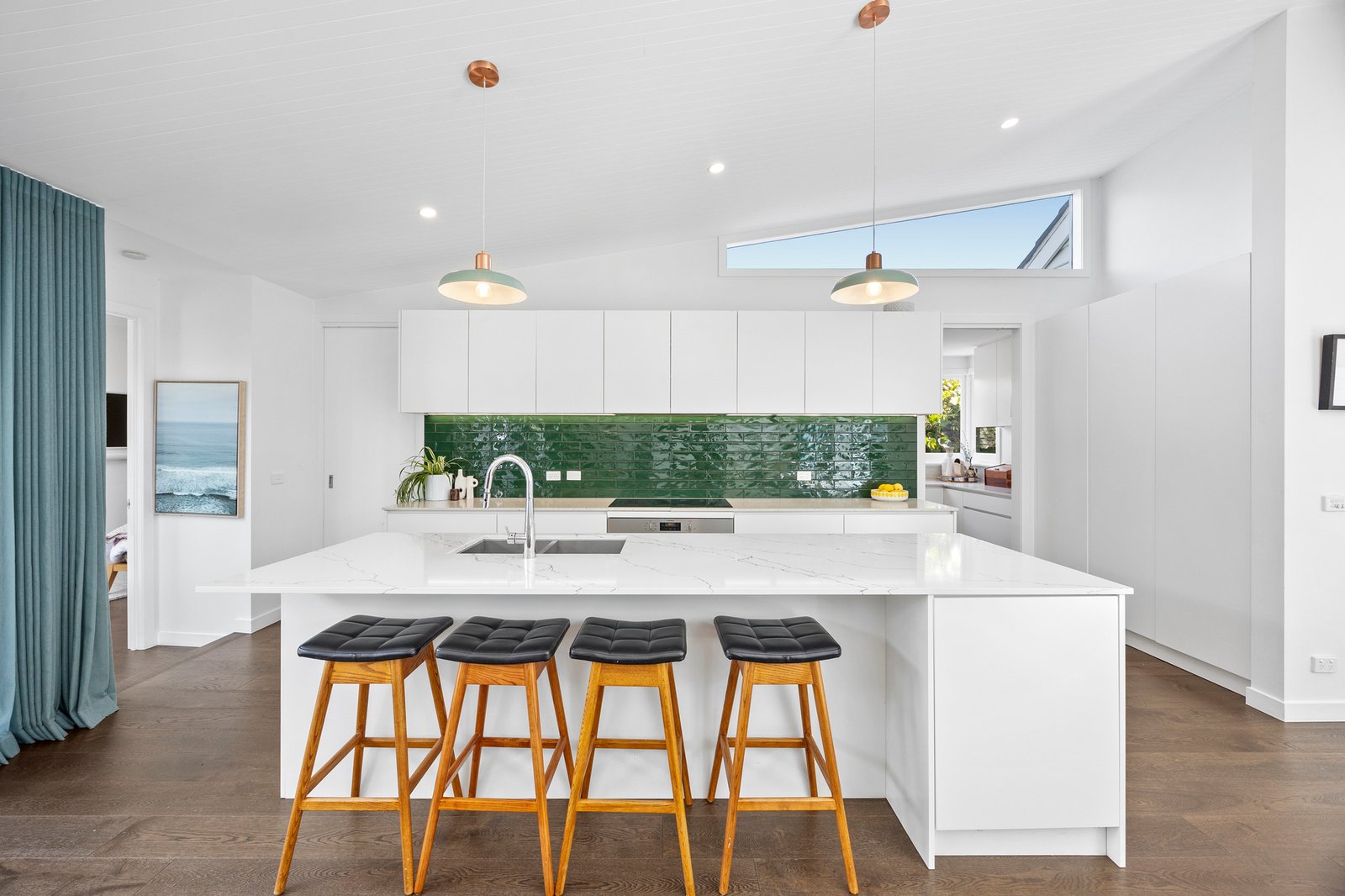 The kitchen is sleek, streamlined and effortlessly functional, featuring stone benchtops, Westinghouse appliances including an induction cooktop, oven and dishwasher, a substantial waterfall island and a generous butler’s pantry.