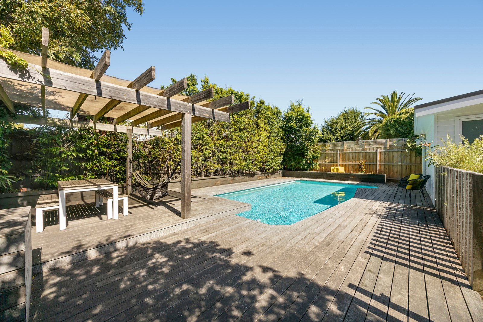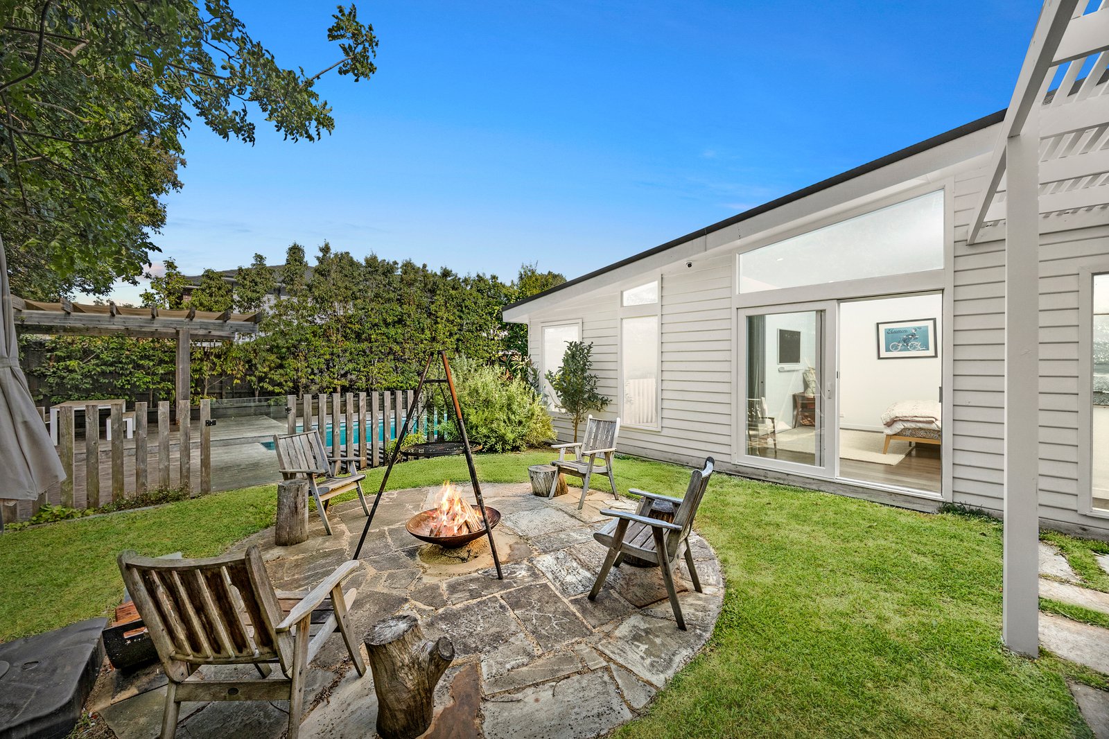 Multiple sliding doors open to a terrace suited to a fire-pit setting, while beyond, the swimming pool and adjoining deck create a relaxed outdoor environment for entertaining, gathering and family time.
