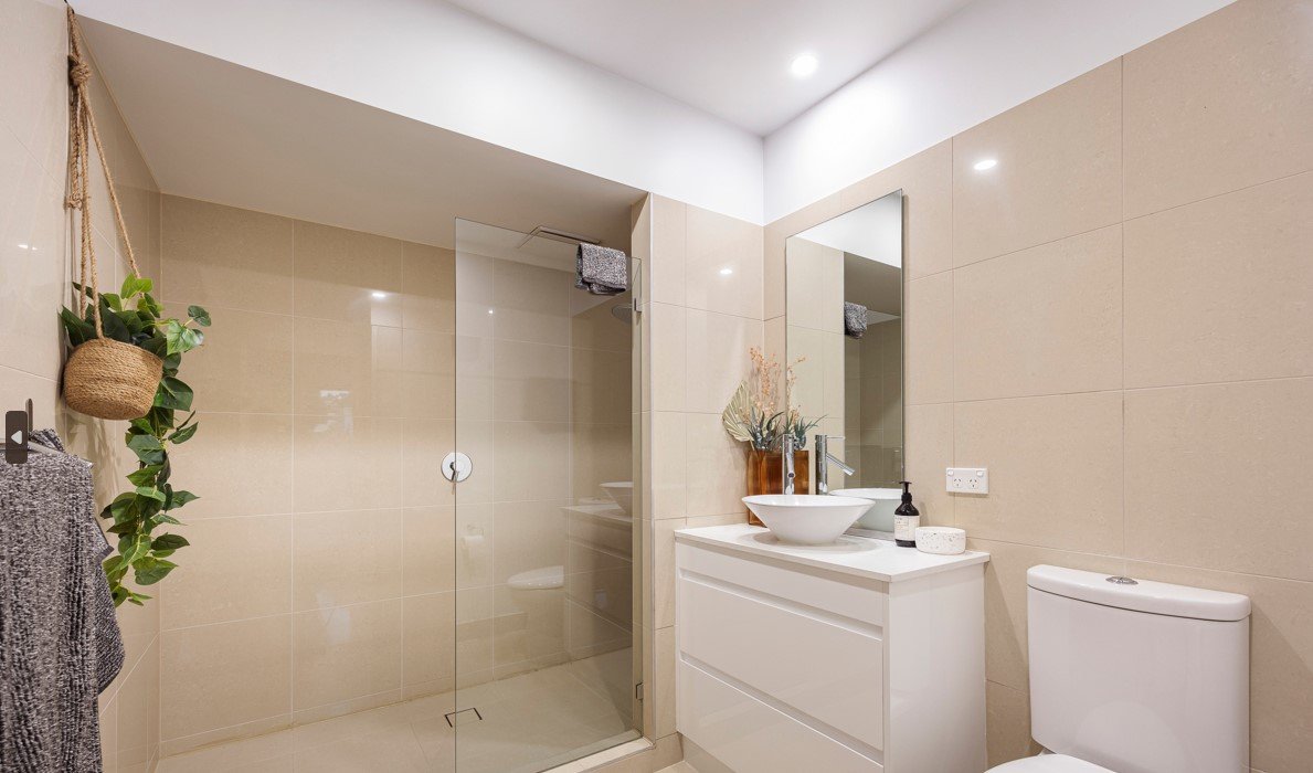 Entry level provides two good size bedrooms and two bathrooms with a courtyard to overlook.