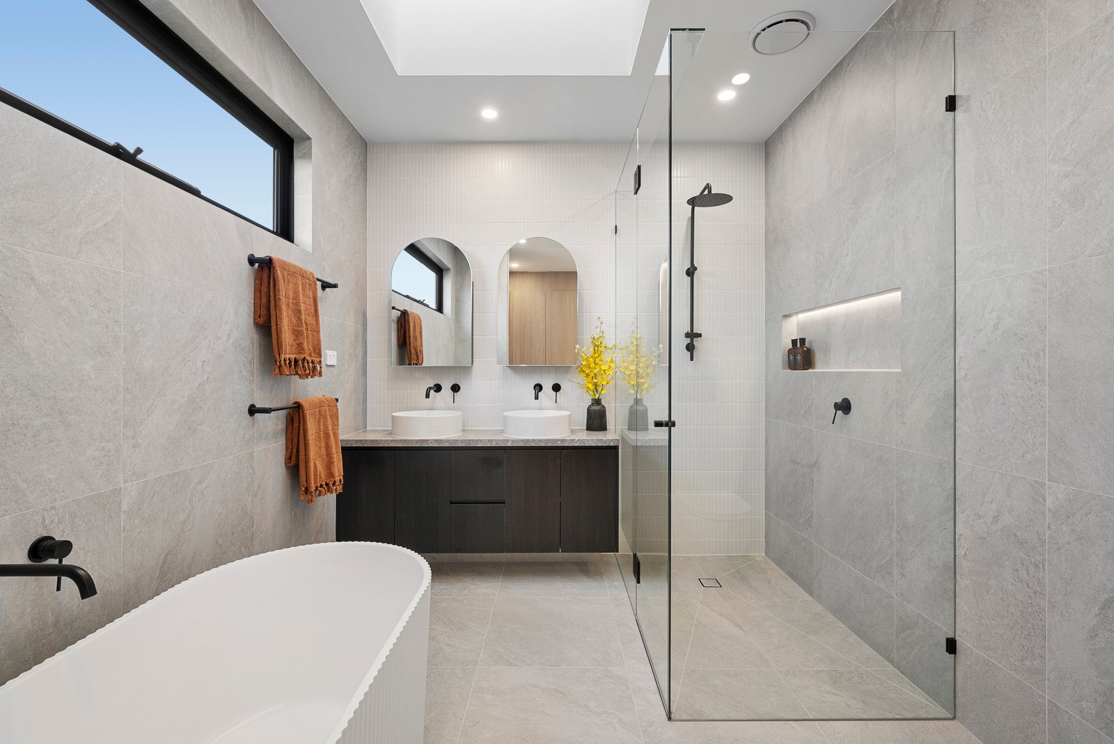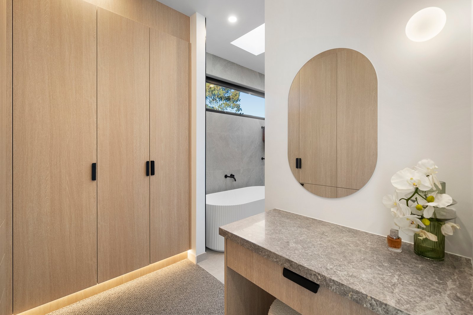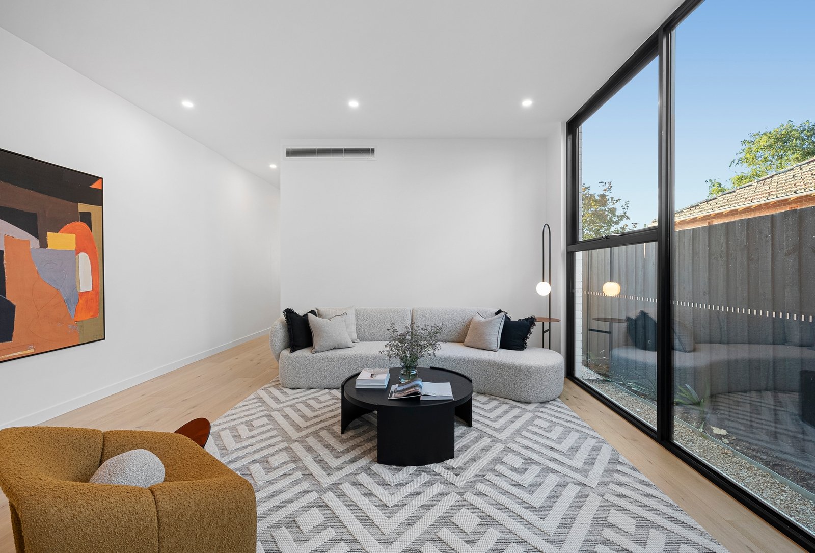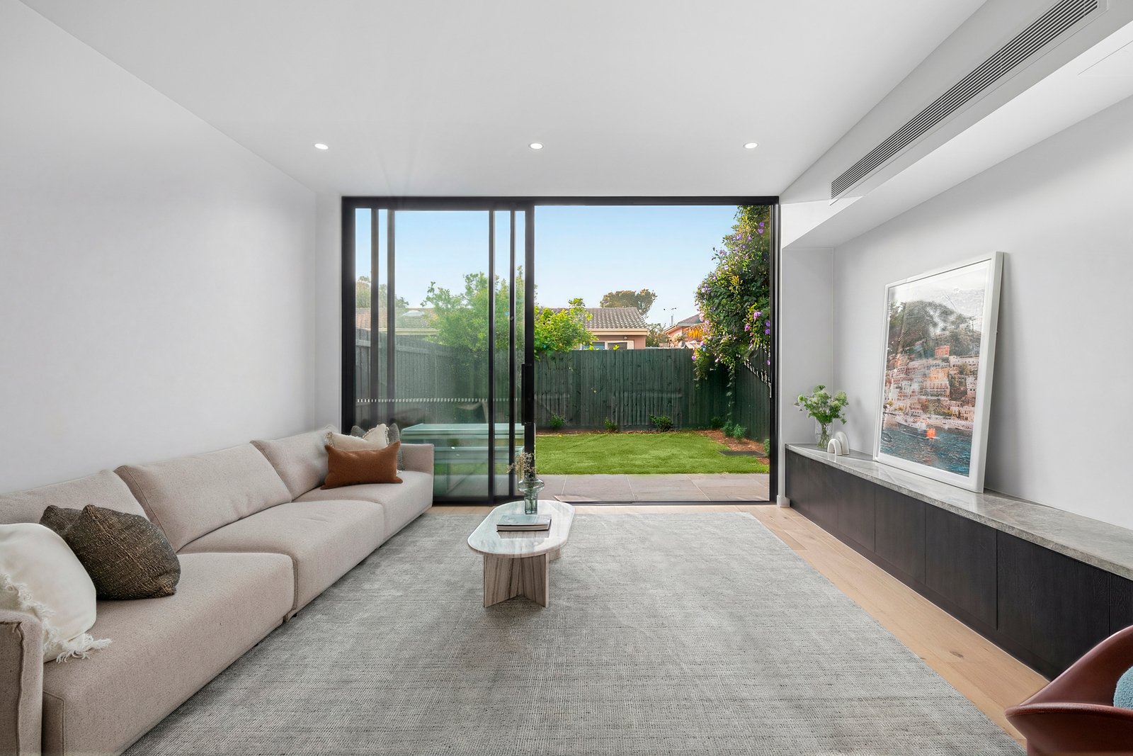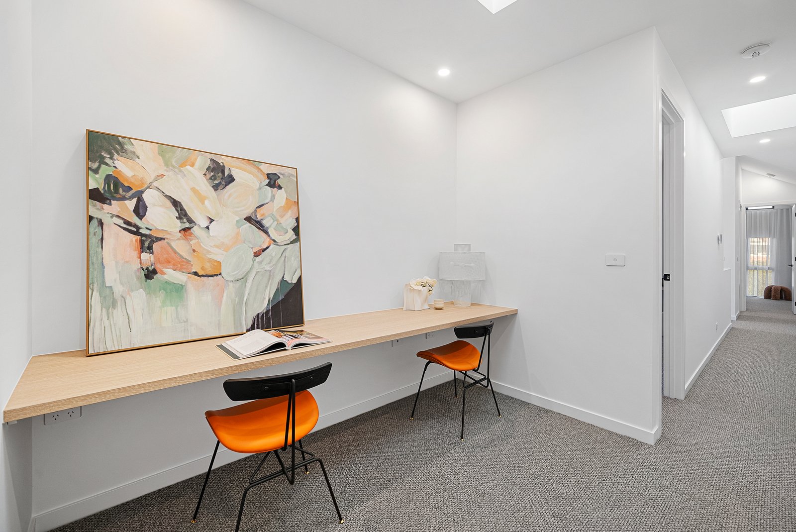 Architectural by design with lofty squareset ceilings punctuated by multiple skylights (including above the dual-station study area), and tall double-glazing oriented to catch the sun, the home features an all-electric specification with individual climate-control to every room, video-intercom, 3Phase power to boost future EV charging and two car-parking including an auto-garage.