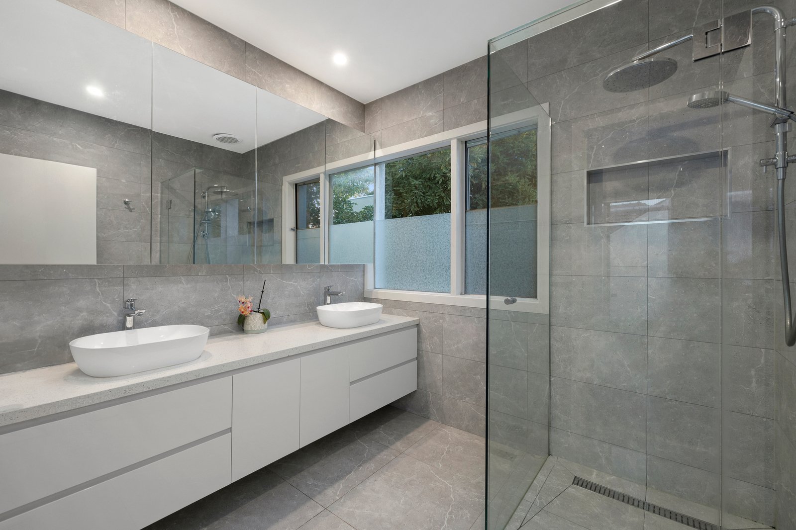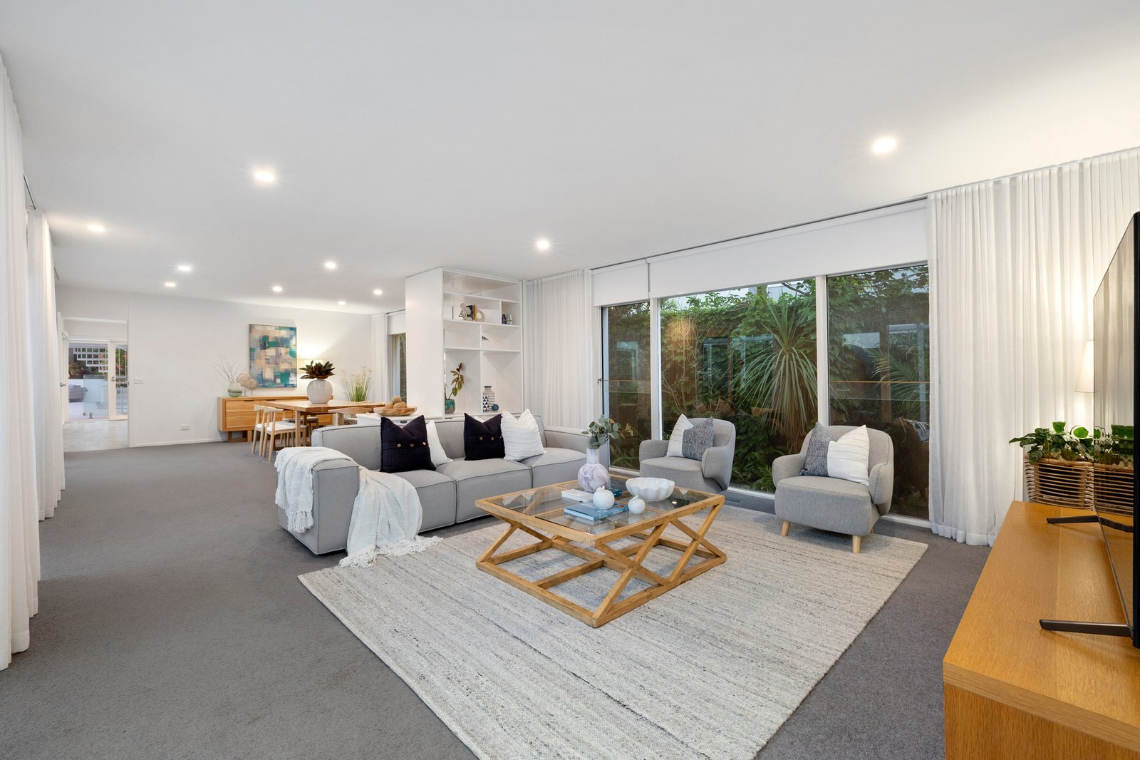 Fully renovated by the current owners, the home is a sanctuary in every sense, with glass galore ushering in lush green views every which way you turn. On entry, the foyer features a soaring ceiling and leads through to the huge living and dining zone that enjoys a fabulous northerly orientation looking out to a leafy patio where an infrared sauna is a luxury inclusion. Further on, the entertainer’s kitchen flaunts premium Ilve & Bosch appliances along with a walk-in pantry and seriously stylish stone benchtops, while a family room and BBQ patio take in views across a huge, heated mosaic-tiled pool.