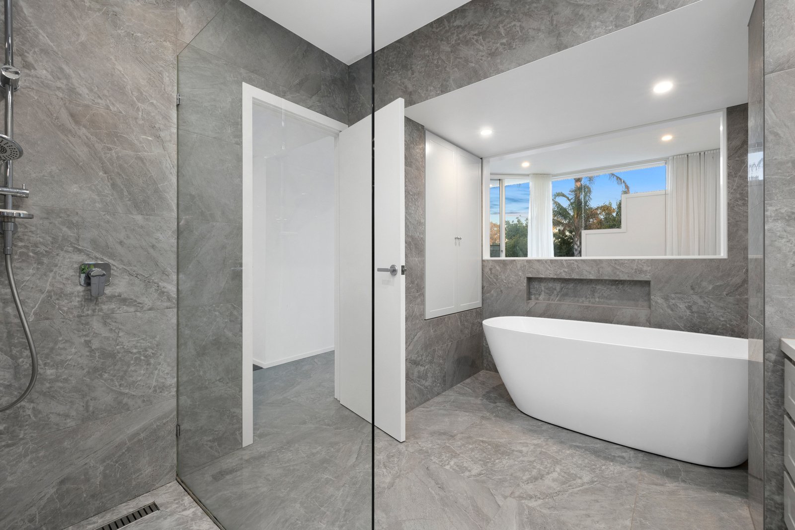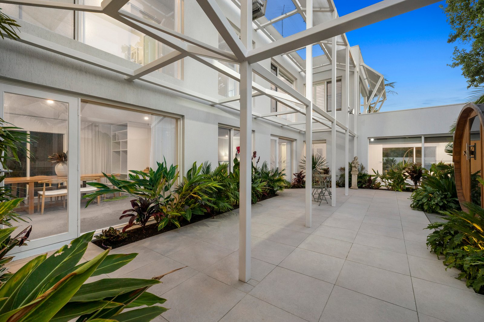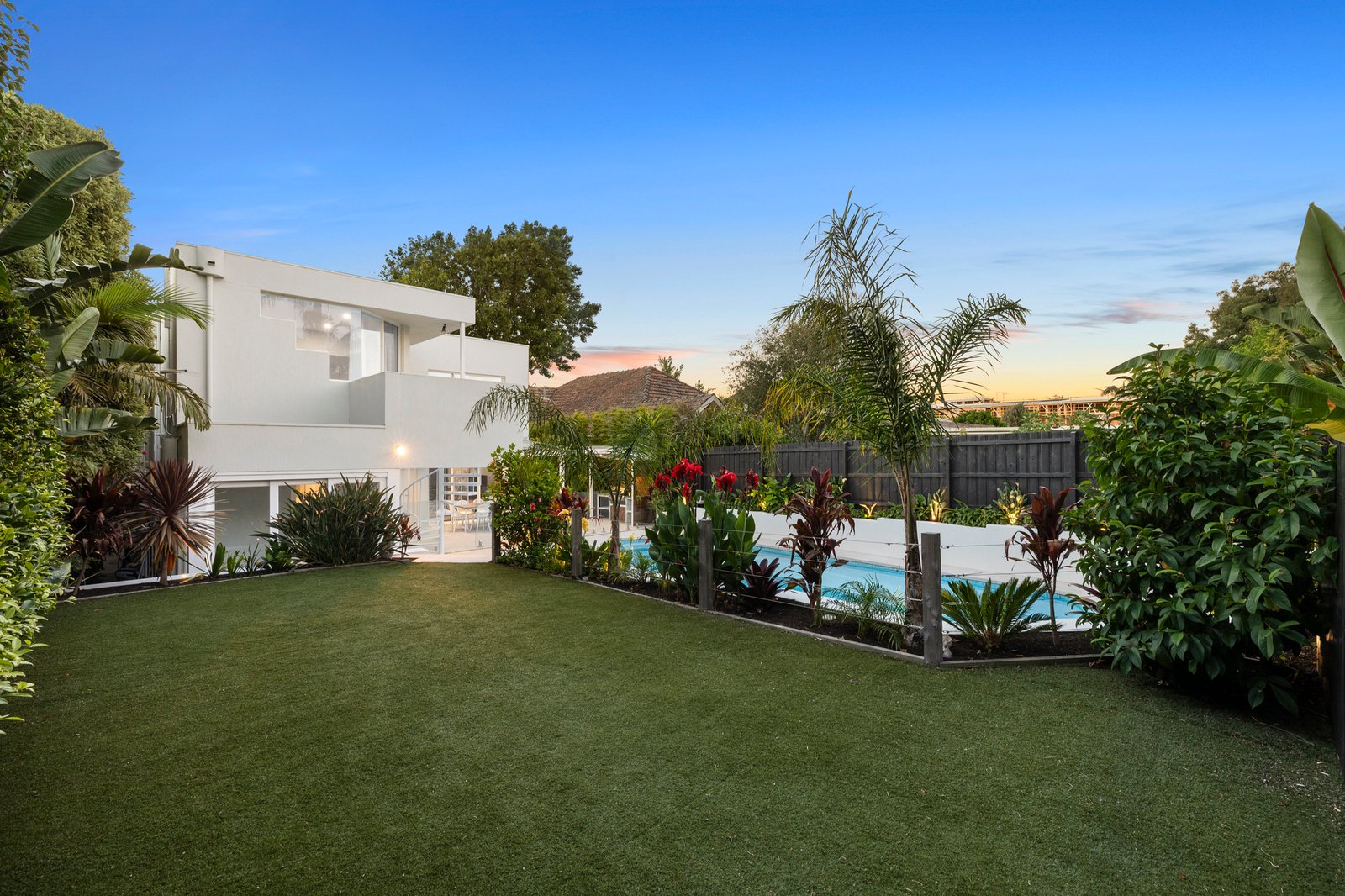 The open stringer staircase ensures a flow of natural light while upstairs, discover three of the bedrooms – two a mirror of each, sitting either side of the sparkling main bathroom with full-height tiles and a twin vanity. Soaking up glistening pool views, the lavish main bedroom is serviced by a luxury bathroom of its own and offers a versatile retreat perfect as a parent’s hideaway - from here is a spiral staircase down to the pool patio where an enclosed spa is another resort-like feature.