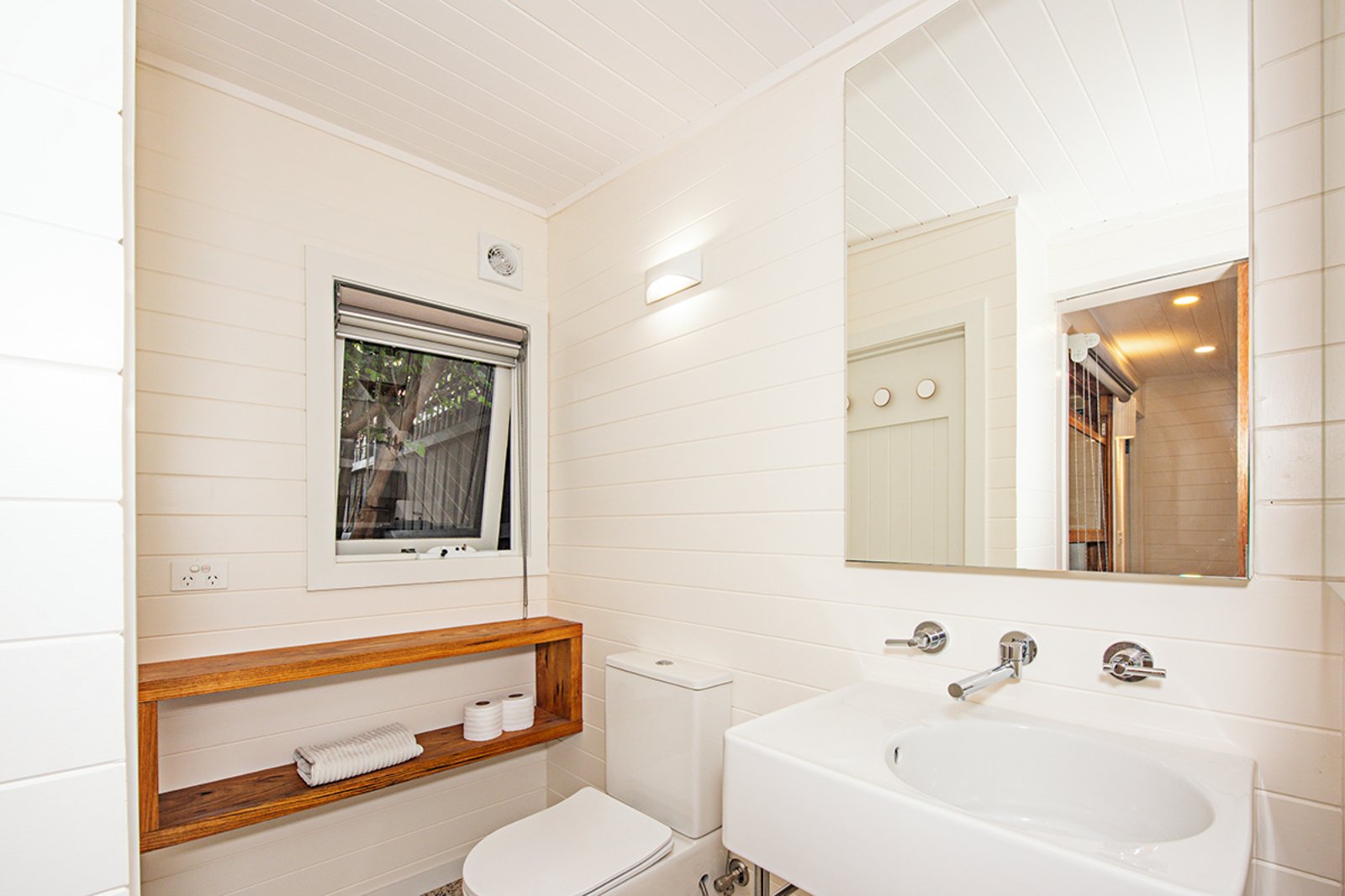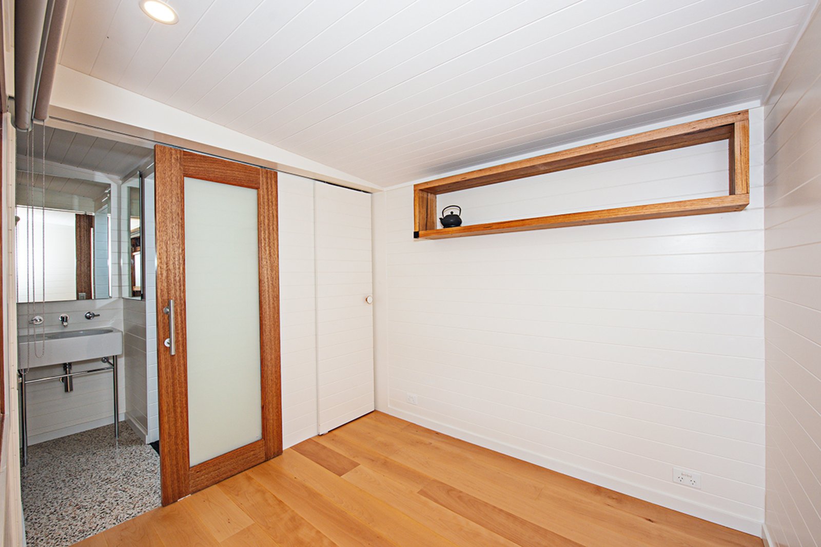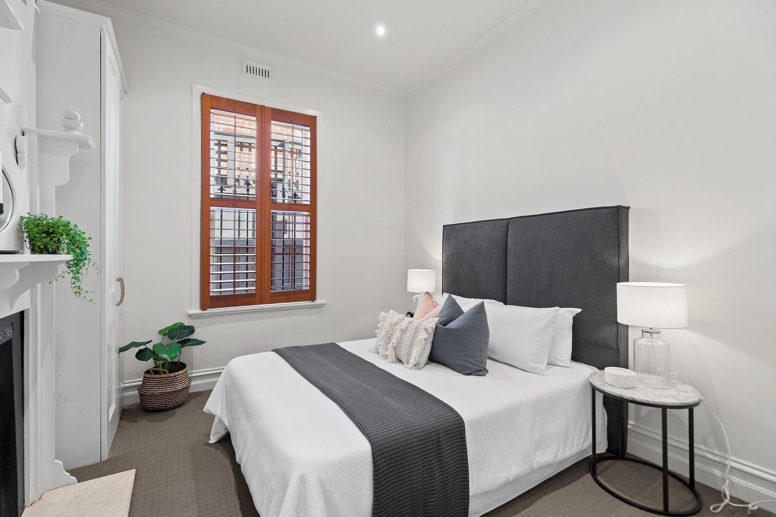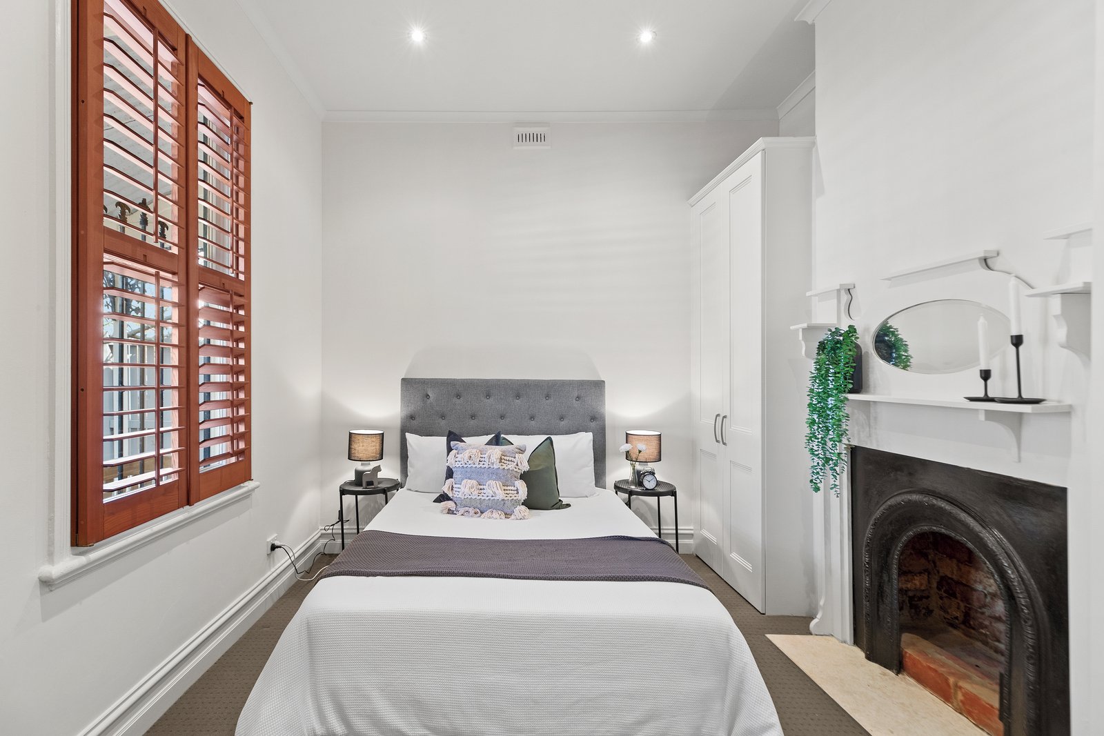 Impressive interior showcases two bedrooms with ornate decorative fireplaces plus a renovated third bedroom/studio at the rear all with built in robes, and a modern central bathroom.