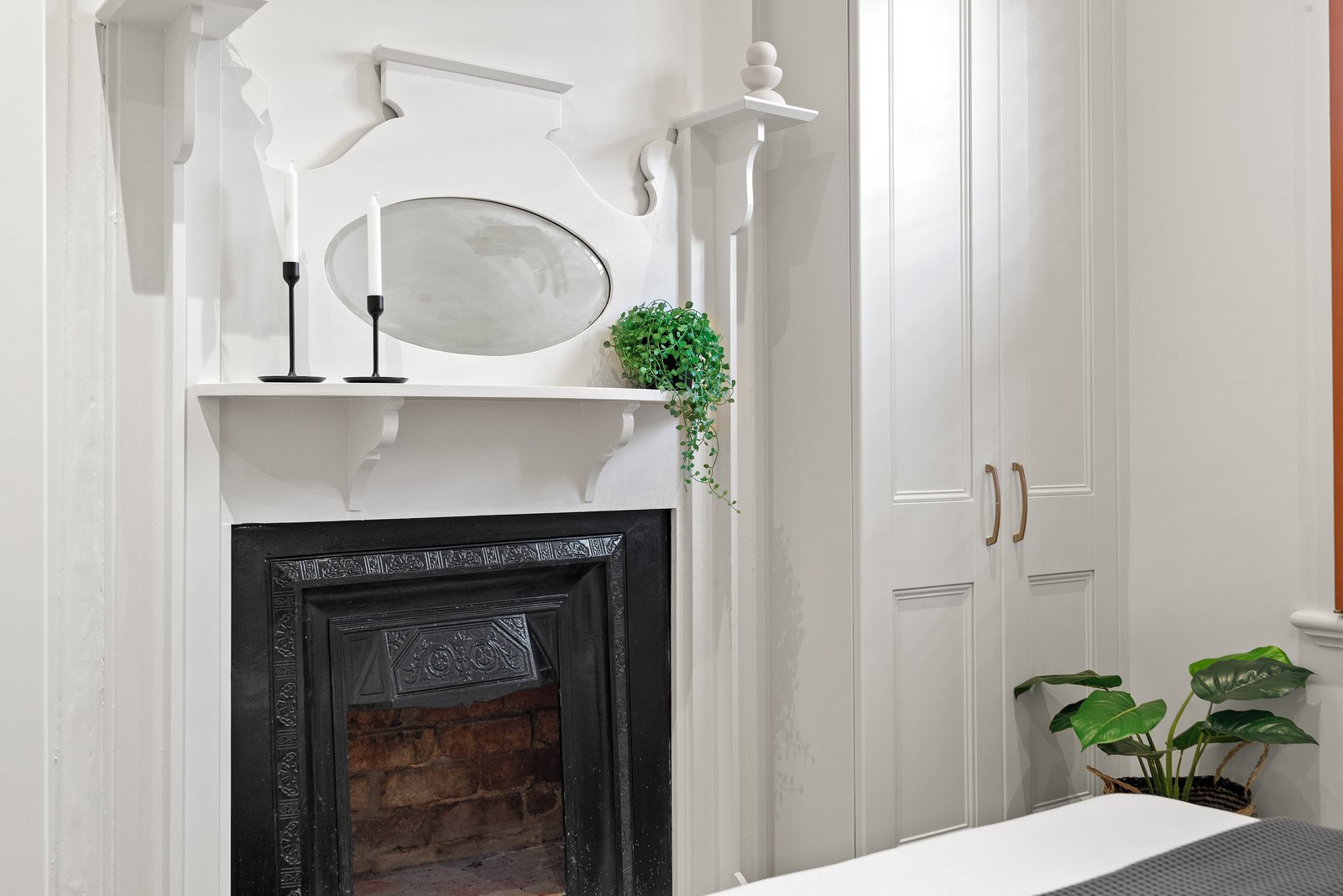 Impressive interior showcases two bedrooms with ornate decorative fireplaces plus a renovated third bedroom/studio at the rear all with...