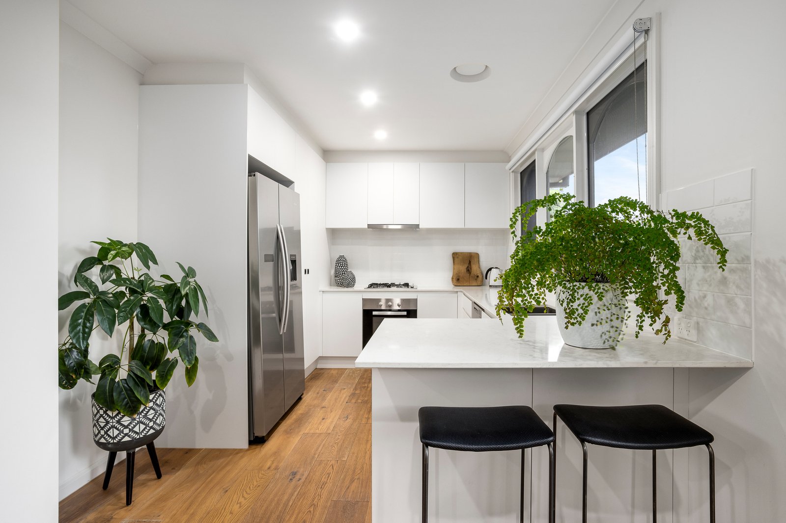 The bright and spacious kitchen features premium stone benchtops and a handy breakfast bar along with quality appliances, a Fisher & Paykel dishdrawer and ample crisp white cabinetry including a double pantry. Upscale finishes extend to a clever combined laundry and main bathroom, featuring subway tiles and a rain shower with display niche. Additional storage and direct garage access via the courtyard further enhance everyday ease.