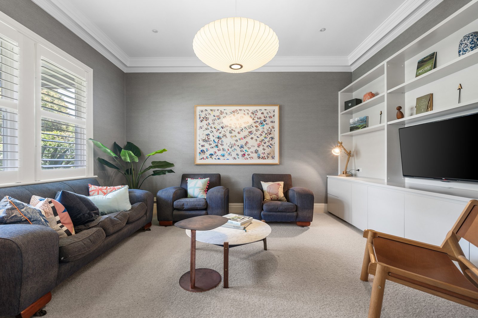 Interiors are finished with natural Scandi-style hardwood floors, plush loop-pile wool carpets, and a refined palette of stone and Corian benchtops. Imported statement lighting highlights the generous ceiling height, while custom joinery features throughout almost every room, incorporating bespoke library shelving, robes and workstation solutions.