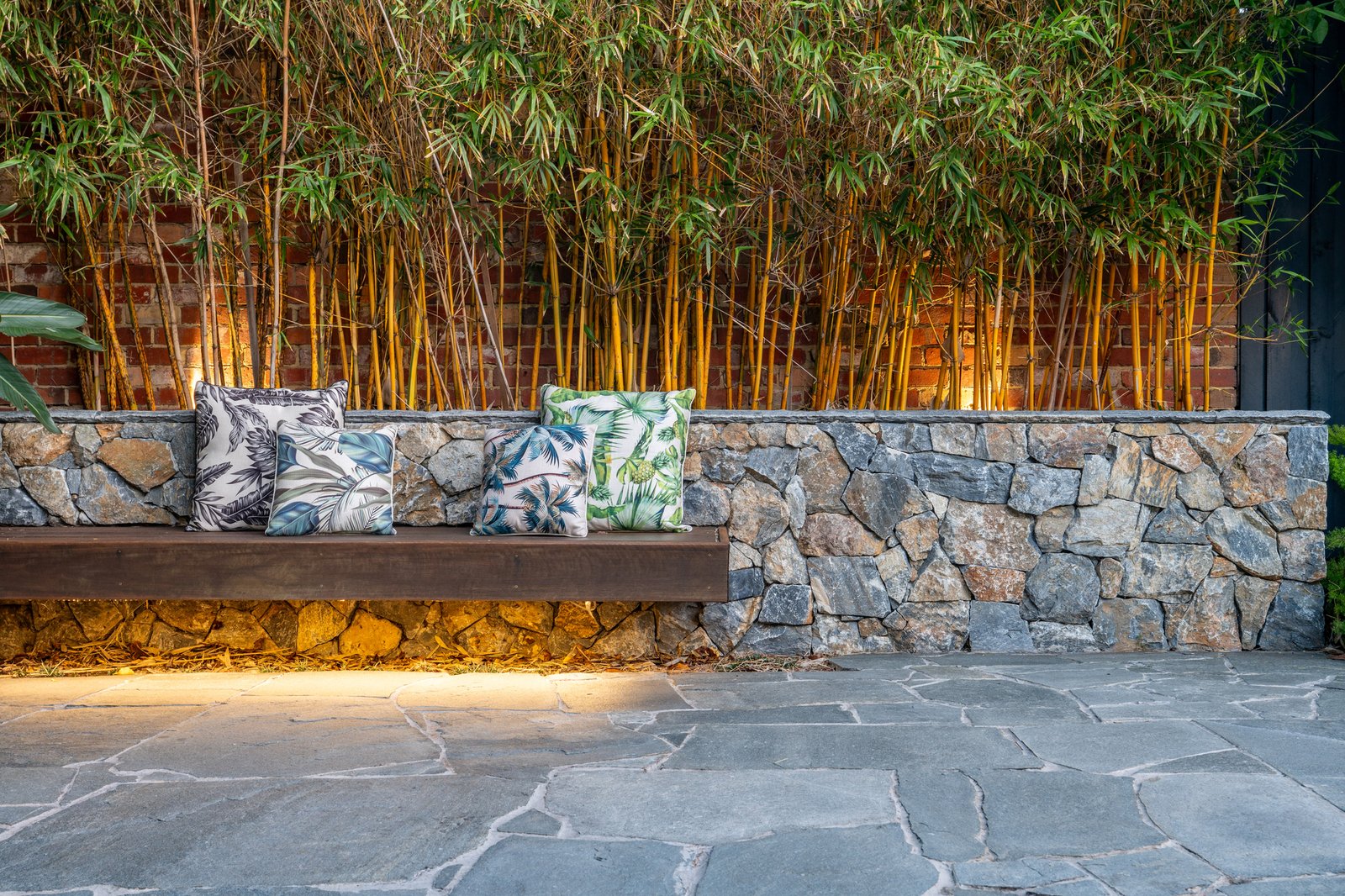 Outdoors, the home is equally impressive. The private rear garden is anchored by Endicott crazy paving, a natural split-stone feature wall and a custom floating bench seat with integrated lighting, creating a striking backdrop for evening entertaining. Mature gardens provides full-height evergreen screening, while a sculptural dragon tree and layered garden lighting complete the calm, resort-style setting. The fully automated swimming pool features dual heating (gas and solar), set within creatively lit landscaped surrounds. Two secure car spaces are provided, including an automatic garage, all behind auto-gated entry.