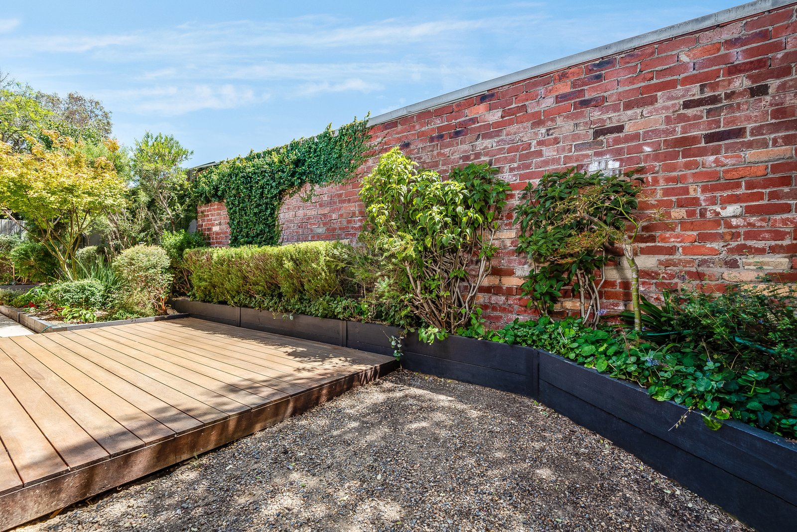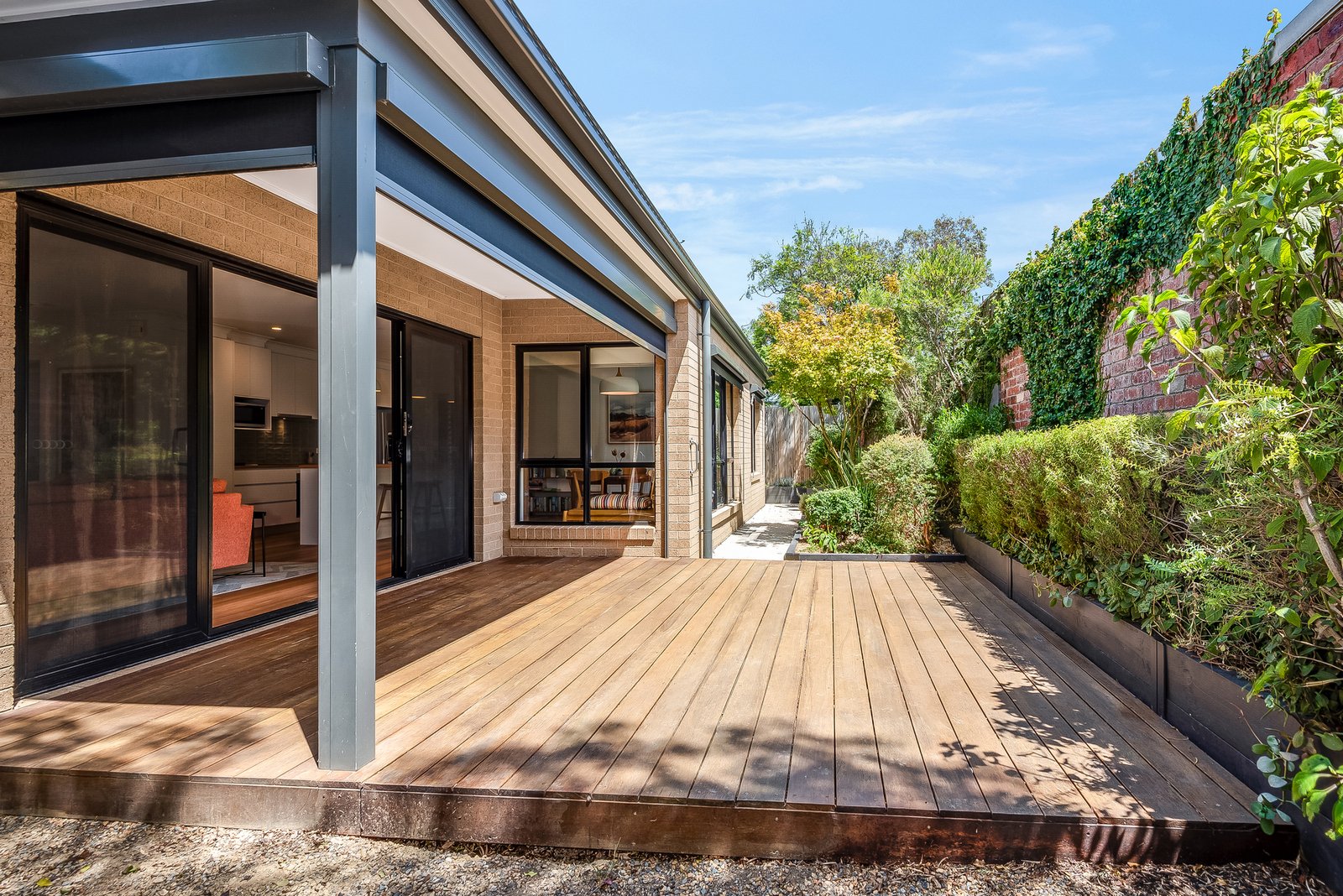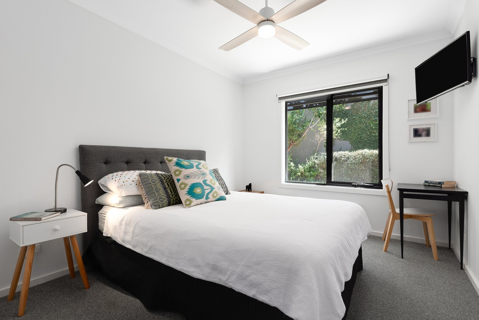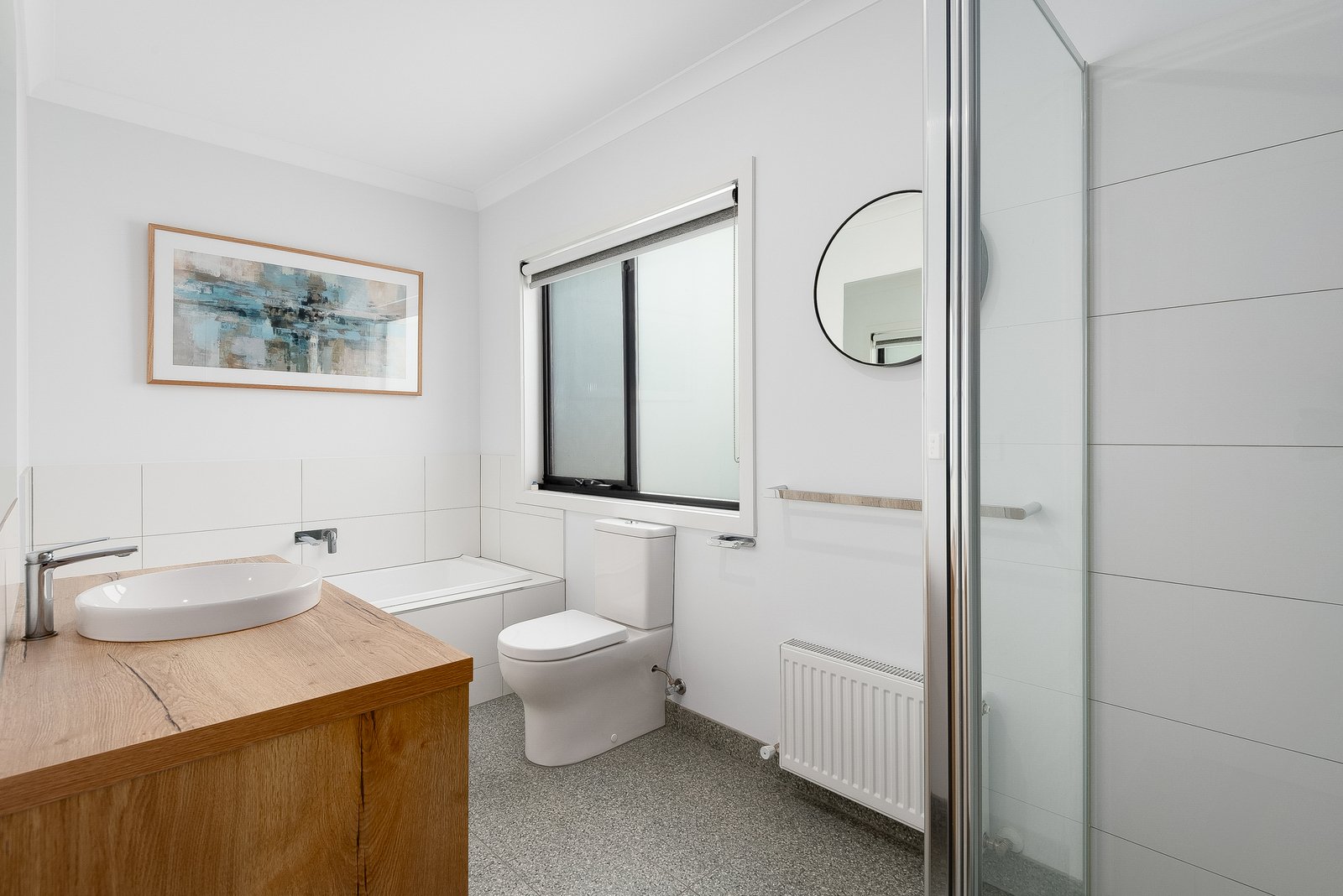The generous main bedroom is positioned off the entry, featuring built-in robes and a tastefully presented ensuite with a frameless glass walk-in shower and skylight. Bedroom two is zoned in a rear wing, also with built-in robes, accompanied by a stylish main bathroom with a bath, separate shower, and timber vanity.