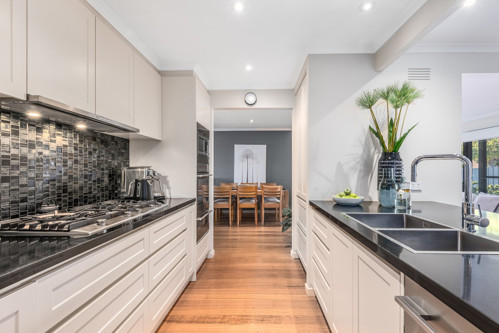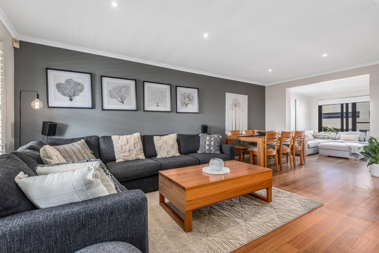 Manicured gardens and a timeless façade introduce the sophisticated theme of the home. Inside, polished timber floors, light neutral interiors, contemporary accents and classic plantation shutters showcase the elevated style throughout. A formal lounge and dining area off the entry provides an ambient entertaining zone, flowing through to the open plan kitchen, dining and living area, perfectly designed for everyday living. The elegant kitchen features waterfall stone benchtops, quality Electrolux cooking appliances including a 900mm gas cooktop, 600mm wall oven, and in-built microwave, a double-drawer Fisher and Paykel dishwasher, double sink, Insinkerator, beautiful mosaic splashback, and generous storage provisions.