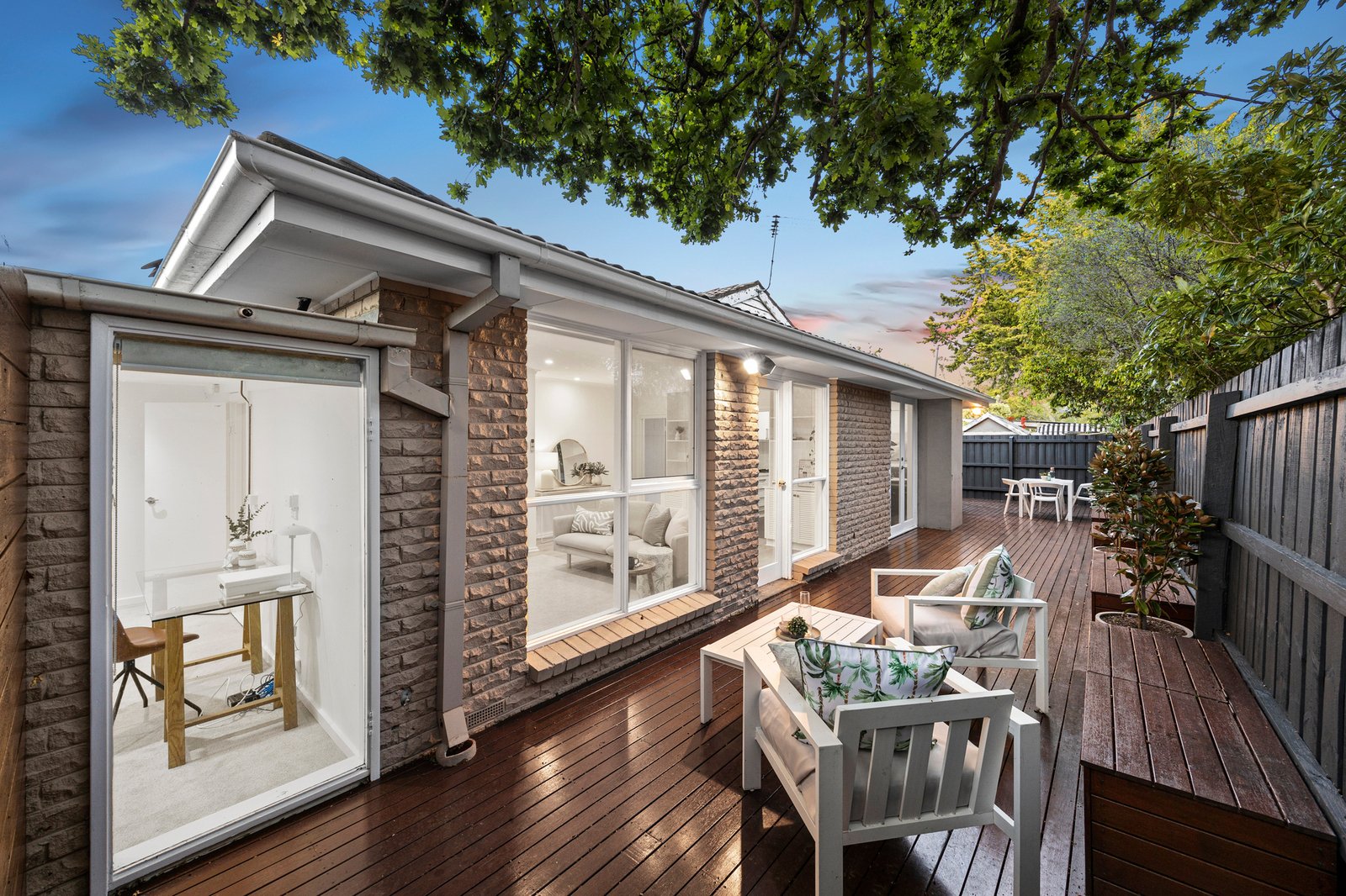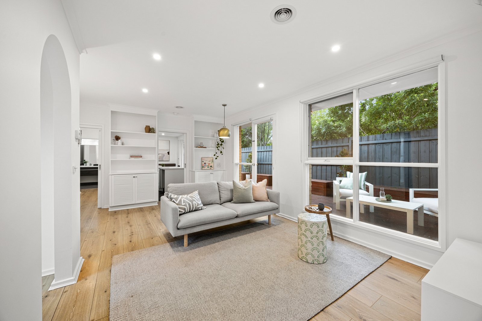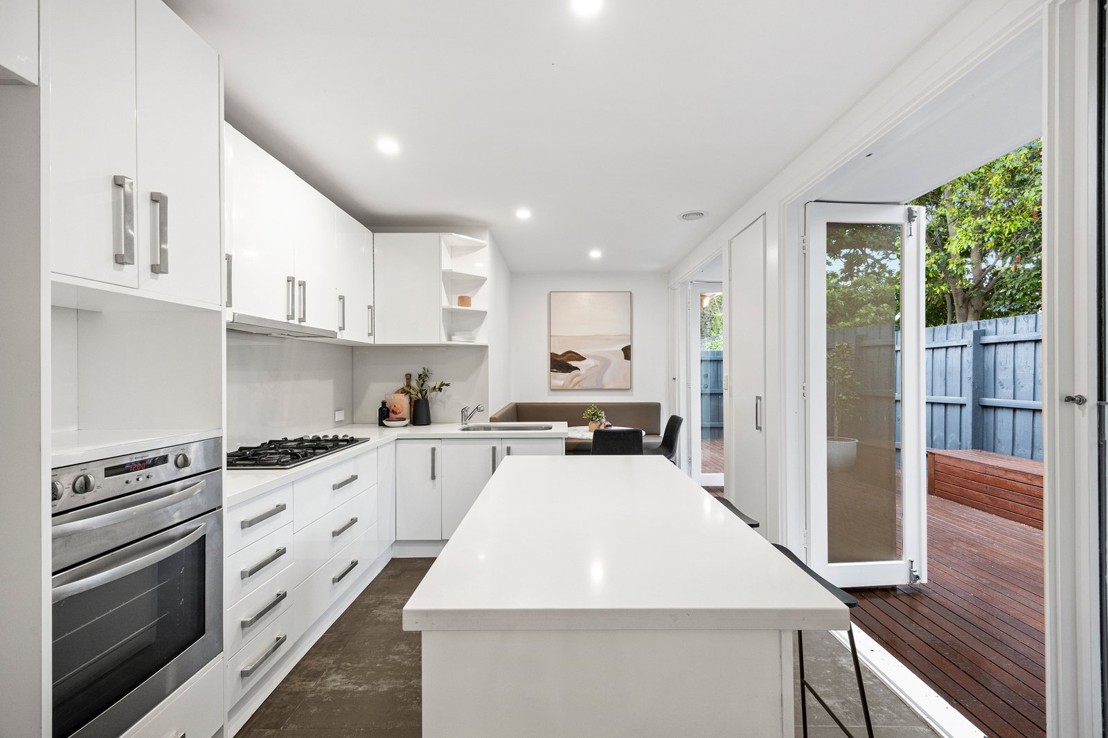 Bathed in natural sunlight, the interiors are framed by generous glazing and multiple sets of French doors that extend effortlessly to a vast alfresco deck—an impressive outdoor retreat with built-in seating and storage, designed for relaxed entertaining and everyday enjoyment.