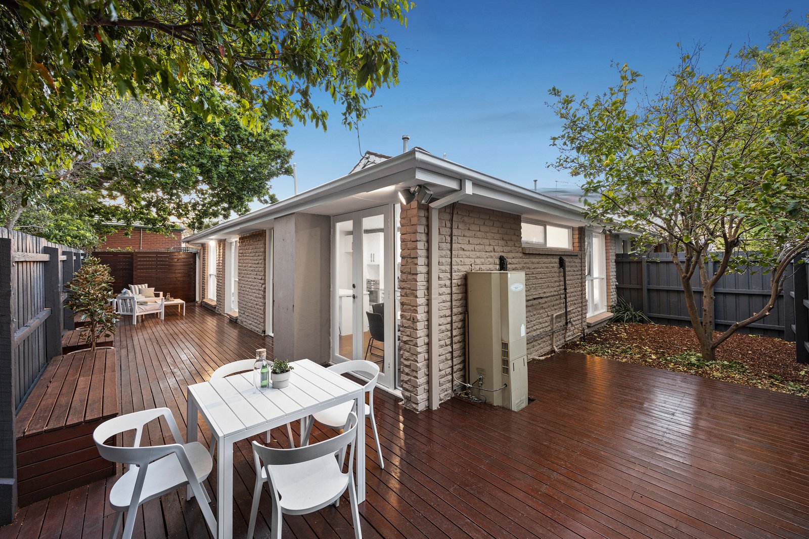 Inside, the spacious living zone offers warmth and refinement with bespoke joinery, wide-board Oak floors, and the comfort of central heating and split-system cooling. The sleek, stone-finished kitchen with glossy white cabinetry, breakfast island, Westinghouse appliances, and Bosch dishwasher seamlessly integrates form and function. An inviting built-in banquette dining area creates the perfect setting for slow mornings or casual gatherings in this beautifully quiet and private home.