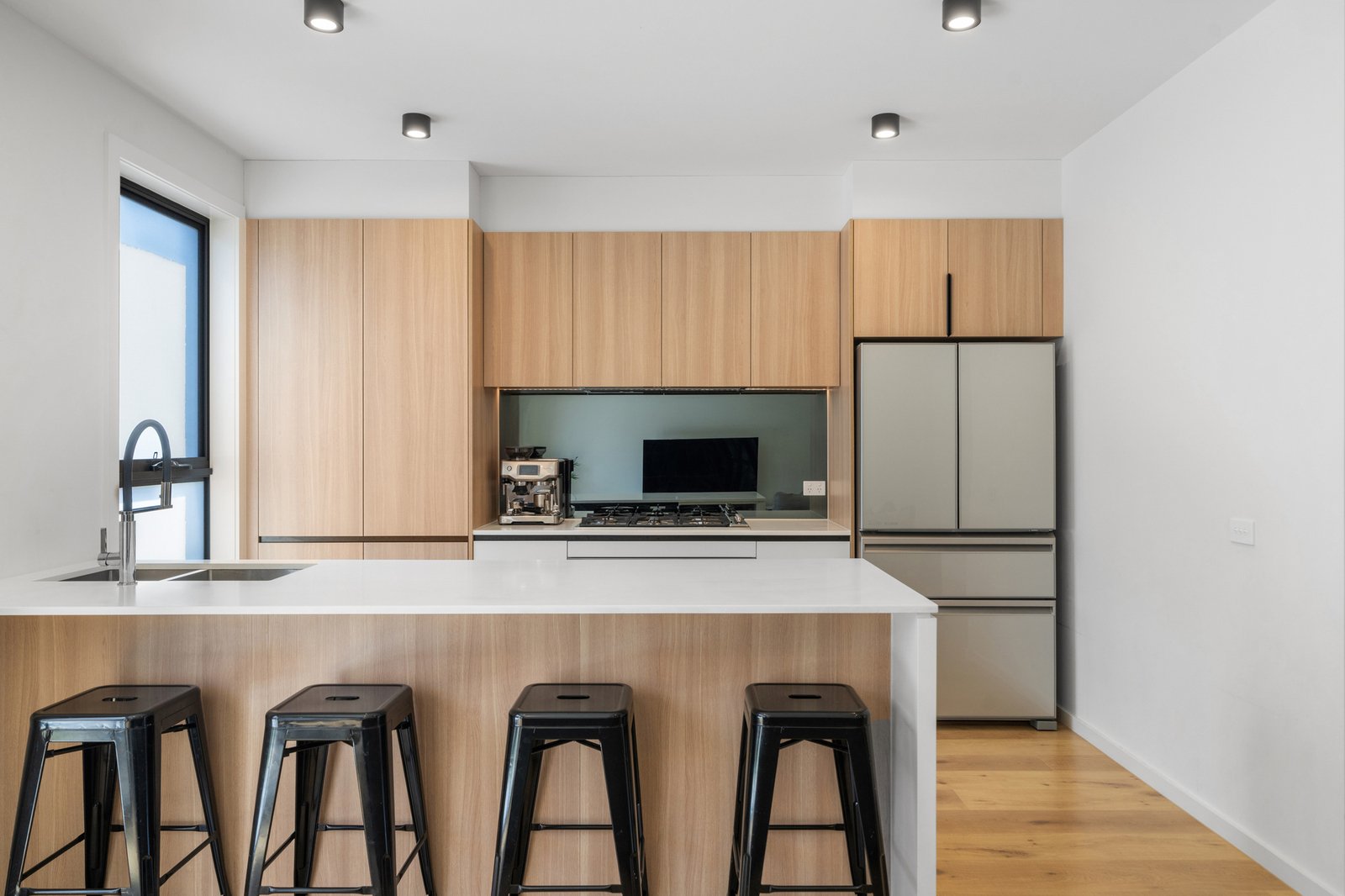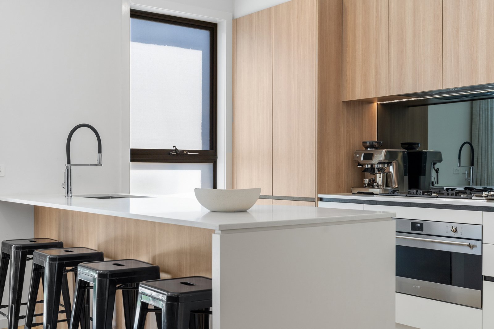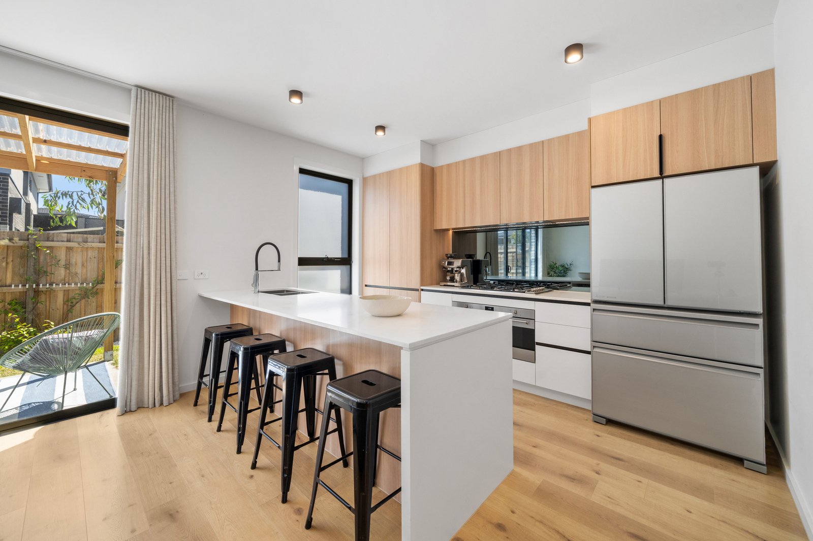 Inside, you’re welcomed by a dining area that sets an inviting tone. Flowing through, the living area offers the perfect setting for everyday comfort and relaxed gatherings. The kitchen impresses with a Smeg 900mm oven and stove, dishwasher, and stone benchtops, creating an ideal space for home cooks and entertainers alike.