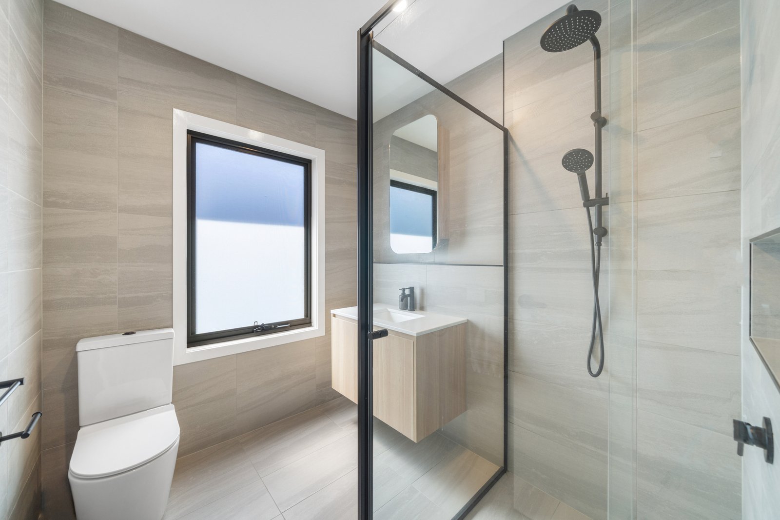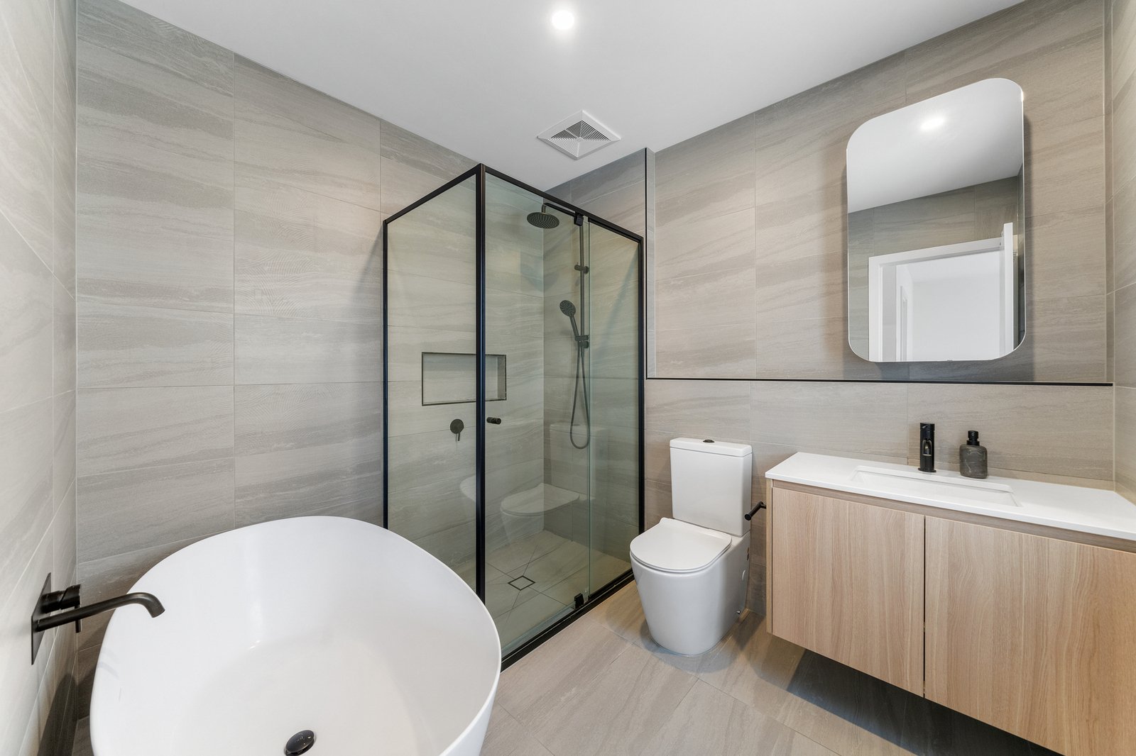 Upstairs, the master bedroom offers a peaceful retreat, complete with a walk in robe and a beautifully finished ensuite featuring floor to ceiling tiles and a relaxing bathtub. Two additional bedrooms with built in robes are serviced by a central bathroom, also finished with floor to ceiling tiles for a touch of luxury.