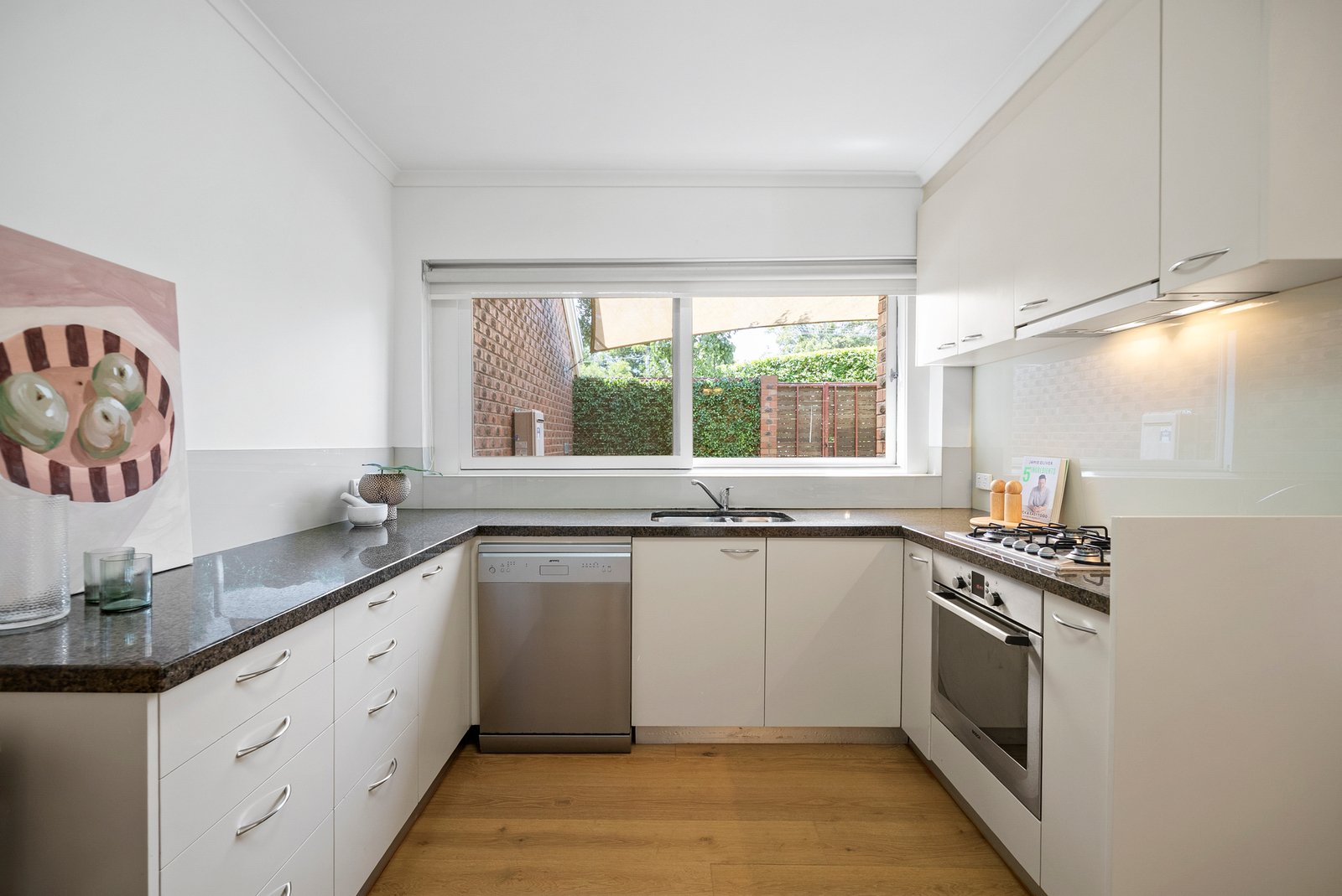 The sleek kitchen is appointed with granite benchtops, Bosch appliances including a 4-burner gas cooktop and oven, a Smeg dishwasher and generous storage, and effortlessly connects to the dining area.