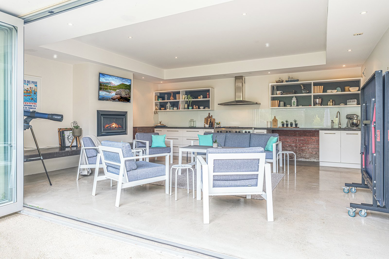 The hub of the home is located to the rear with high vaulted ceilings embracing the natural light that oozes through the double stacker doors. The spacious kitchen is an entertainers delight that is sure to impress the fussiest of chefs with an oversized island bench, integrated stove, dishwasher plus an abundance of cupboards, drawers and storage. The open plan dining and living are positioned to embrace the low maintenance outdoor entertaining area complete with synthetic grassed area and a second enclosed living room which offers a complete outdoor chef's gourmet kitchen. This includes a hot plates and gas burners, deep fryer, kitchen sink, polished concrete flooring and a gas log fire - making this the ultimate relaxed entertaining space year round.